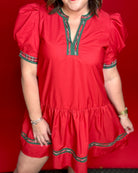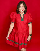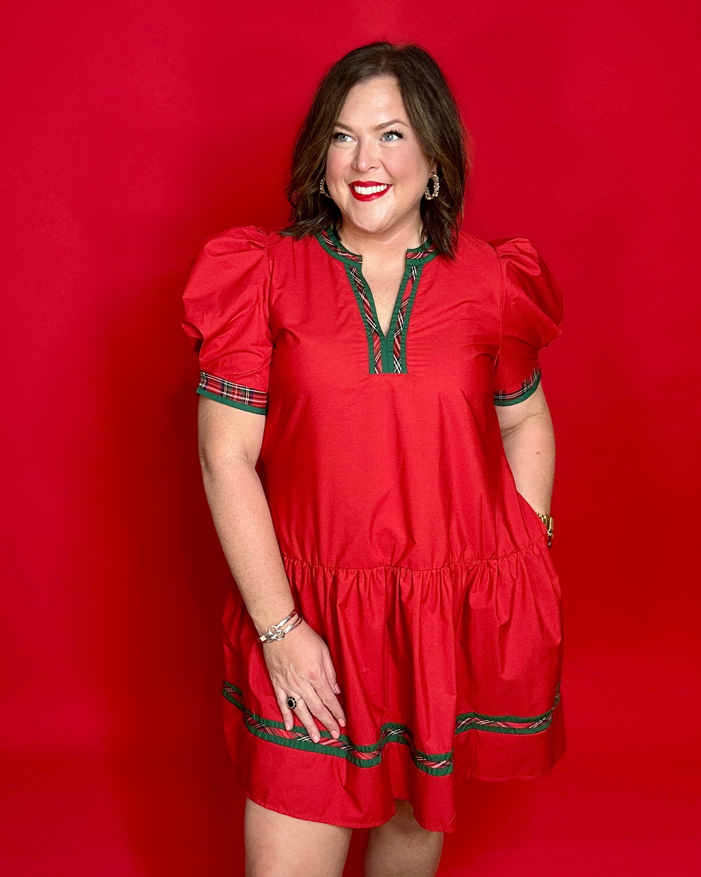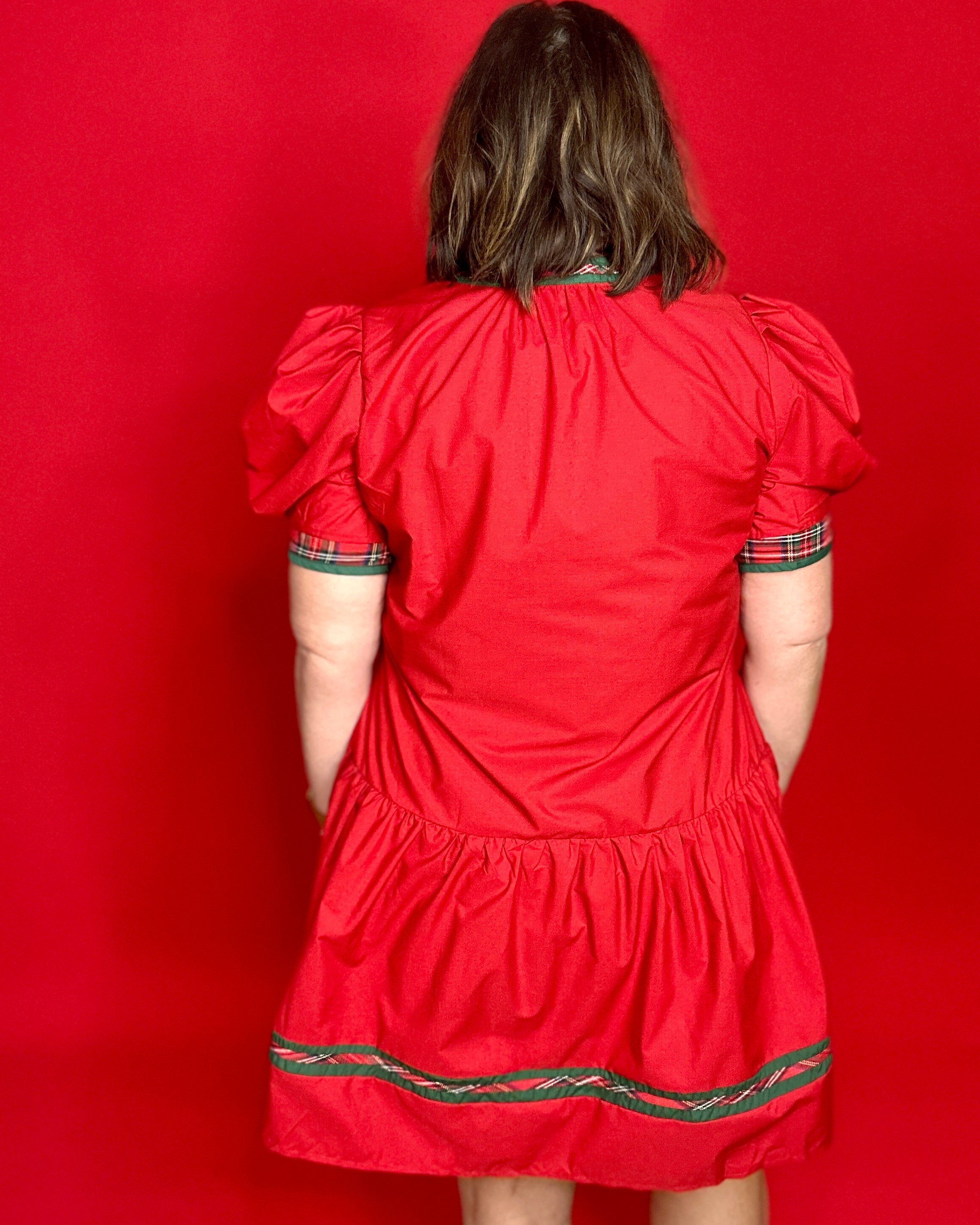 This lightweight woven mini dress offers a refined silhouette with its puff sleeves and subtle plaid trim at the neckline, cuffs, and hem. Fully lined and non-sheer, it ensures a comfortable and polished look. Practical side pockets add functionality without compromising style, making it an expertly crafted piece suitable for versatile occasions.