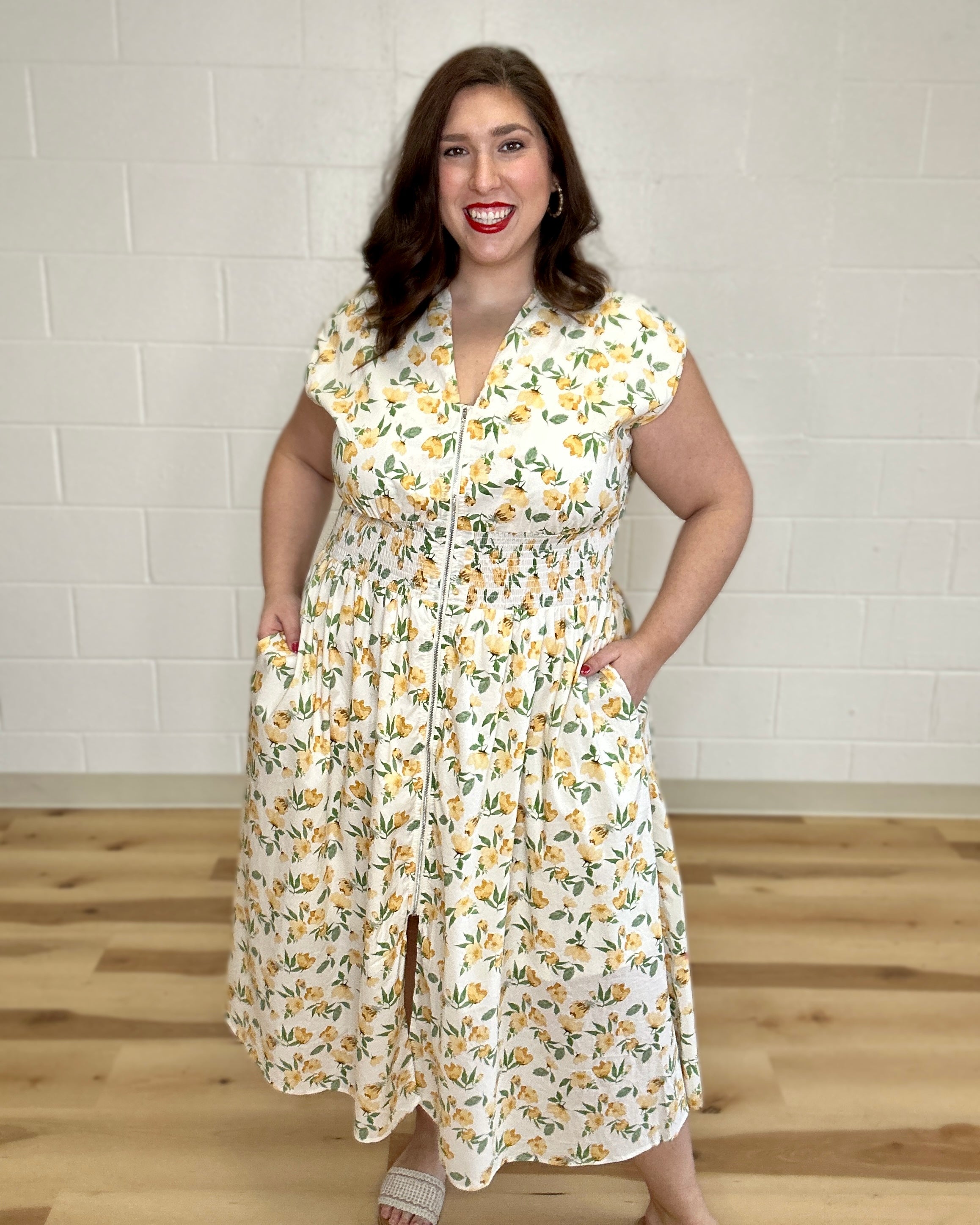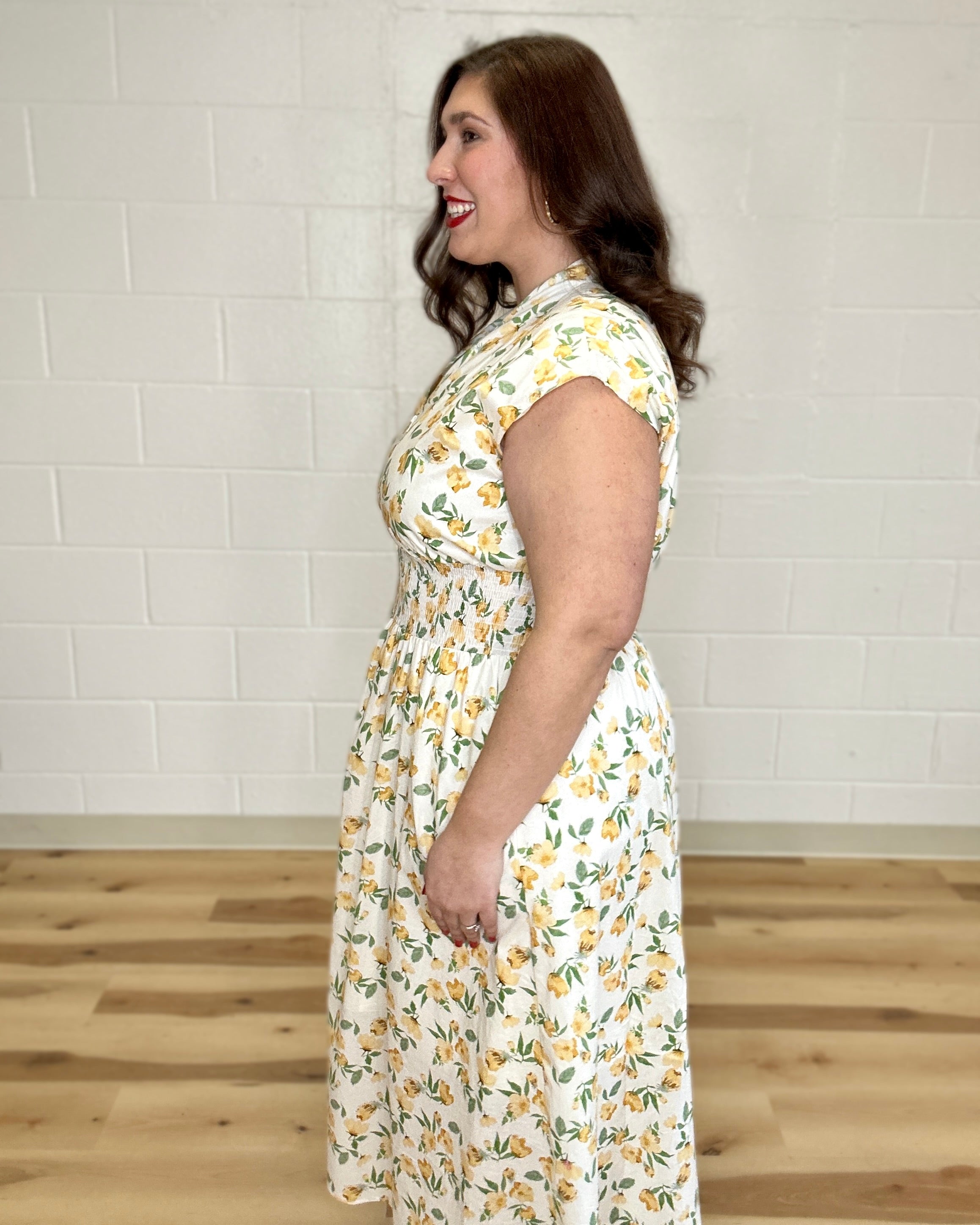 Yellow Floral Smock Waist Midi Dress