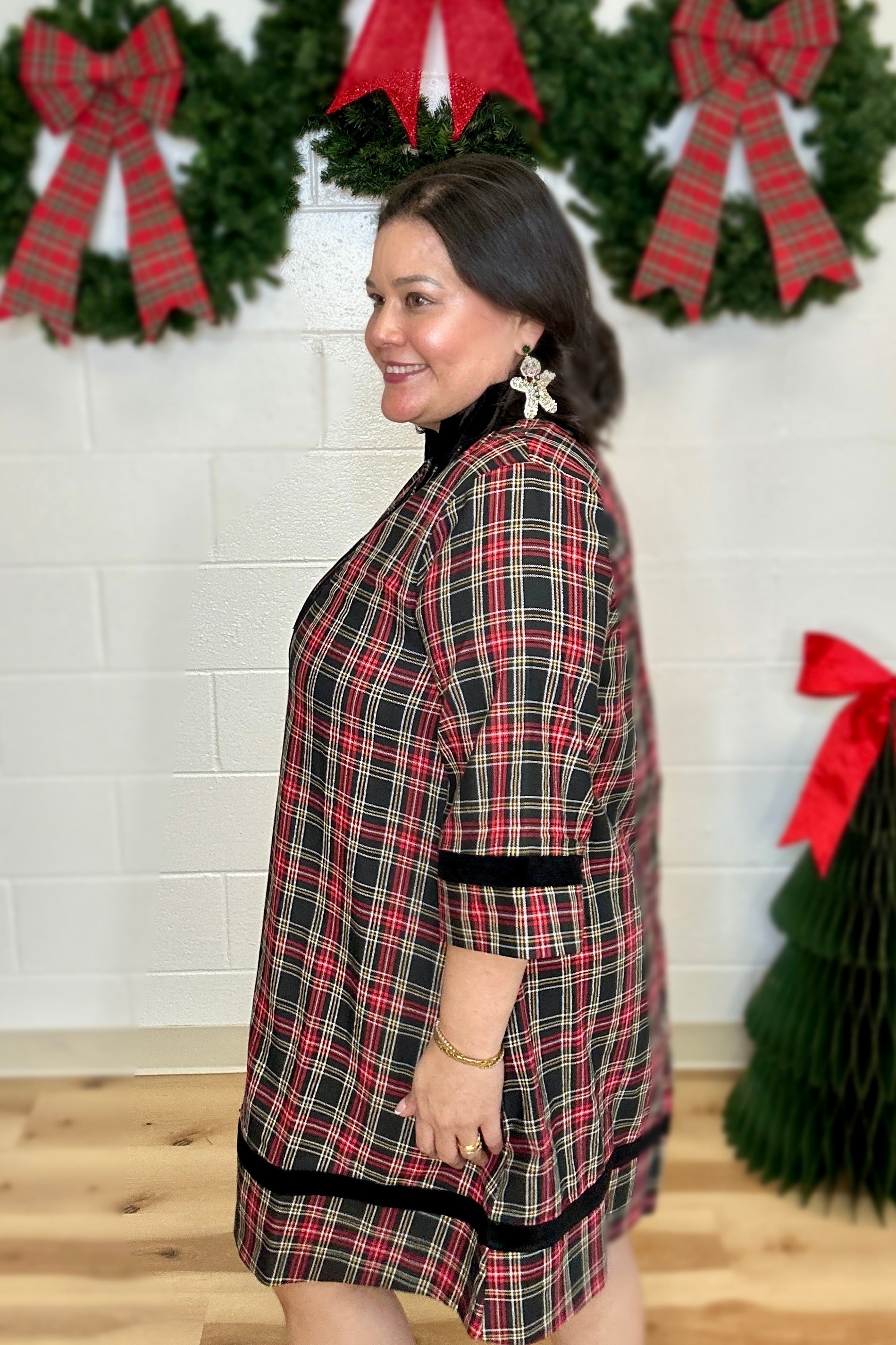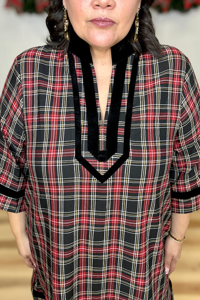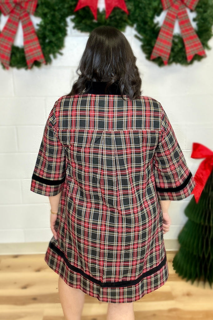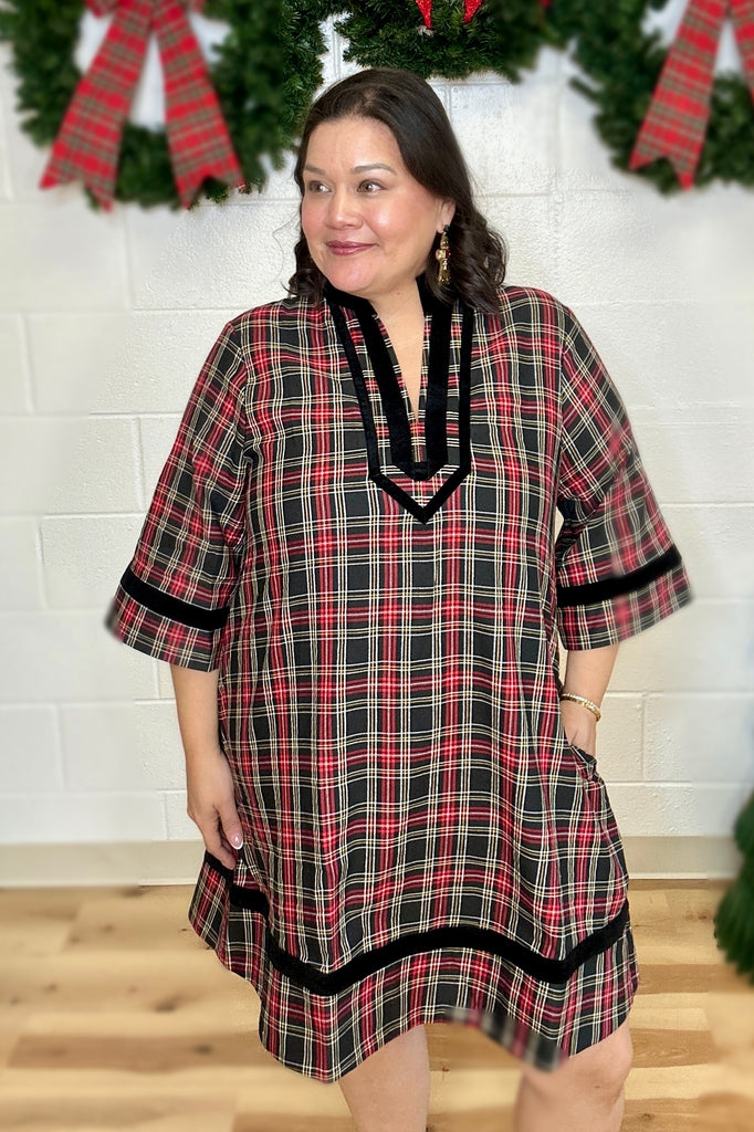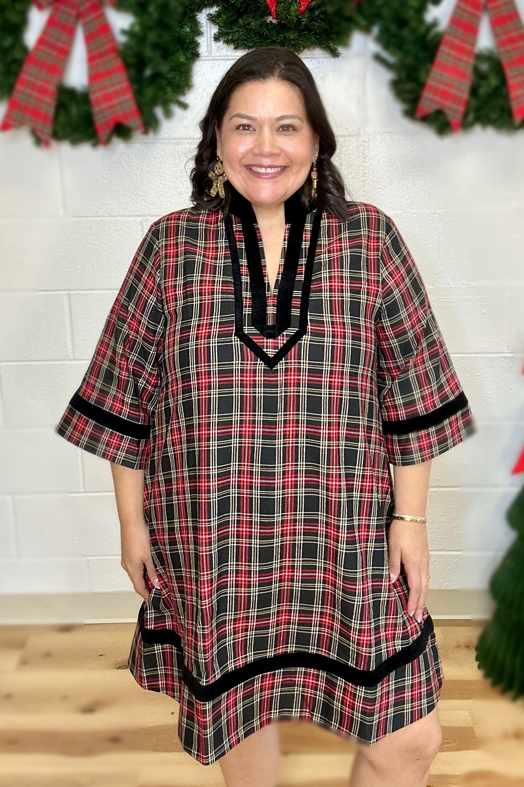 Black Plaid 3/4 Sleeve Velvet Trim Dress