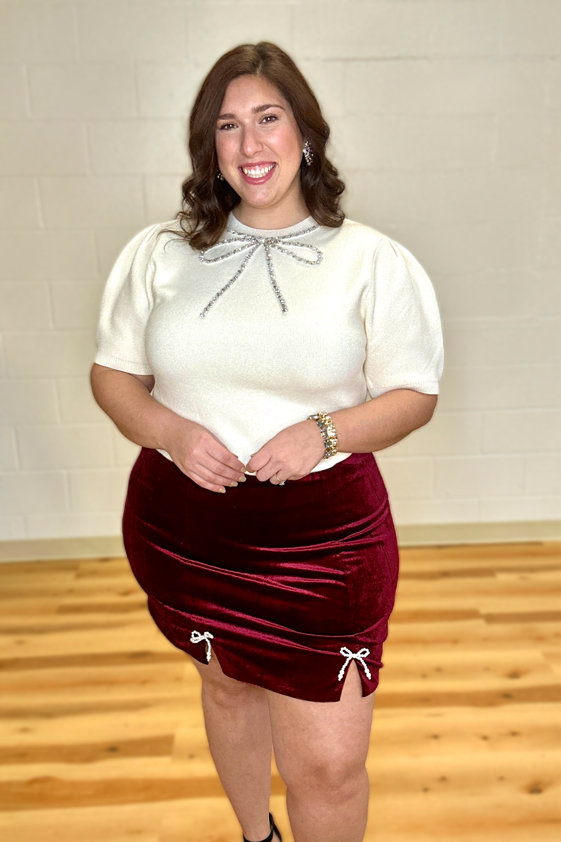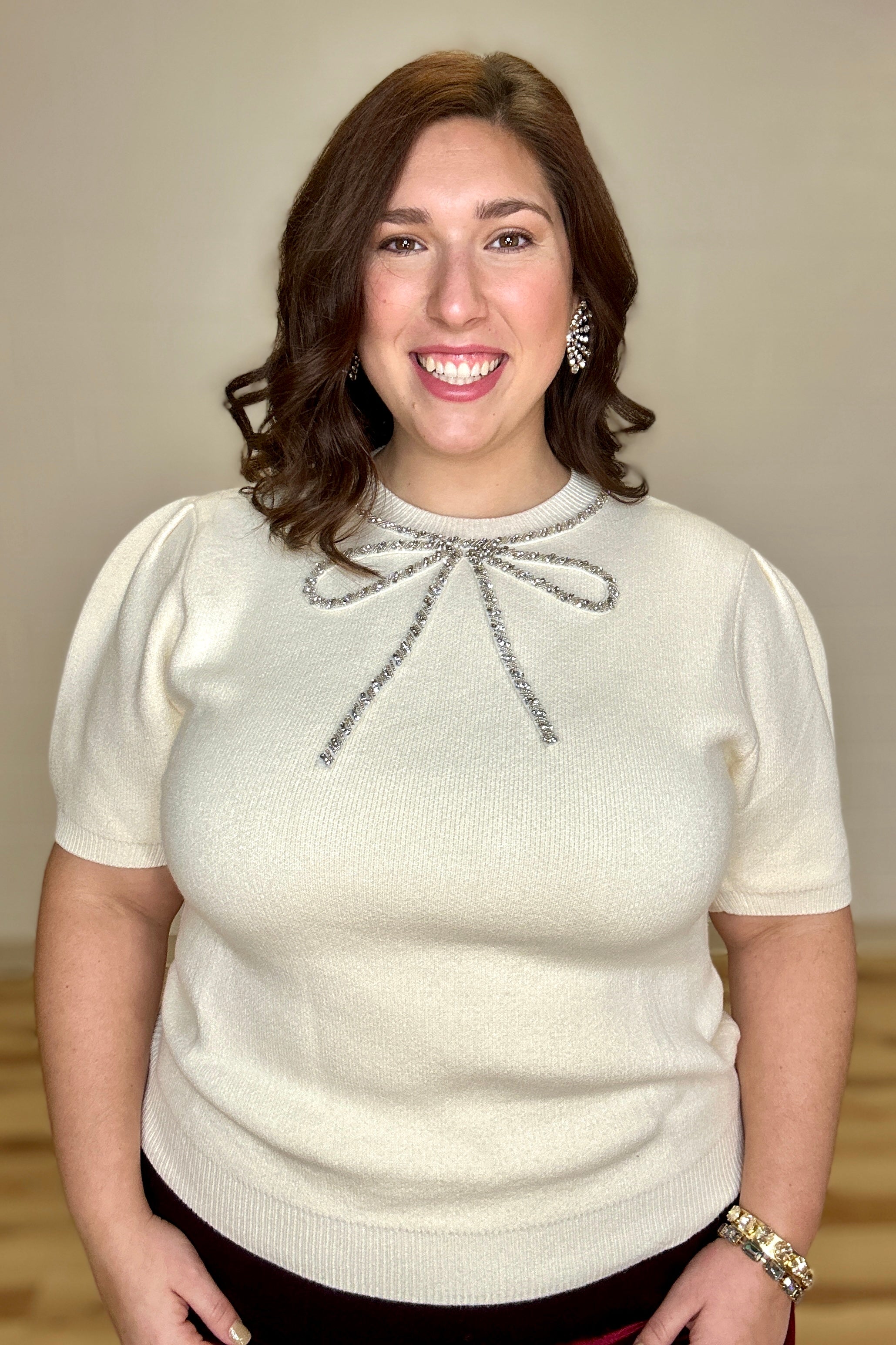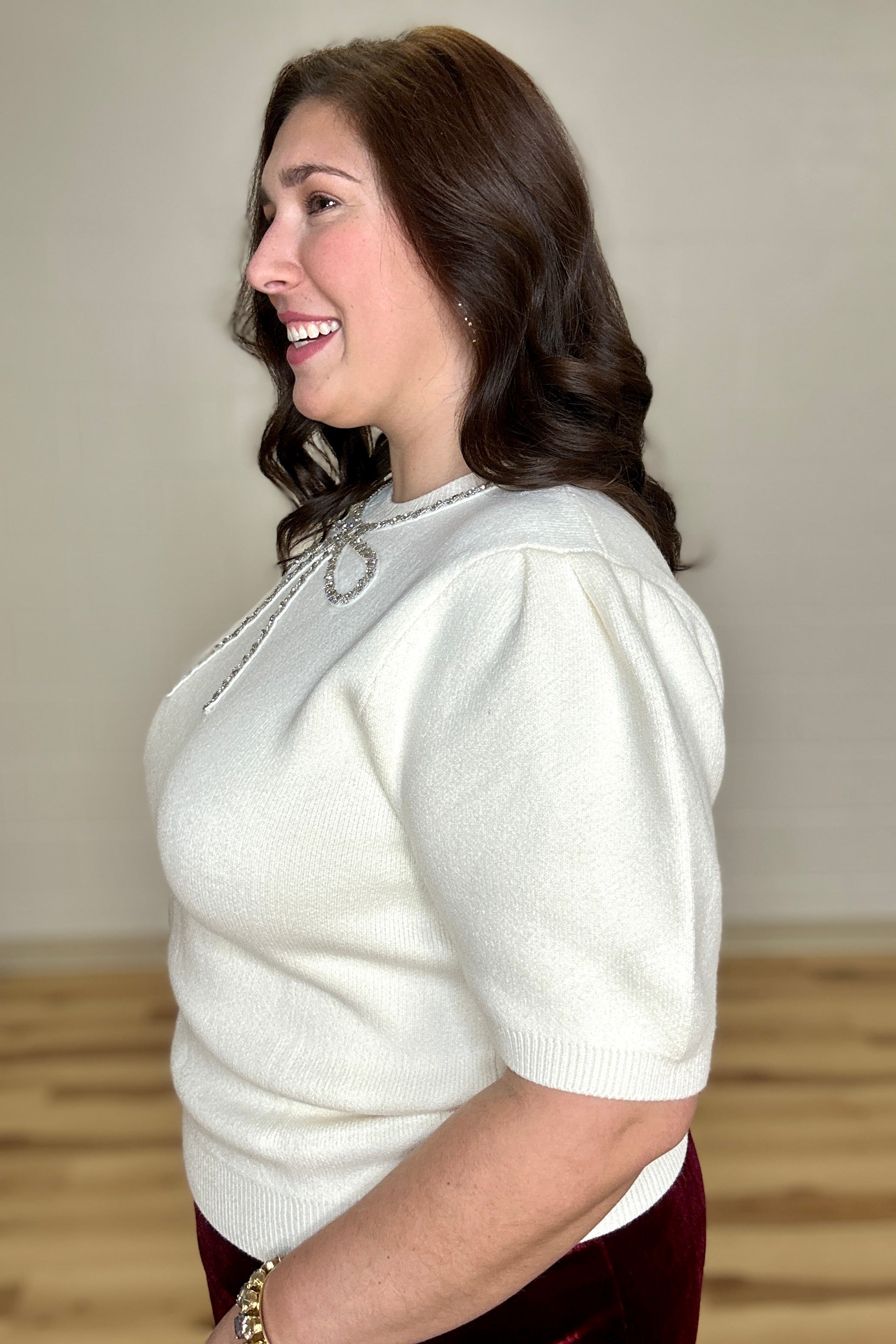 Cream Sparkle Bow Puff Sleeve Knit Top
