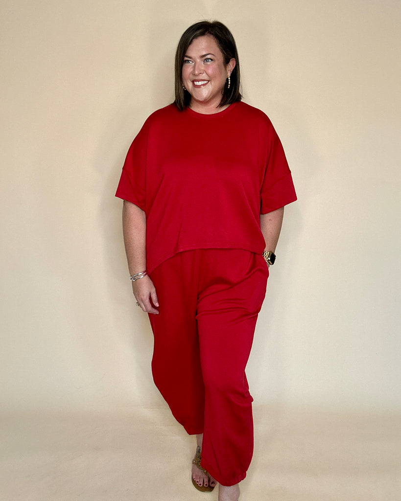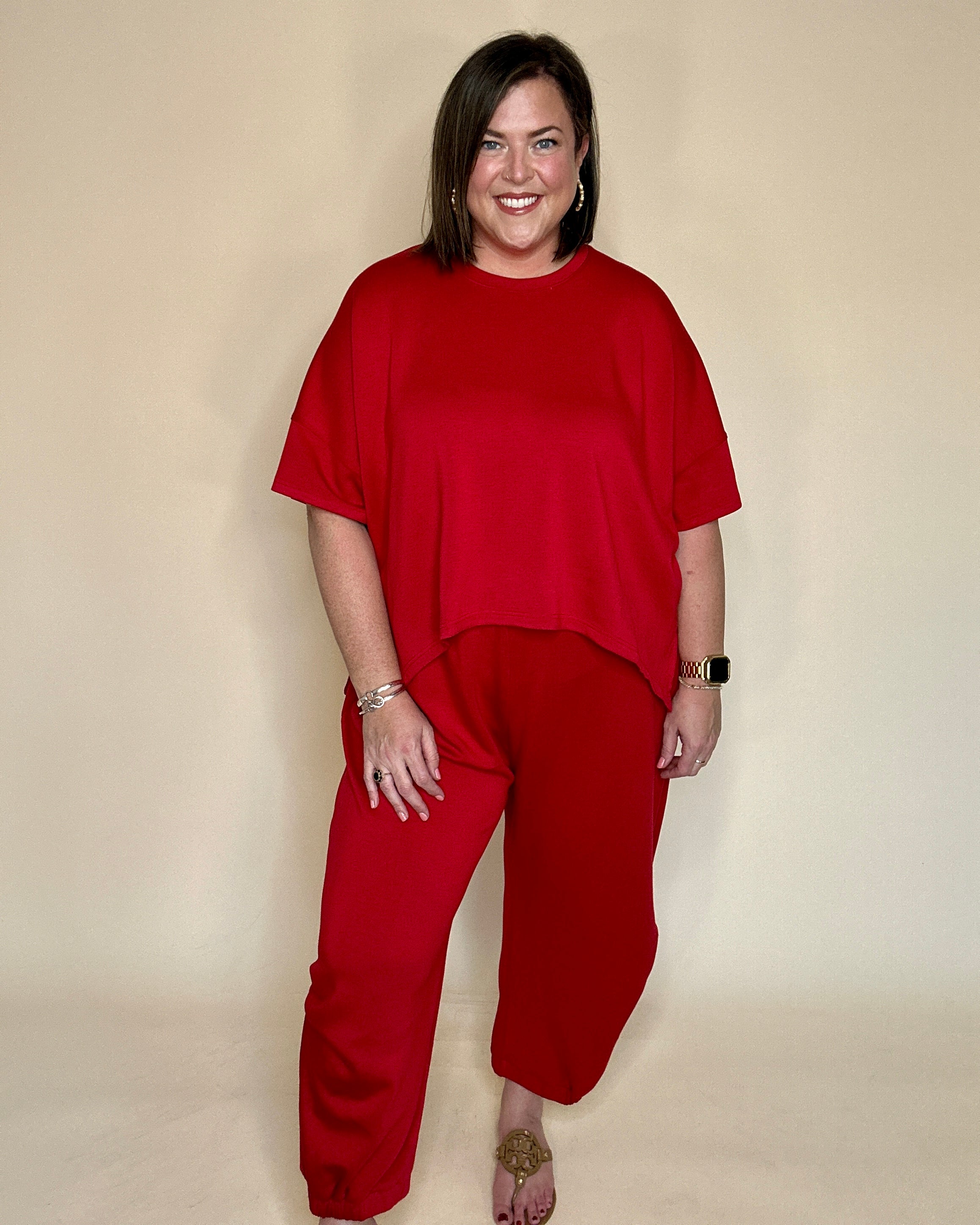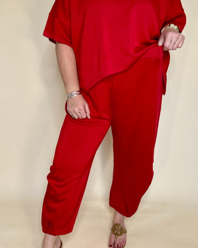 Experience effortless comfort and style with this Davi&Dani set featuring a solid round neck, dropped shoulder boxy fit top paired with jogger-style pants that have an elastic waist and banded hem. The oversized top offers breathable movement while the pants provide relaxed wearability, making this ensemble perfect for both casual outings and laid-back days. Crafted to balance comfort with modern design, it’s an ideal choice for those seeking versatile wardrobe staples.