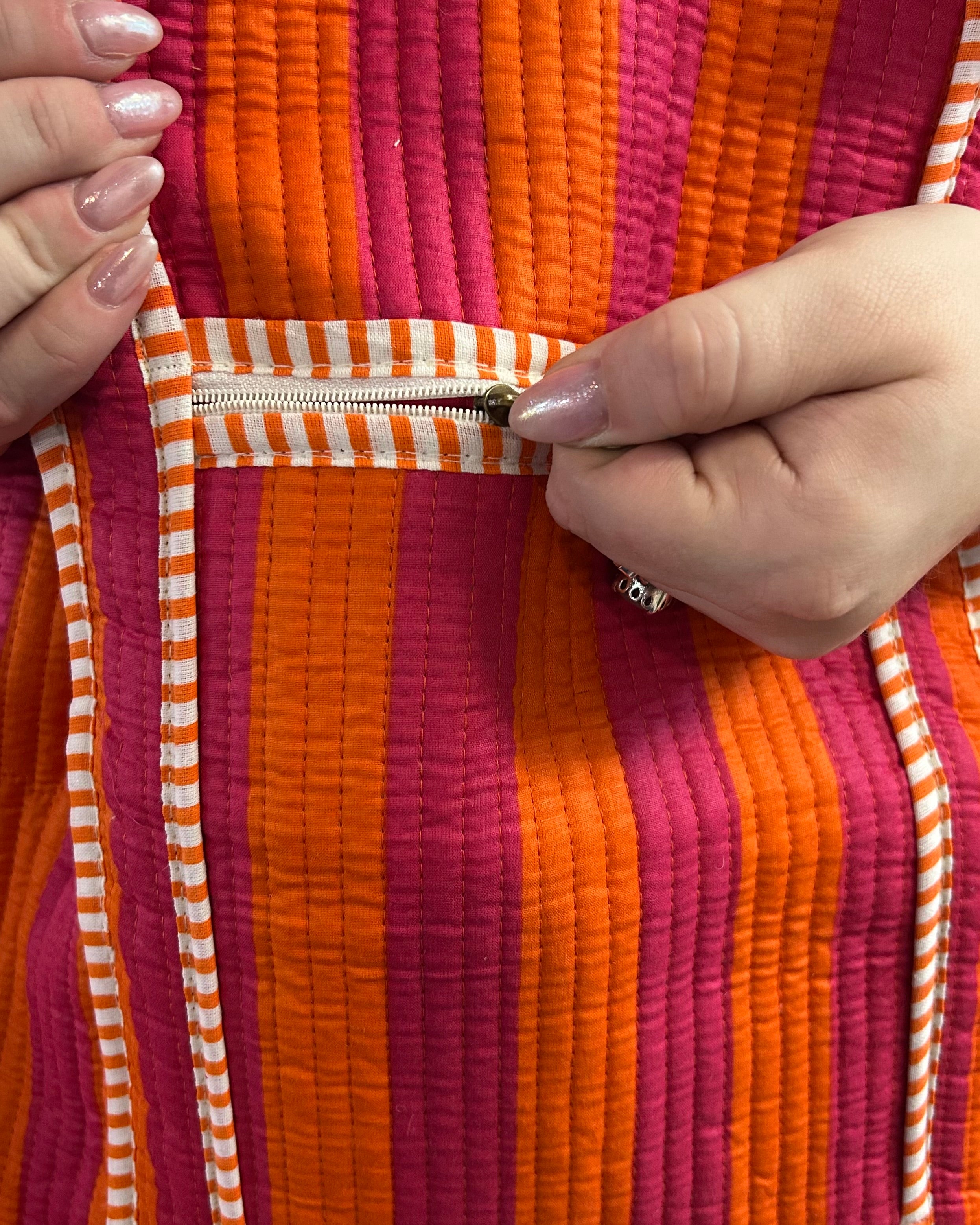 Turn heads with this eye-catching Fuchsia & Orange Stripe Quilted Tote Bag. With spacious 17.5" x 7" x 14.5" proportions, it holds all your daily essentials comfortably. The bold color-blocked stripes inject energy and personality into your look, while the reliable zipper closure keeps your items protected and organized. Thoughtfully constructed for lasting quality, this statement tote handles everything from work commutes to weekend adventures with ease. Perfect for anyone seeking a functional accessory that doesn't compromise on style.