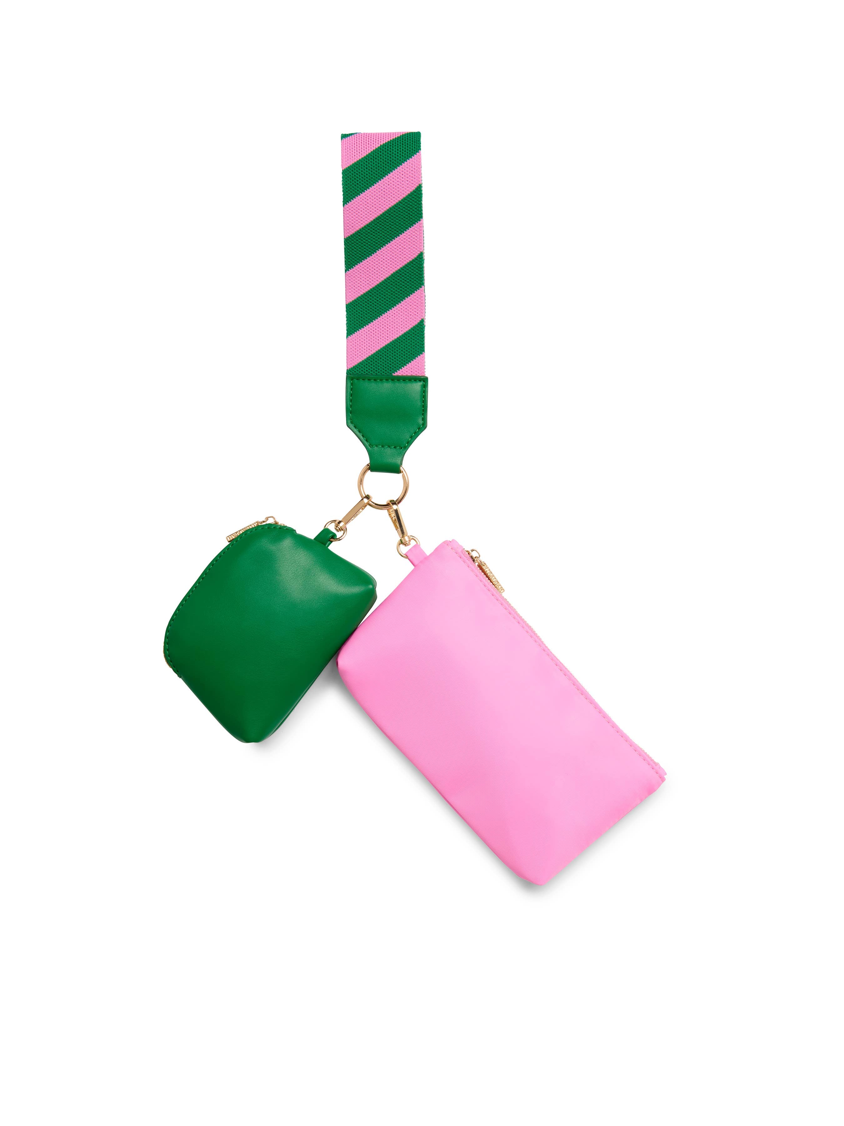 Meet the Starlet Mini Wristlet—your new sidekick for hands-free fun with maximum flair. Featuring two interchangeable pouches in bold color combos, this playful wristlet lets you mix and match to suit your vibe. The wide, striped strap slips easily over your wrist, while the zippered pouches keep your phone, cards, and gloss close by. Whether you’re running errands or dancing your way through the weekend, this little bag is big on personality.
