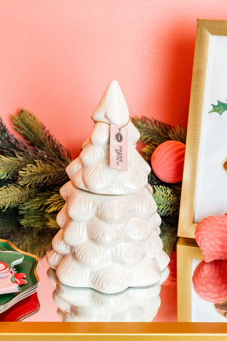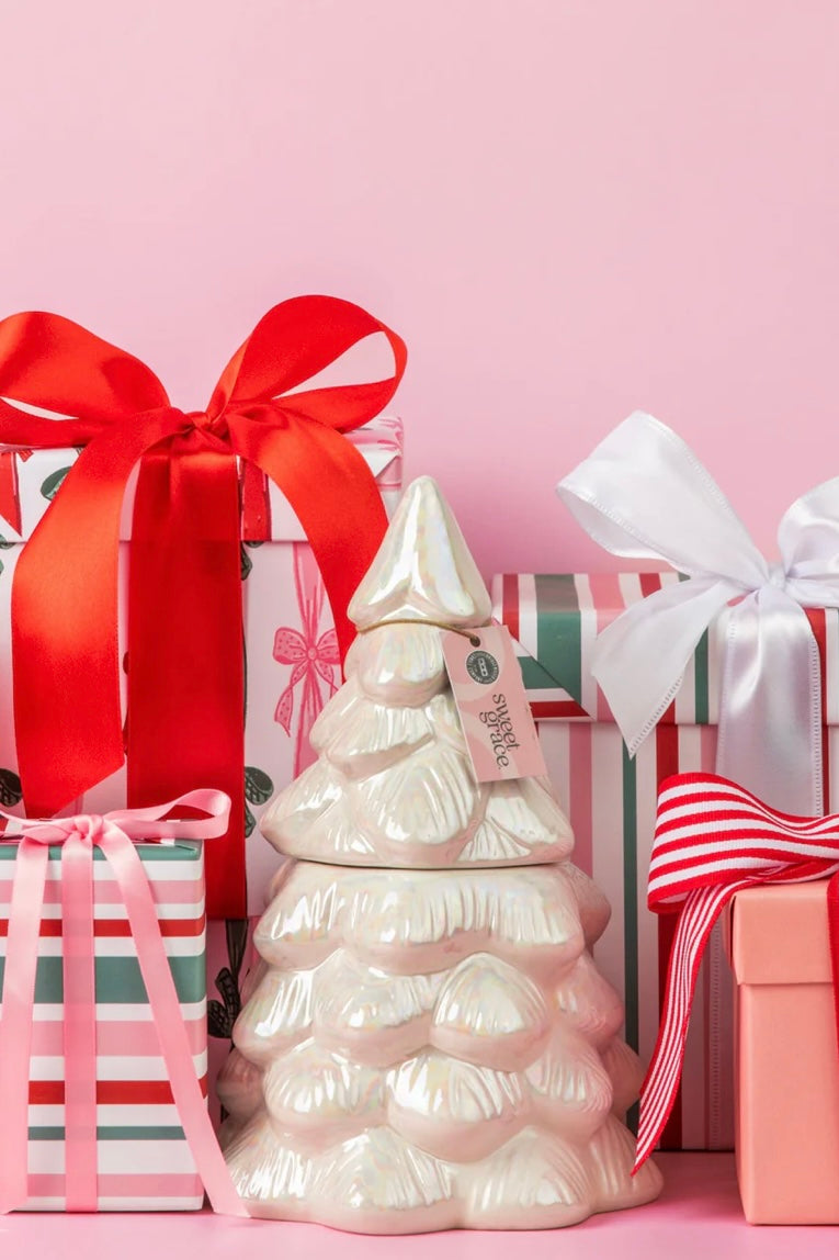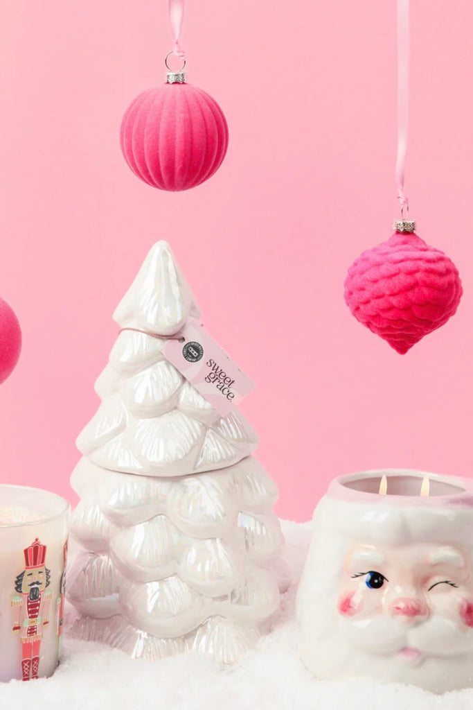 Bring a touch of holiday magic to your space with this iridescent ceramic Christmas tree candle! The removable top reveals a delightful candle scented with Sweet Grace, filling your room with a warm, inviting fragrance. More than just charming decor, it’s a functional piece that brightens your home and spirit. Perfect for cozy winter nights or as a festive gift!