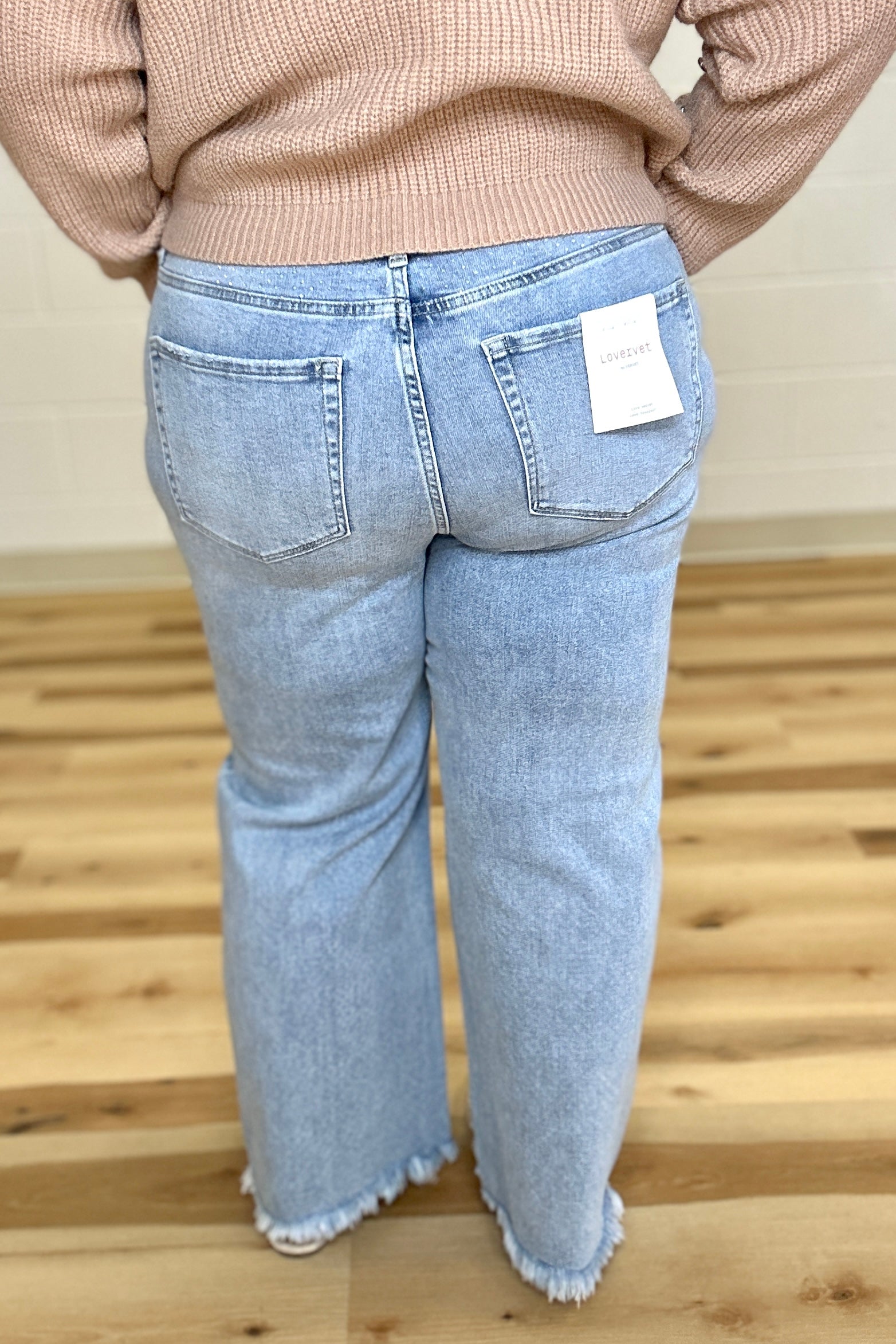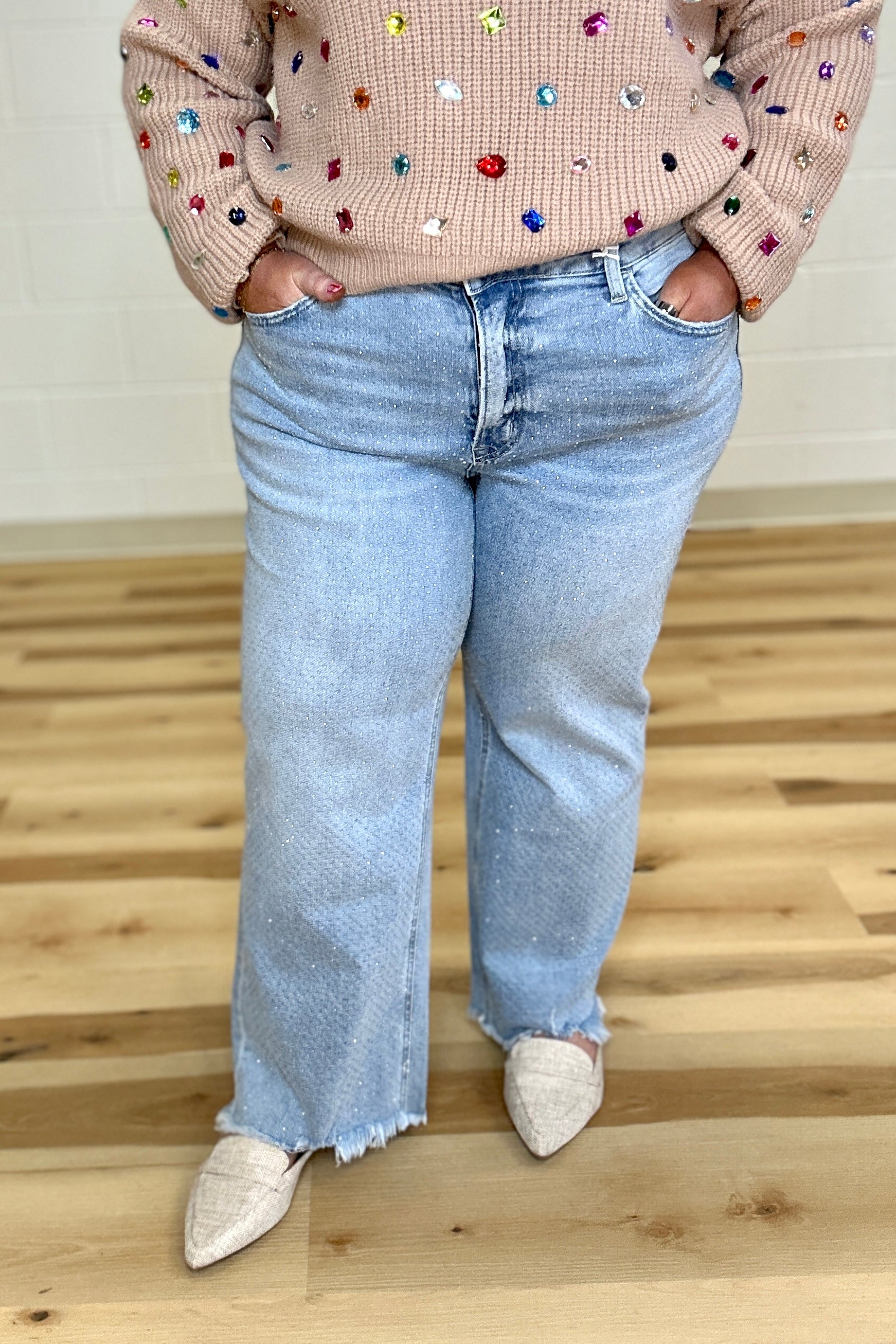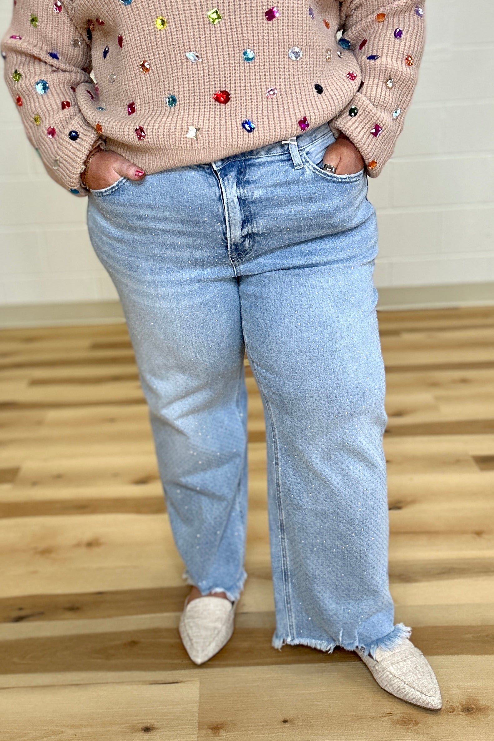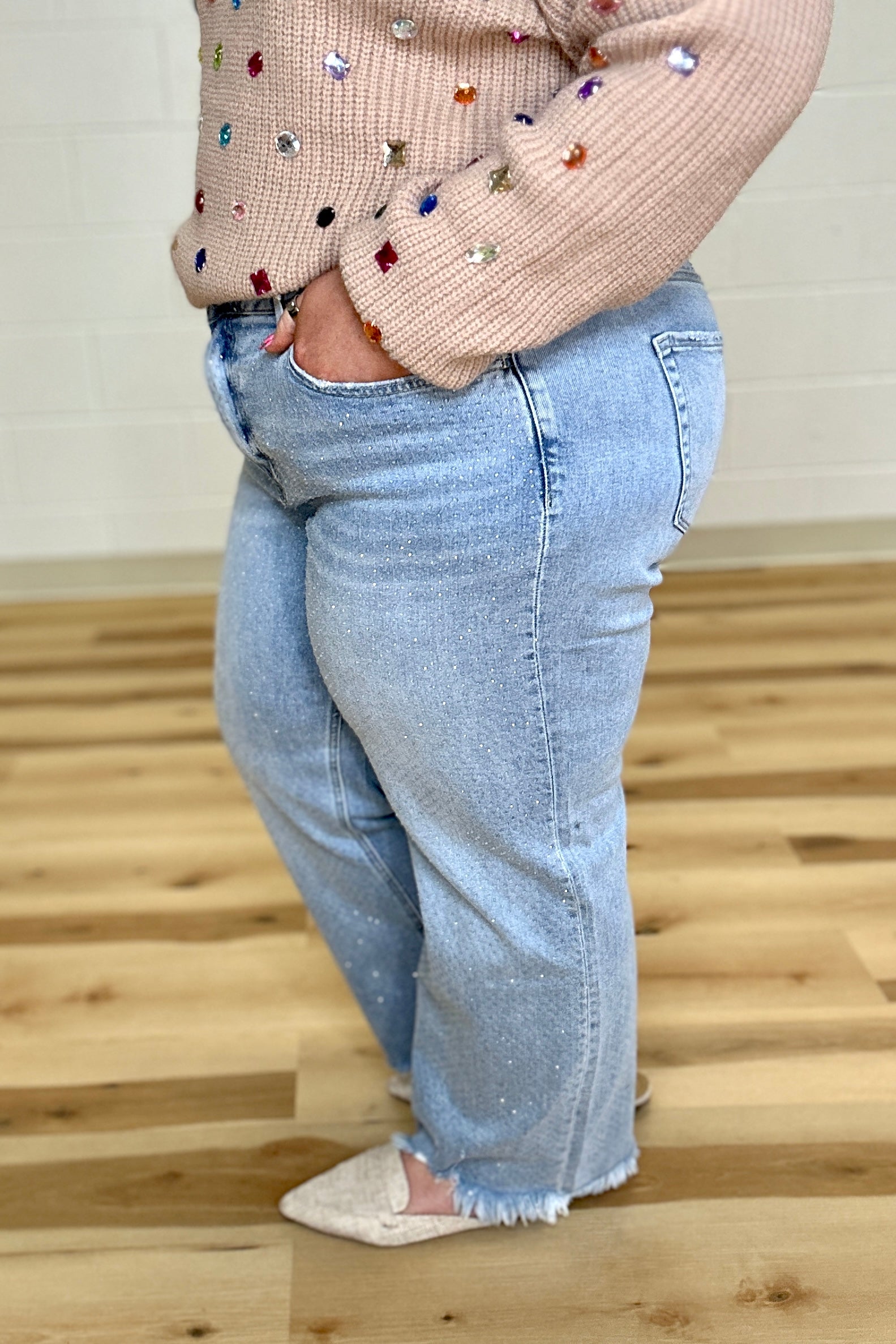 Step out in style with the Vervet High Rise Rhinestone Wide Leg Jeans. These ankle-length, wide-leg jeans feature a comfortable stretch denim and a flattering 10 1/2" high-rise waist. Sparkling rhinestone embellishments add a playful touch, while the frayed hem gives a trendy edge. Crafted with care, each pair is hand-finished, so treat them gently to keep those glimmers shining bright. Perfect for making a statement wherever you go!
