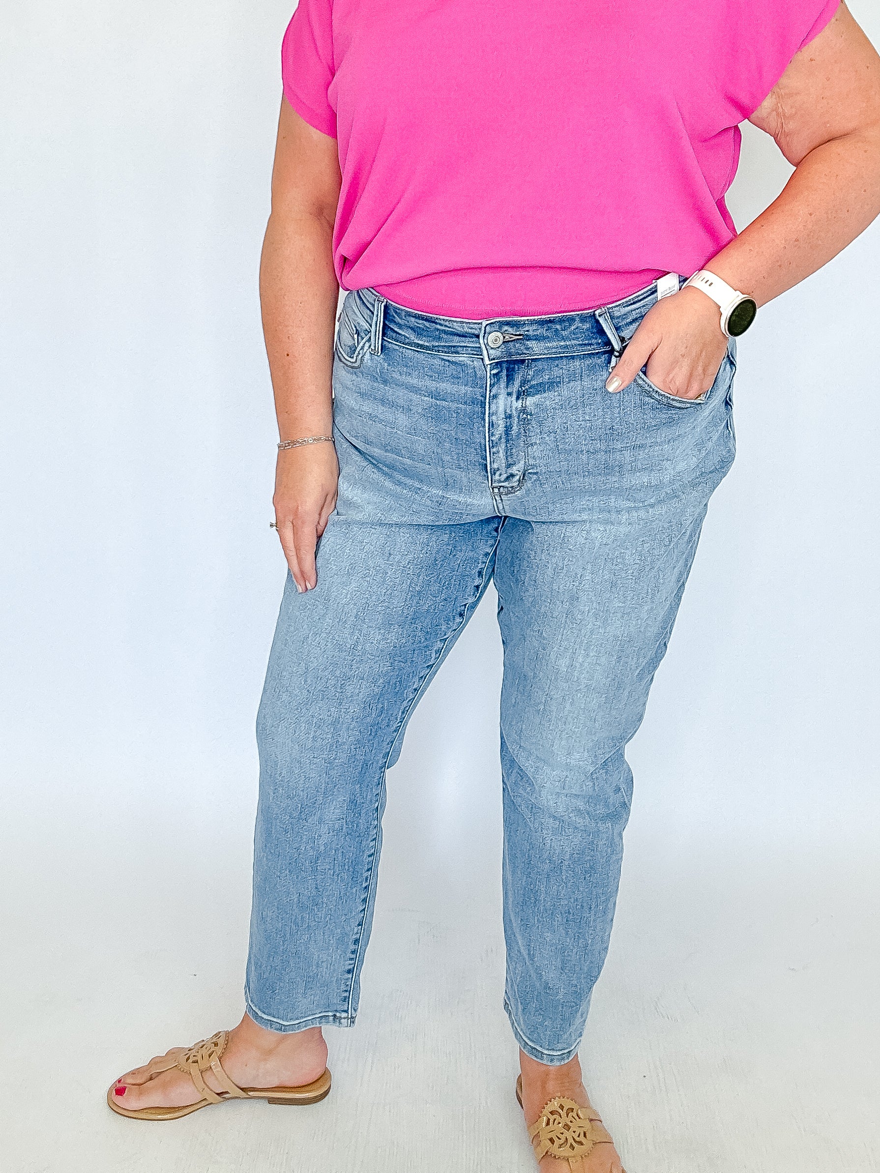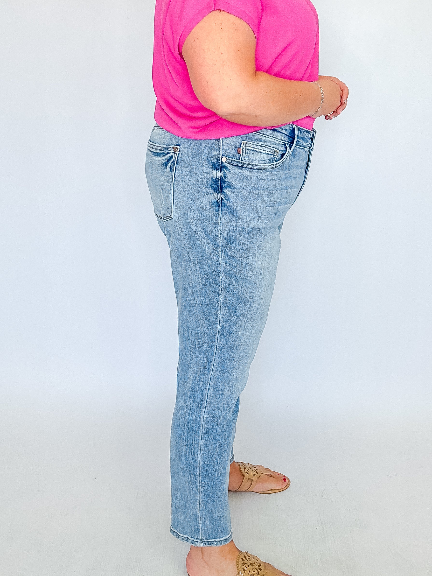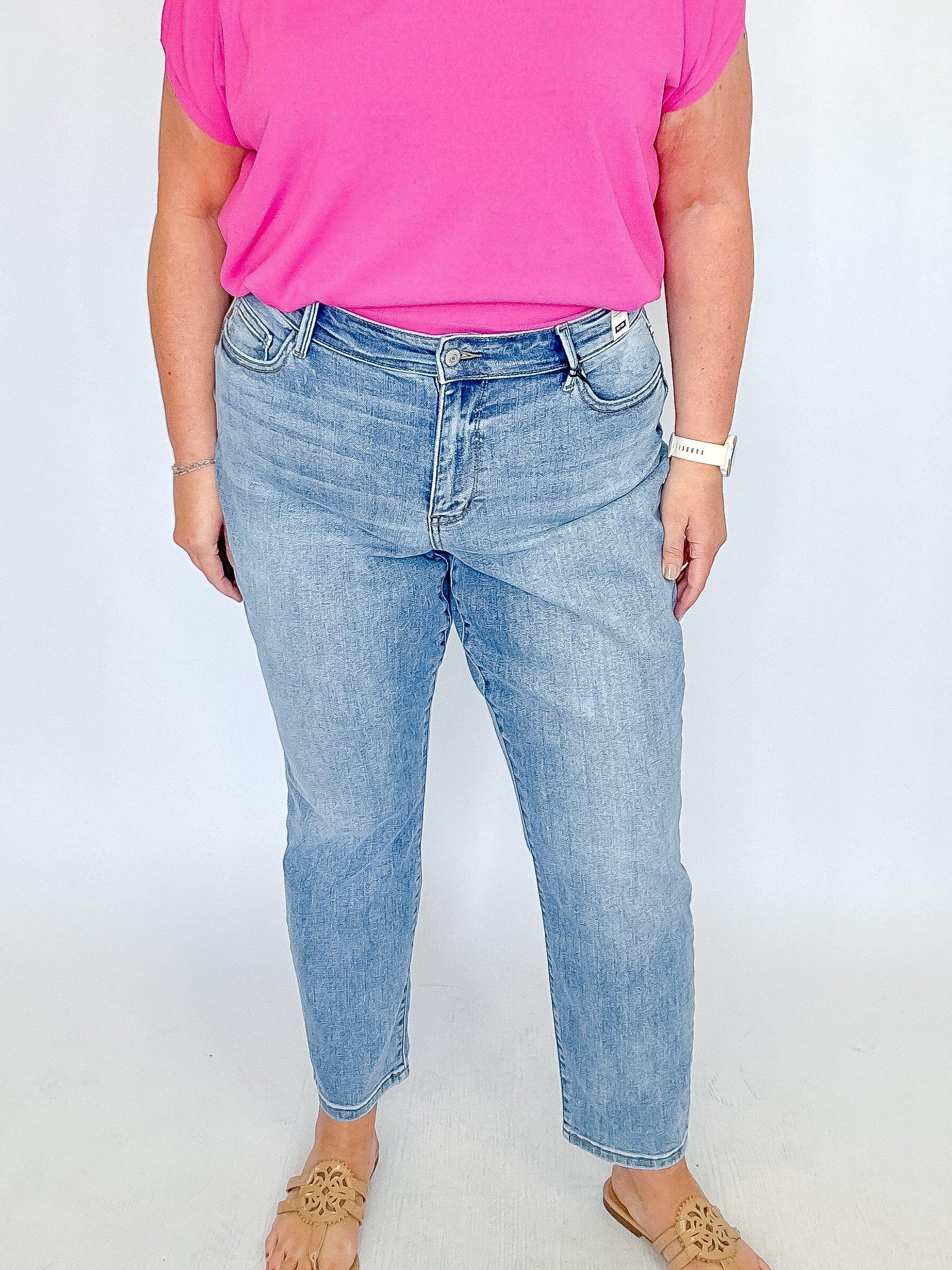 Classic style meets everyday functionality in these Mid-Rise Vintage Wash Slim Fit Jeans from Judy Blue. Designed with a comfortable mid-rise waist, they offer a flattering fit that sits just right while providing all-day ease. The slim fit silhouette creates a clean, streamlined look, perfectly balanced by a timeless vintage wash for that lived-in appeal. Featuring a convenient cell phone pocket, these jeans blend practicality with style. Crafted from Judy Blue’s signature soft, stretchy denim, they’re an effortless go-to for casual days or dressed-up denim looks.