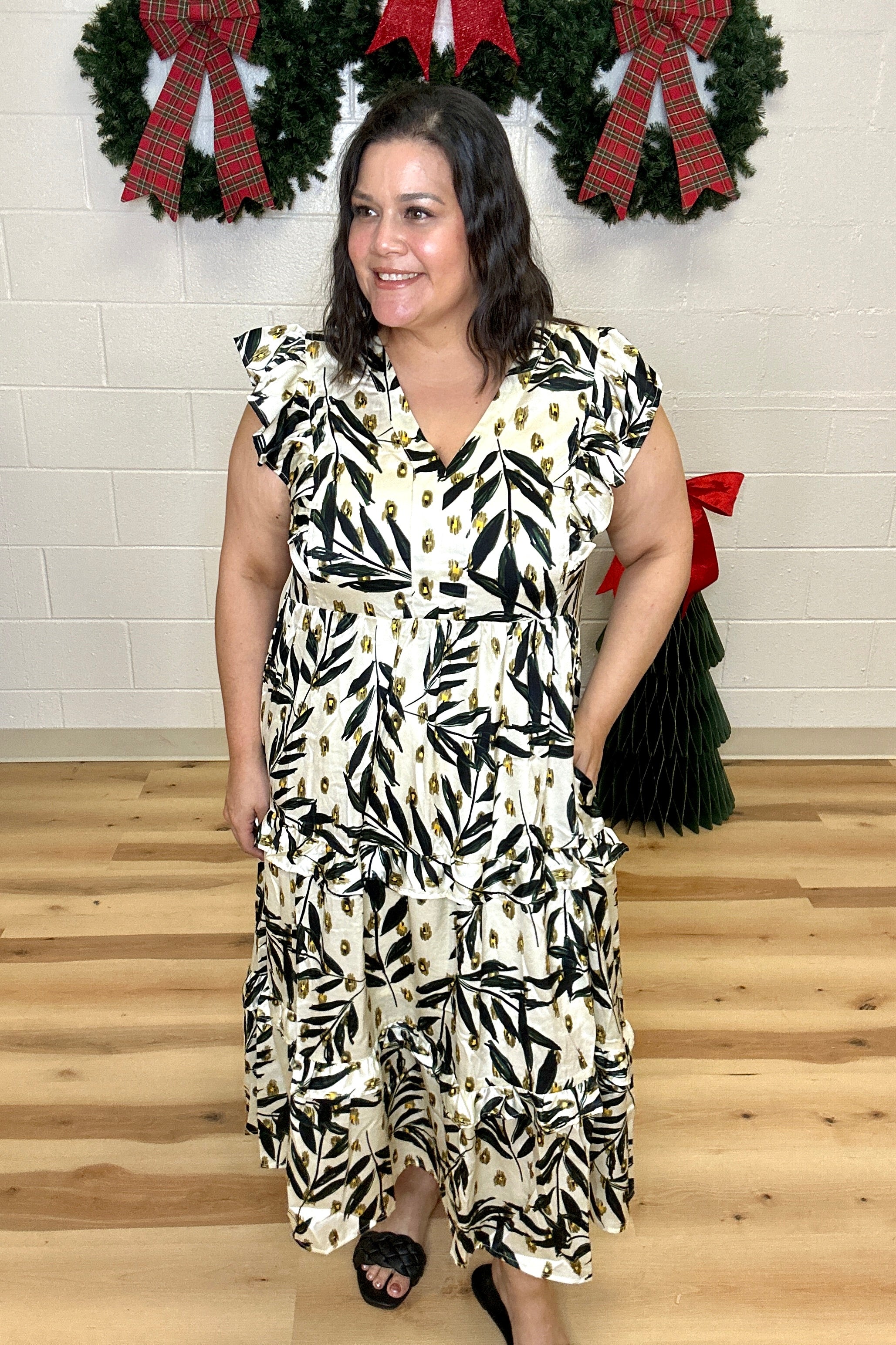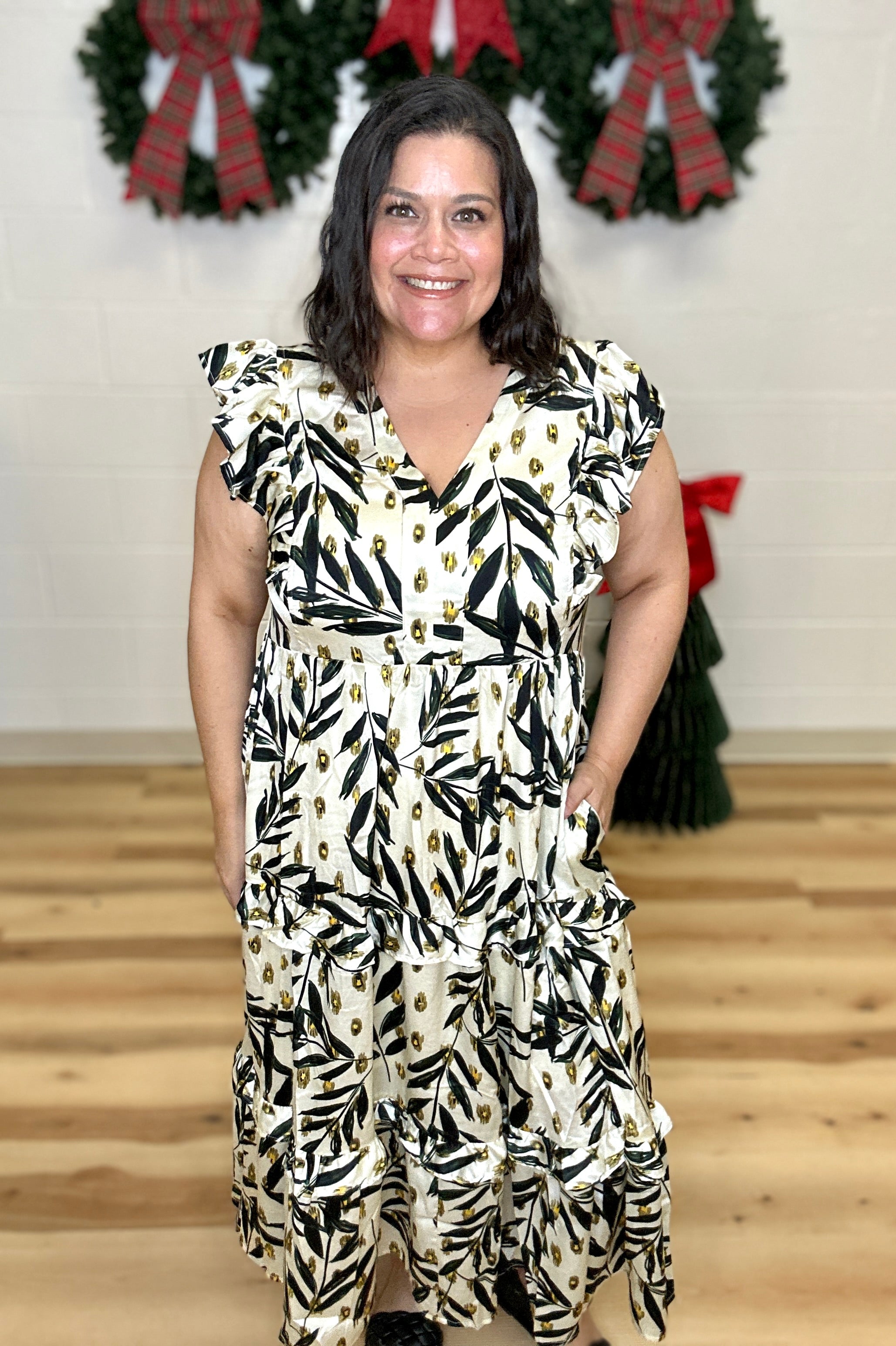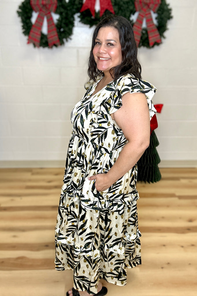 Turn heads in this stunning black and mustard floral midi dress—a playful piece that's as practical as it is pretty. The flattering v-neck and tiered ruffle detail create effortless movement and dimension, while hidden side pockets keep your essentials close. Crafted from lightweight woven fabric with a smooth lining, it's non-sheer and ready for any occasion. Dress it up or down and let your style shine!