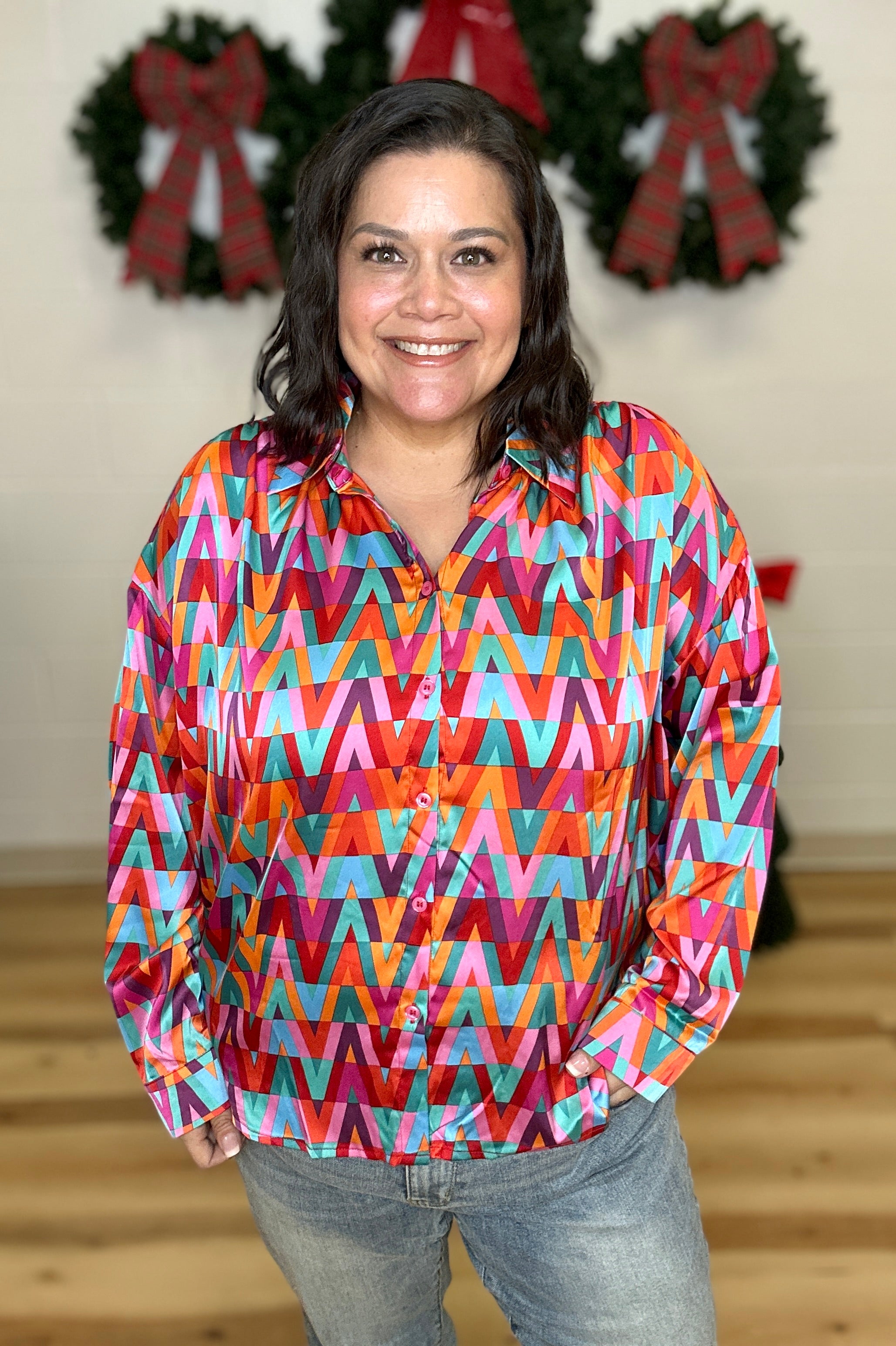 Elevate your casual wardrobe with this striking multicolor geometric button-down from Jodifl. The long-sleeve design features a modern hi-lo hemline that adds dimension and movement, while the bold geometric pattern makes an instant style statement. Perfect for layering or wearing solo, this versatile piece transitions seamlessly from day to evening. The structured button-front closure ensures a polished fit that works for both relaxed and refined occasions.