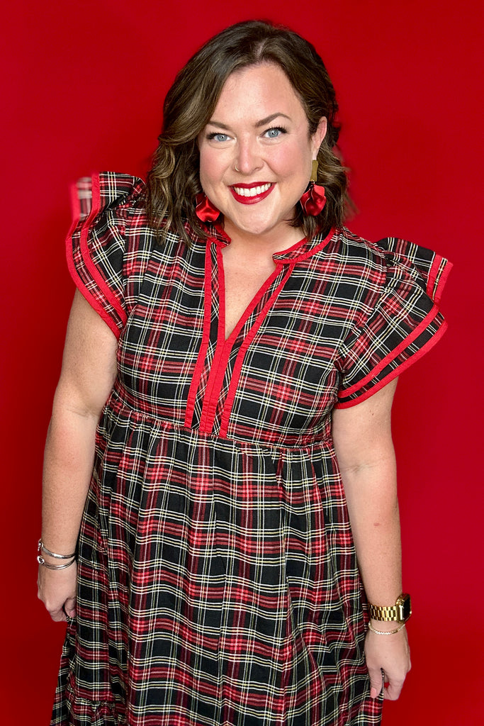 This plaid flutter sleeve midi dress combines effortless style with practical comfort. Featuring a flattering V-neck and eye-catching contrast binding, it adds subtle detail to your look. Lightweight and fully lined, it ensures modesty without bulk, while convenient side pockets provide easy storage. Crafted from woven fabric, this non-sheer dress is perfect for day-to-night wear when you want to feel confident and comfortable.