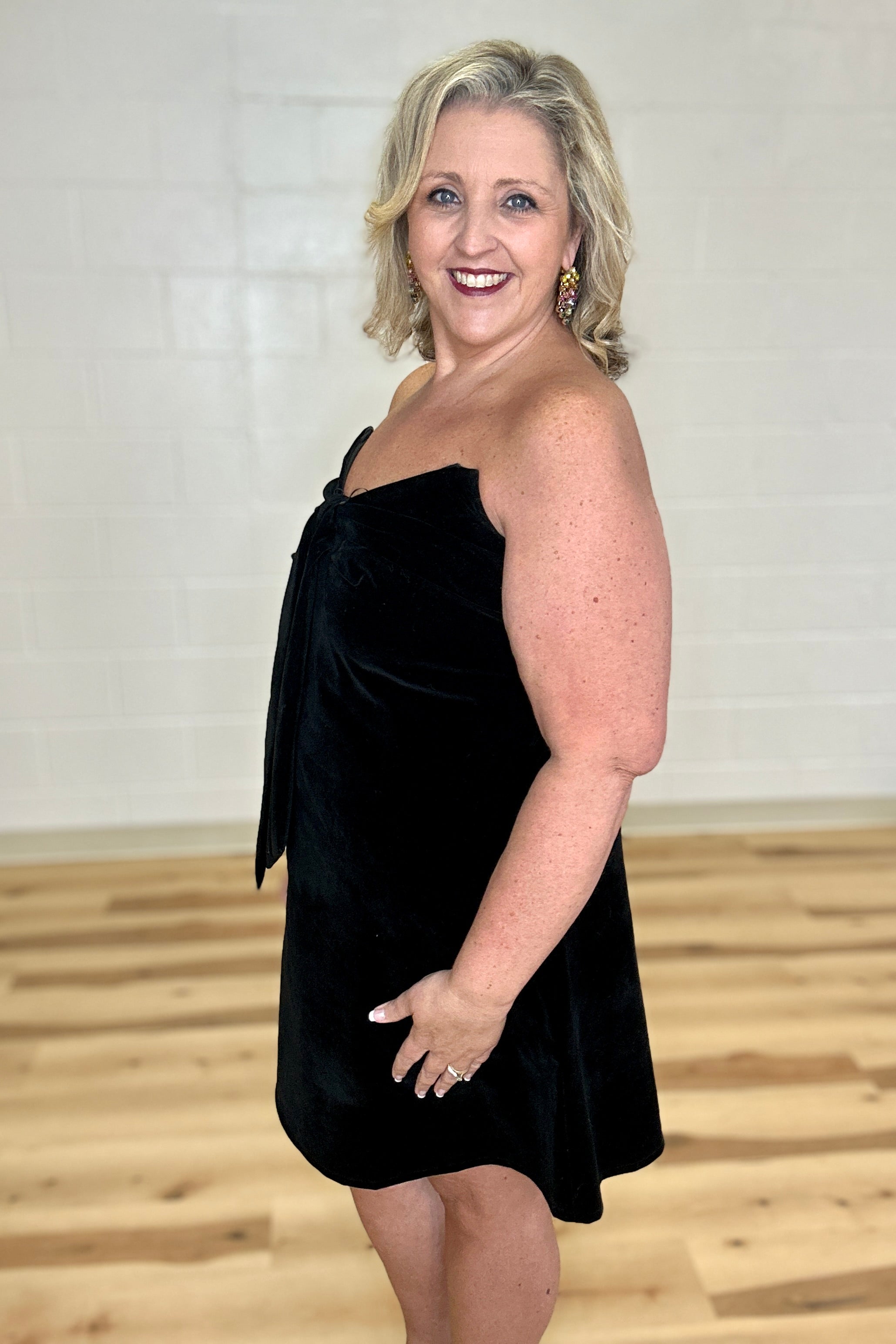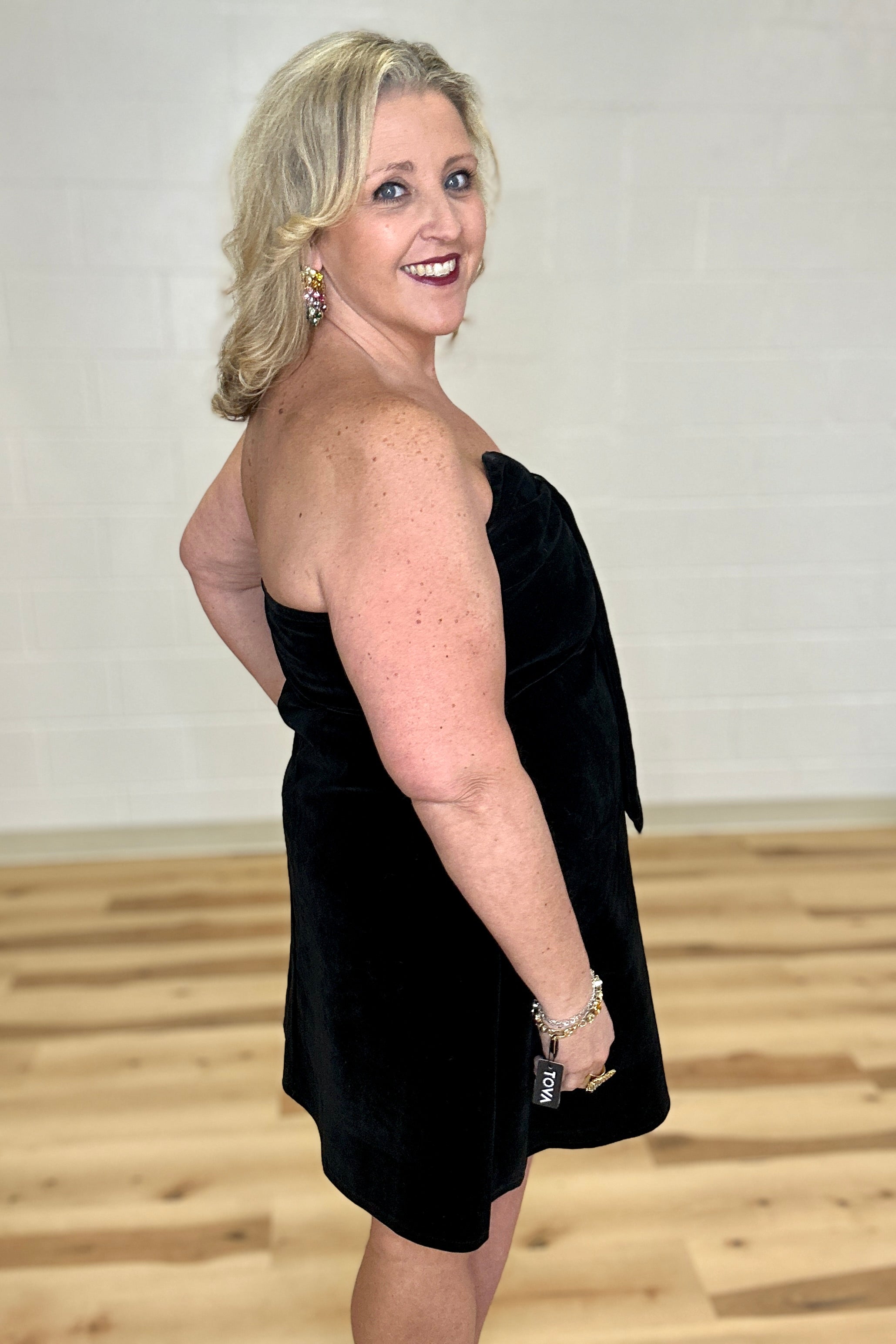 Slip into pure elegance with this stunning black velvet strapless dress from GeeGee. The luxurious velvet fabric drapes beautifully while the strapless neckline keeps things chic and sophisticated. A charming front bow adds a playful twist that takes this dress from classic to unforgettable. Perfect for date nights, parties, or any occasion where you want to turn heads and feel absolutely fabulous.