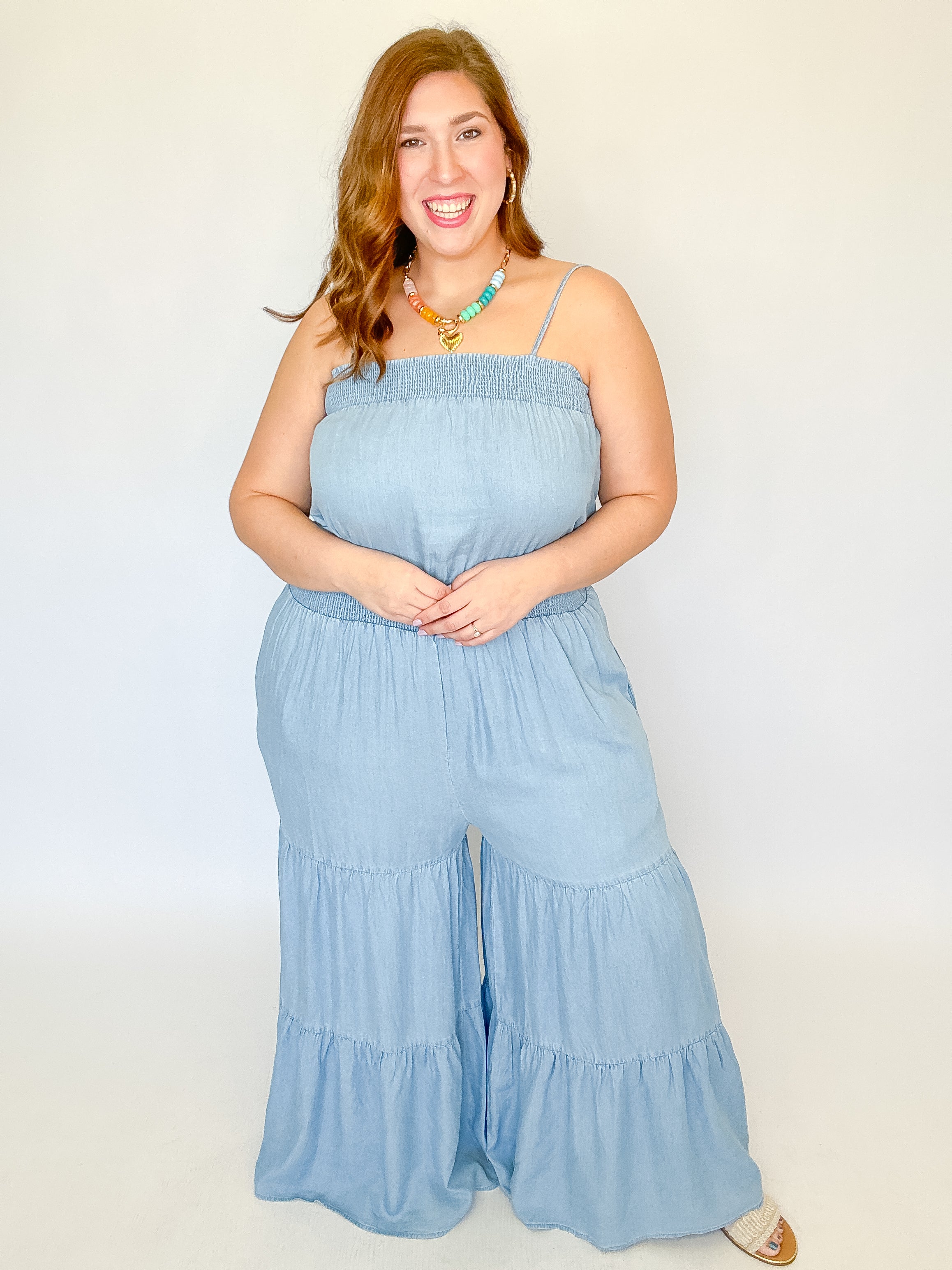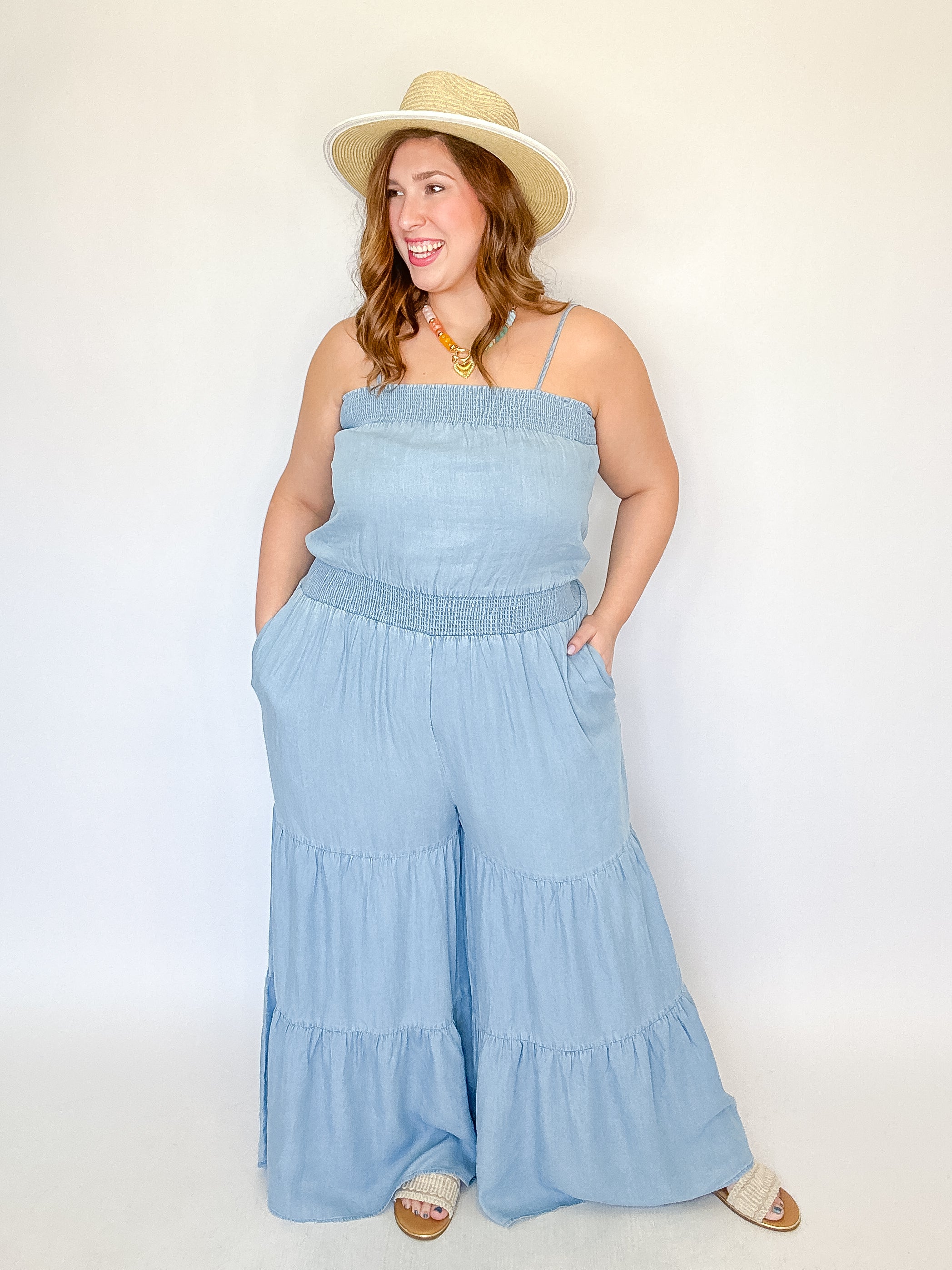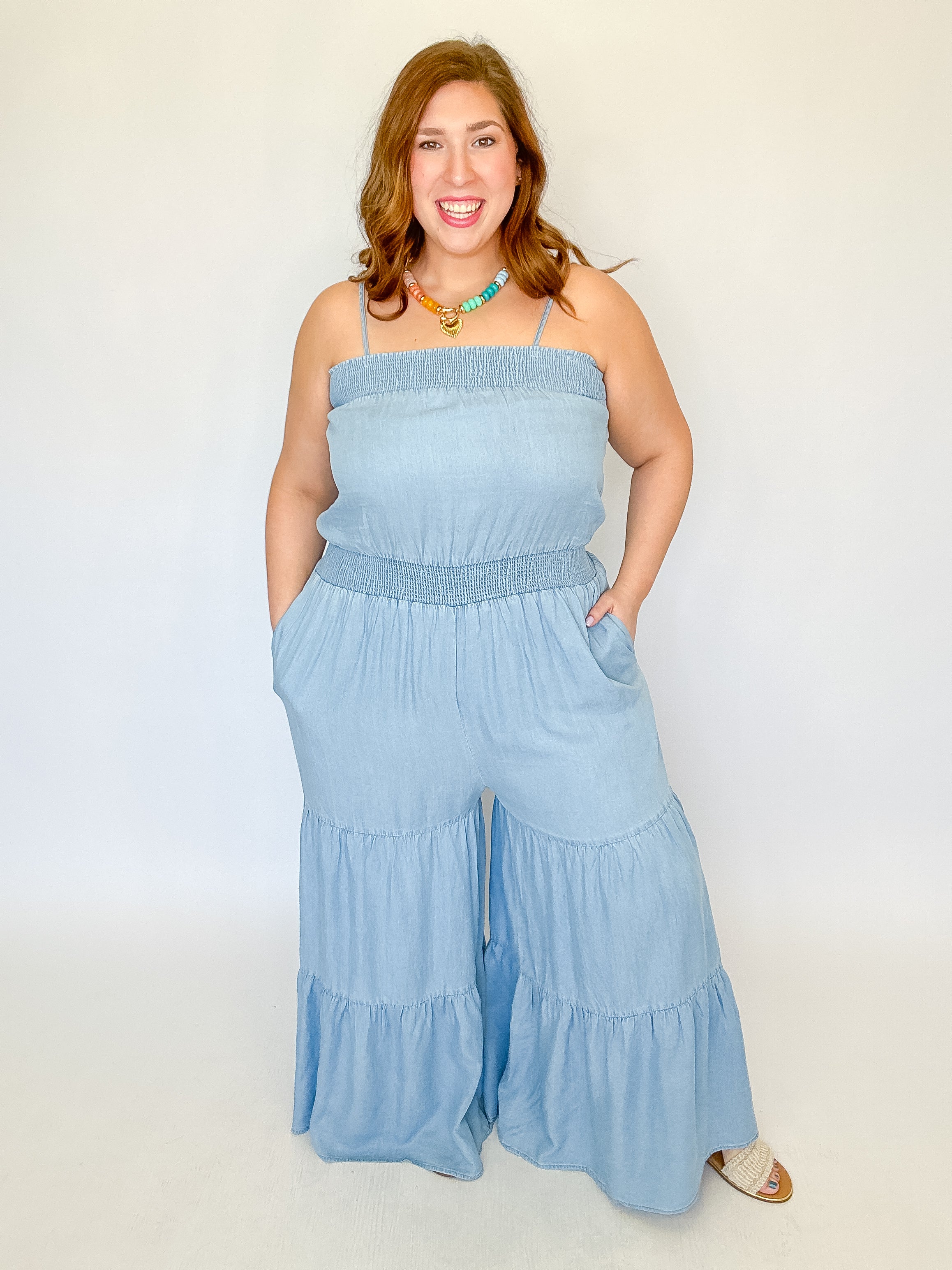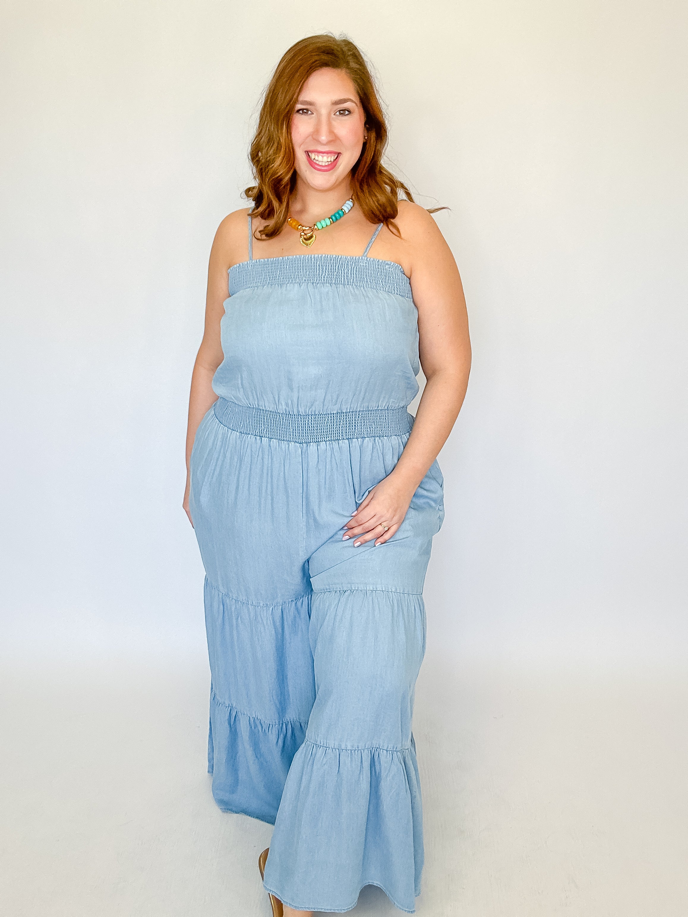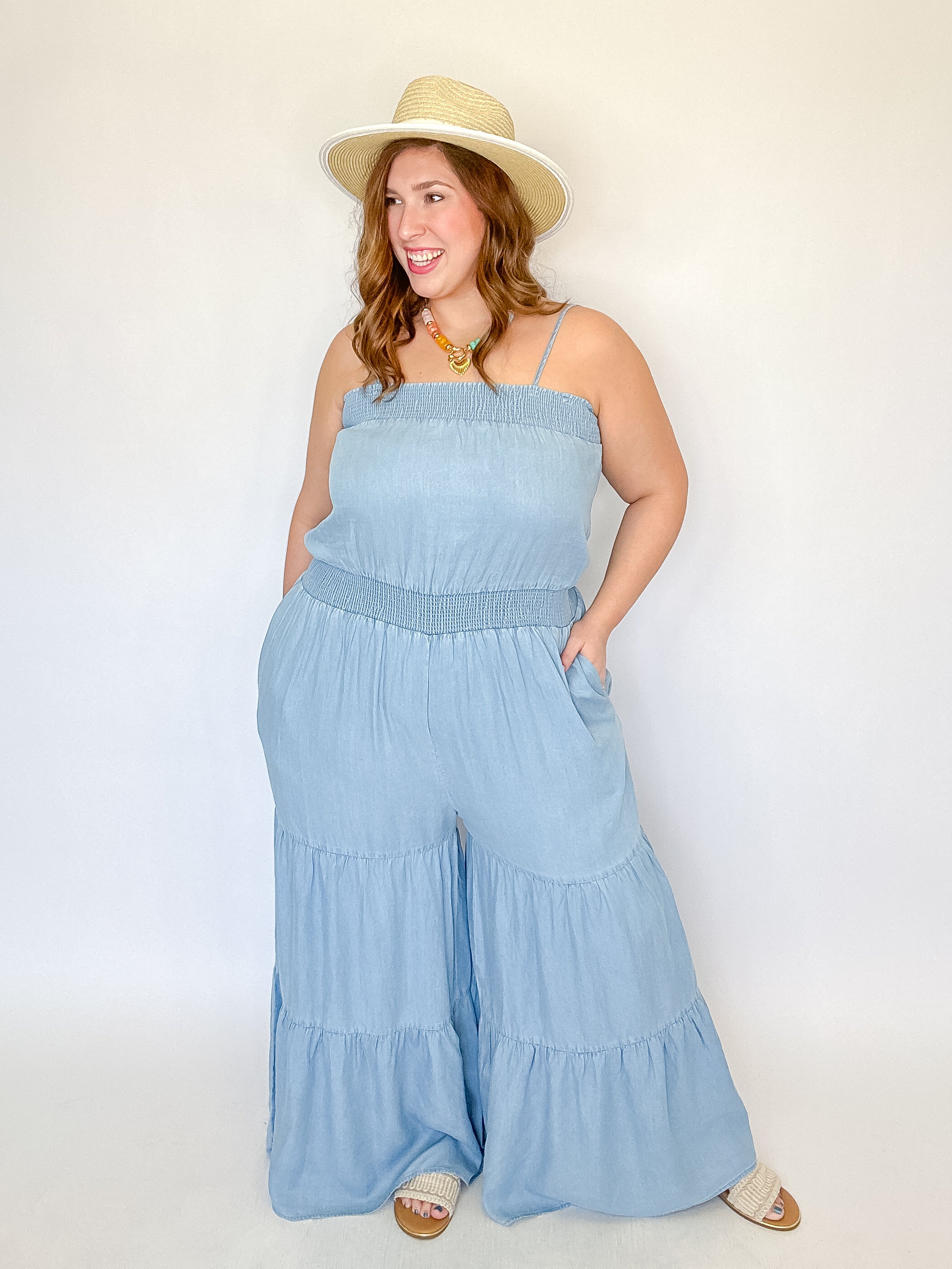 This flowy jumpsuit brings effortless elegance with its smocked bodice and tiered wide-leg silhouette. The adjustable spaghetti straps and elastic waistband ensure a flattering, comfortable fit for all-day wear. Light and breezy, it’s the perfect one-and-done outfit for sunny days or weekend getaways.
