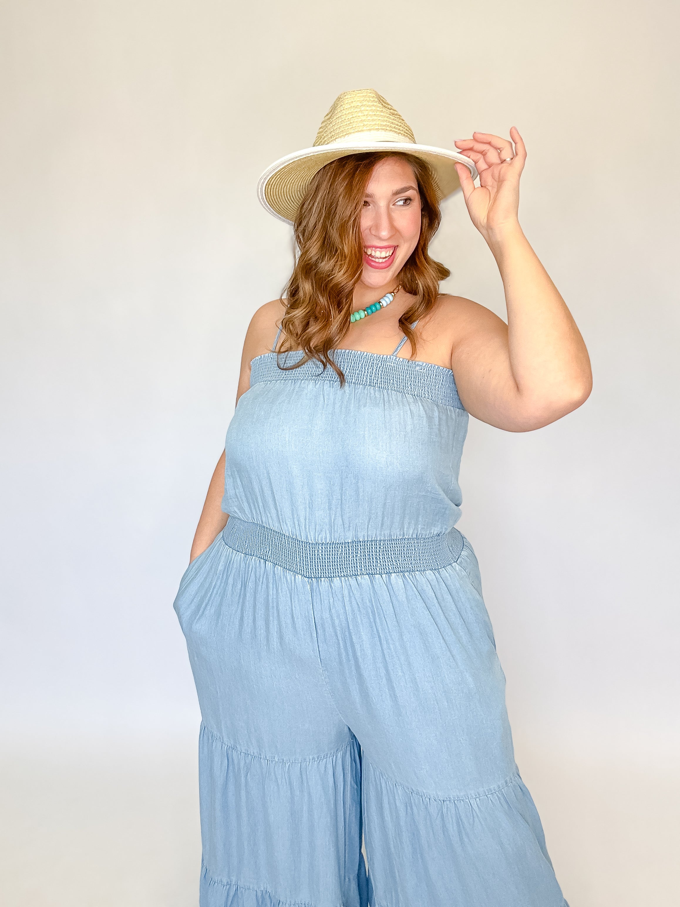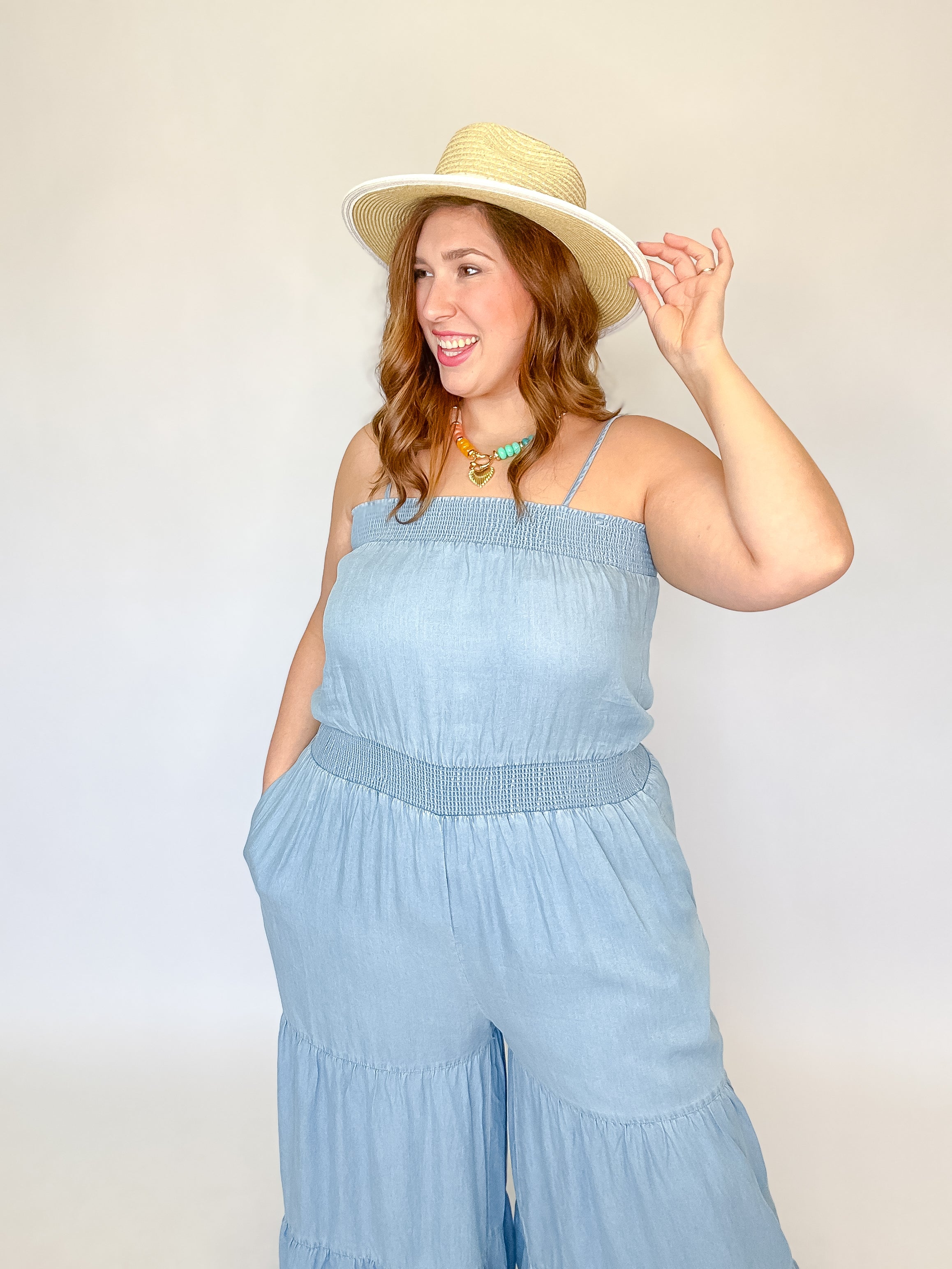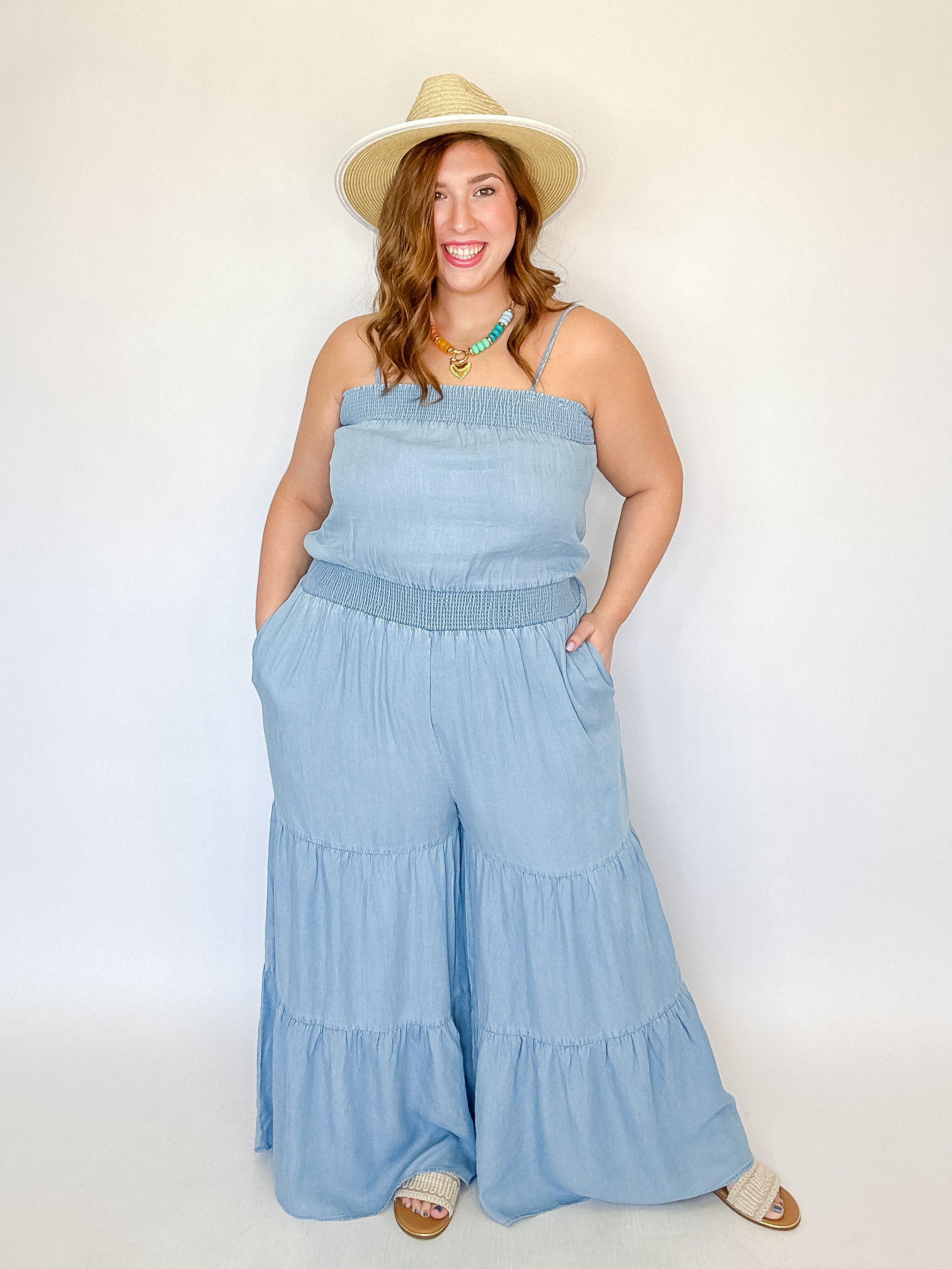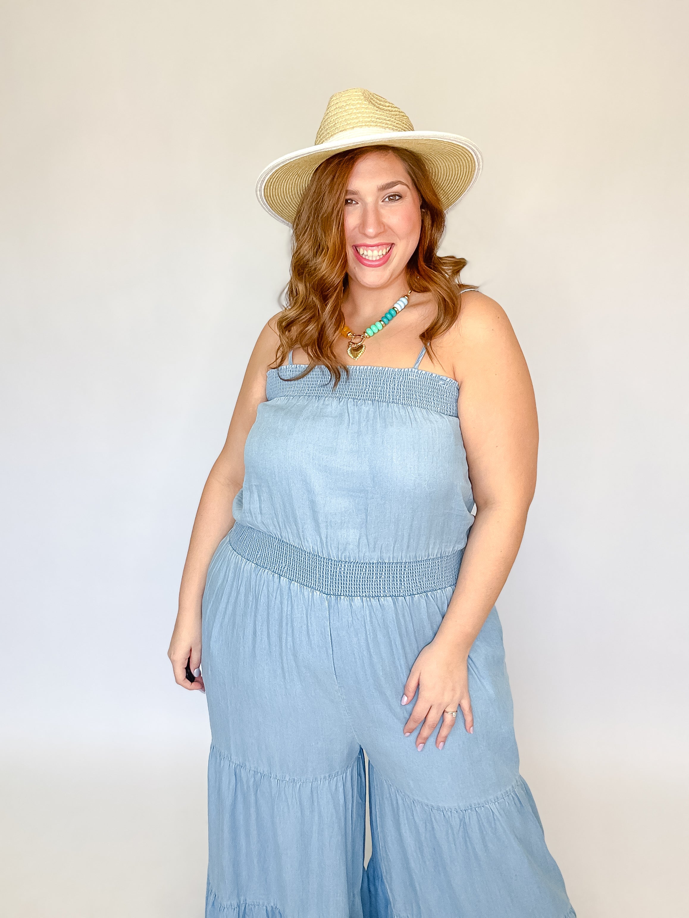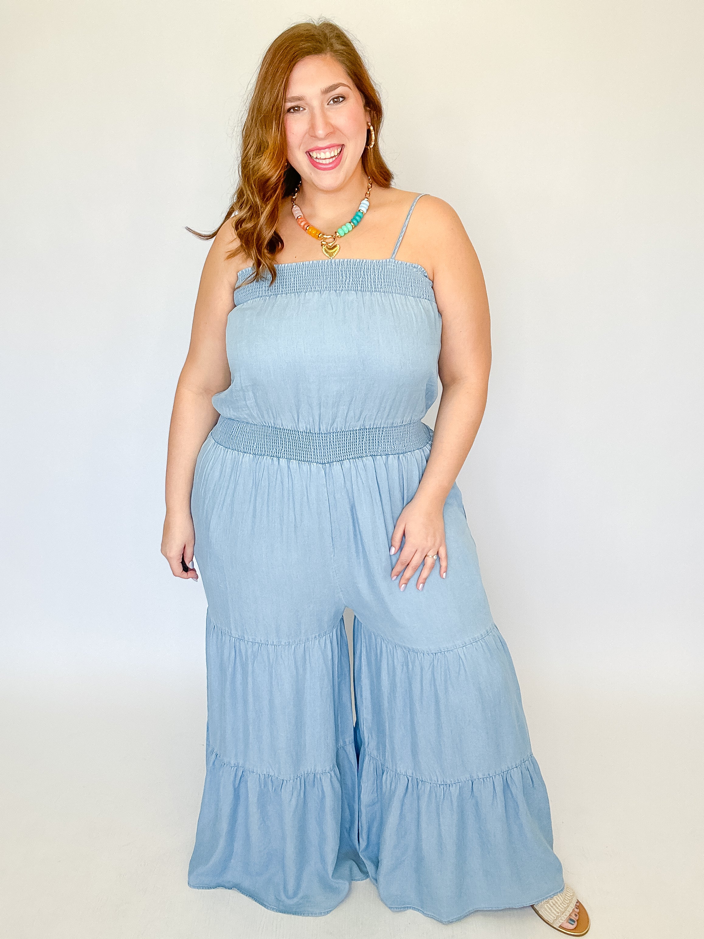 This flowy jumpsuit brings effortless elegance with its smocked bodice and tiered wide-leg silhouette. The adjustable spaghetti straps and elastic waistband ensure a flattering, comfortable fit for all-day wear. Light and breezy, it’s the perfect one-and-done outfit for sunny days or weekend getaways.
