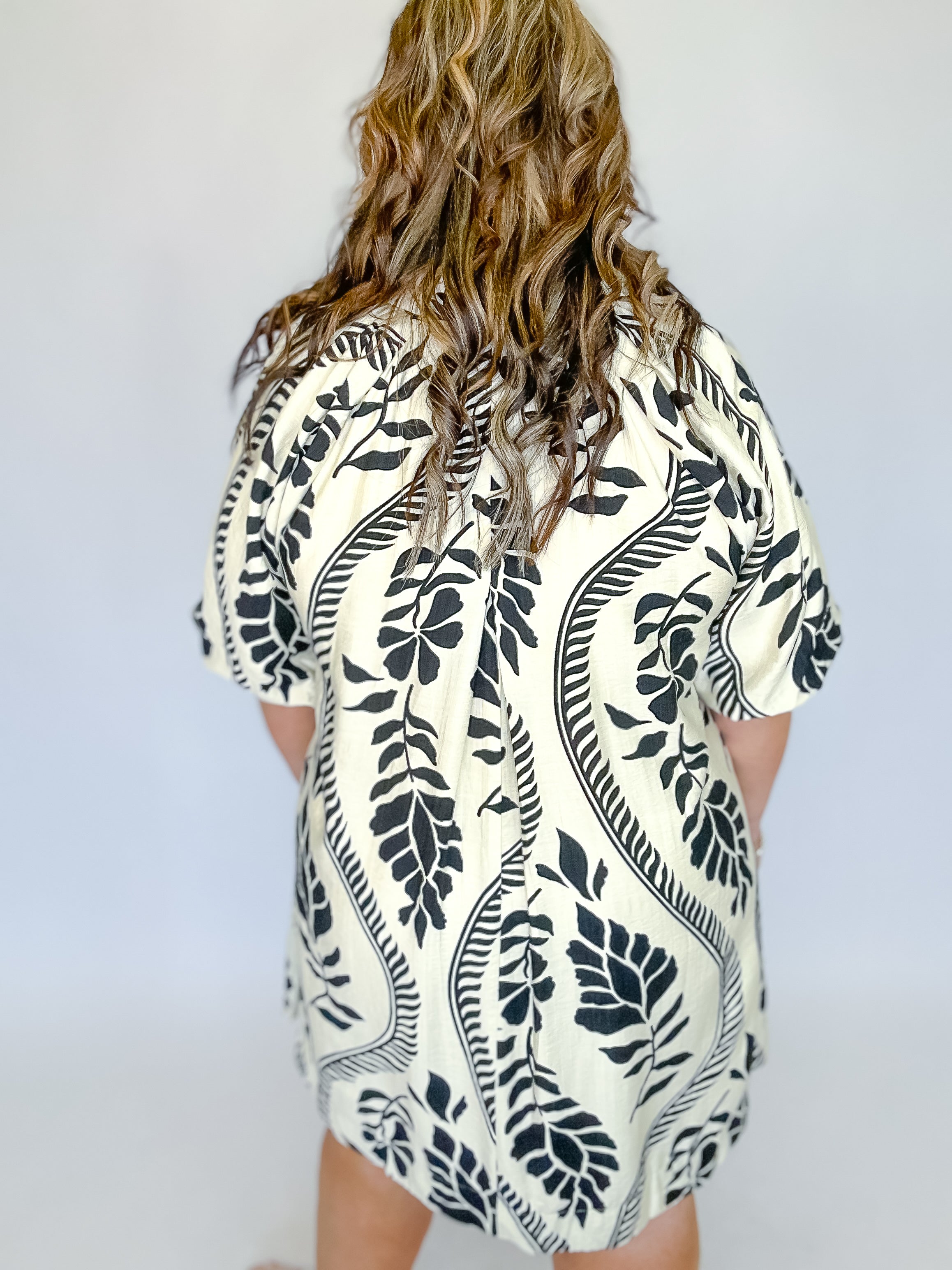 Enhance your wardrobe with this striking botanical blouse, featuring a bold oversized leaf print that commands attention. The sophisticated split neckline with crisp collar detail adds polish and dimension, while elbow-length puff sleeves deliver contemporary flair. Fully lined for comfort and structure, this piece transitions seamlessly from office to evening occasions. A versatile staple that brings artistic elegance to any ensemble.