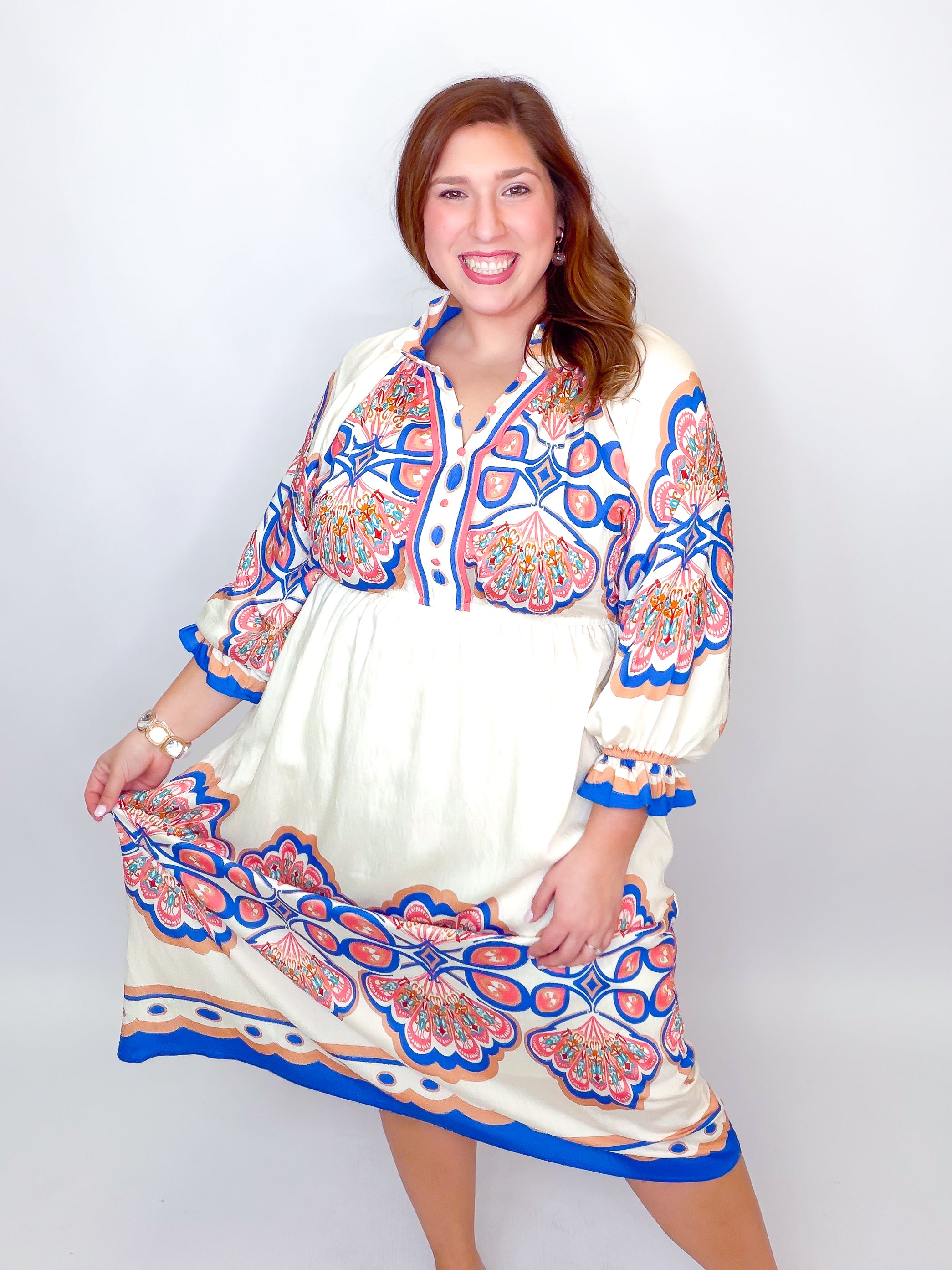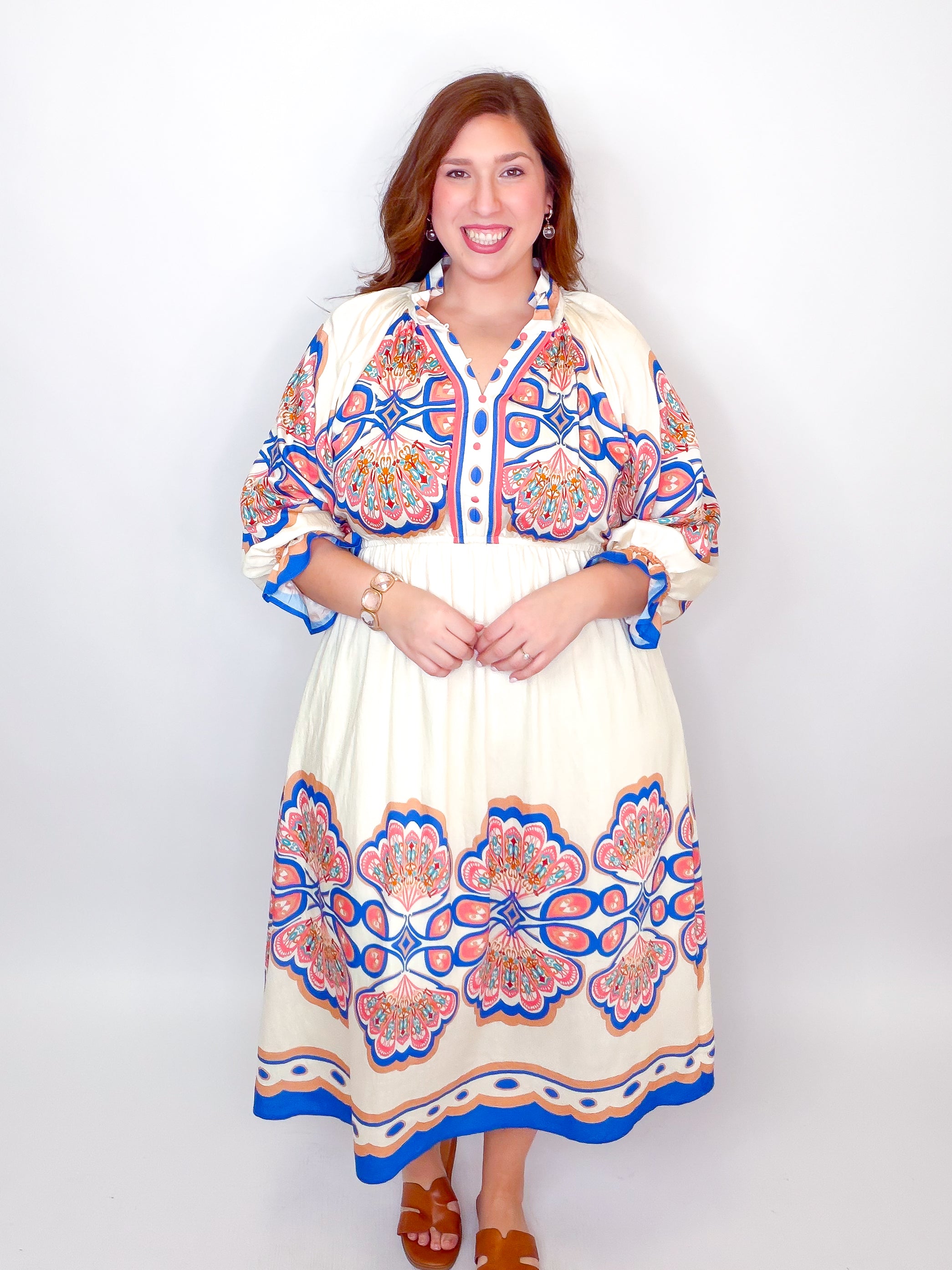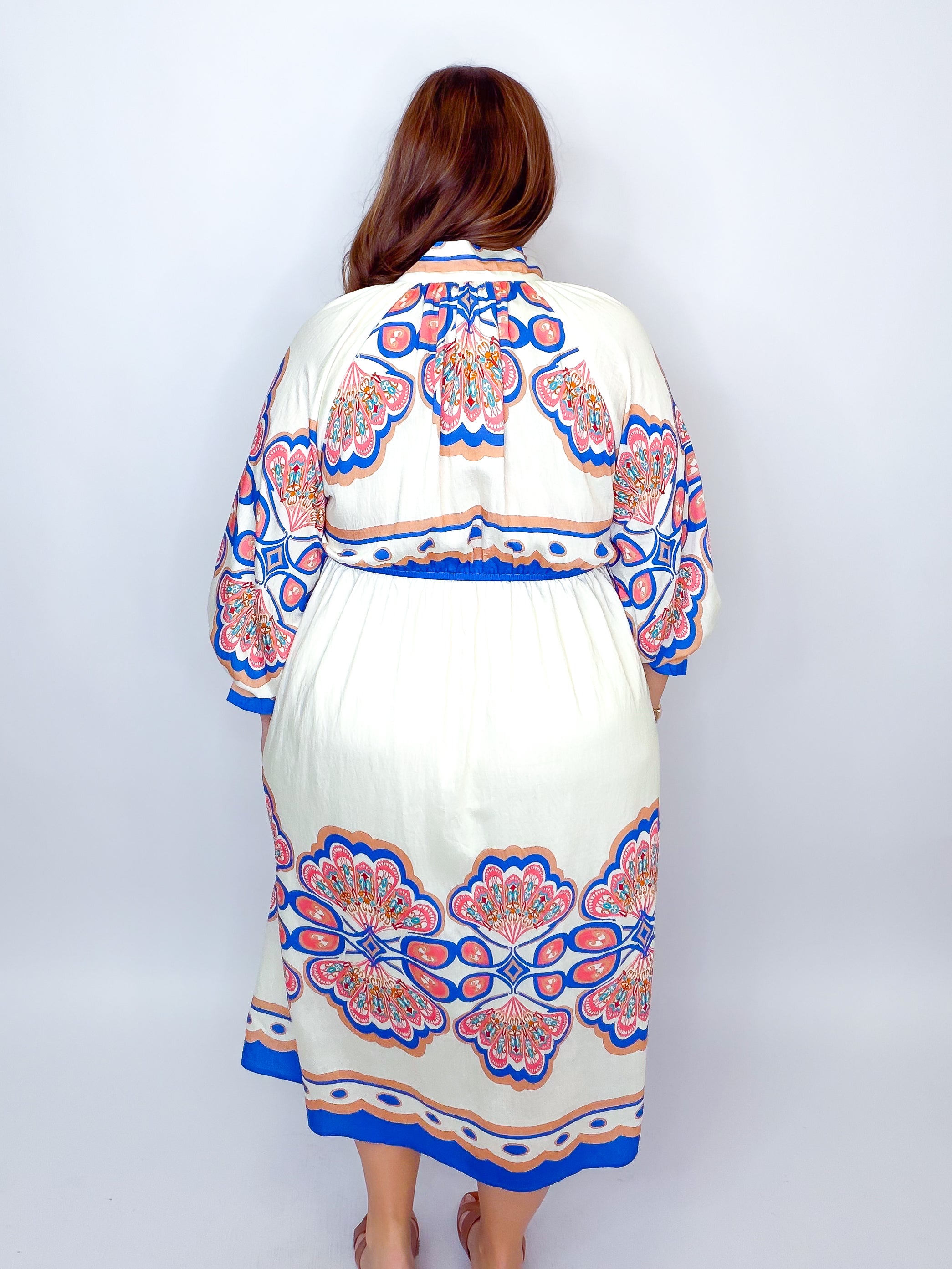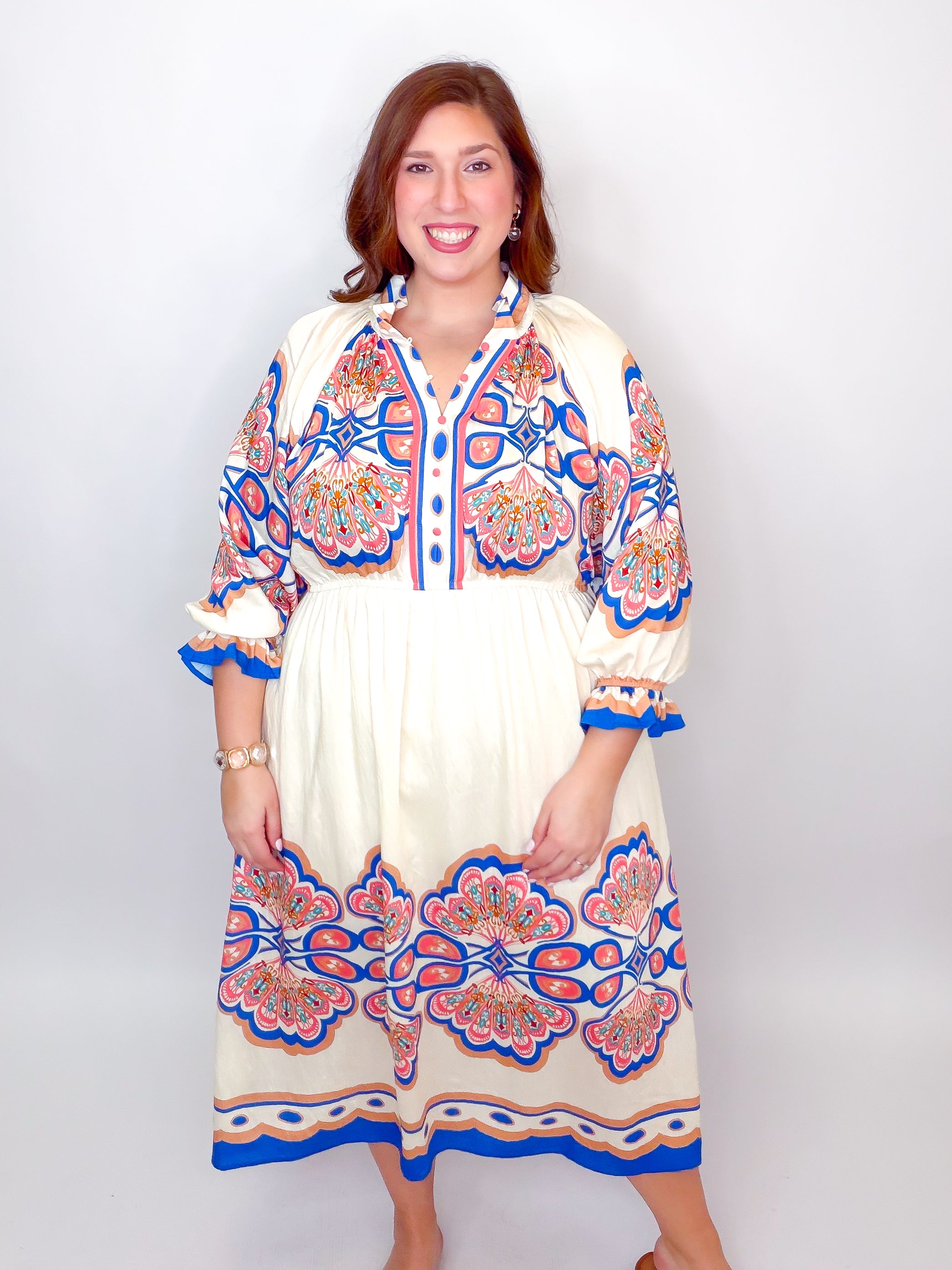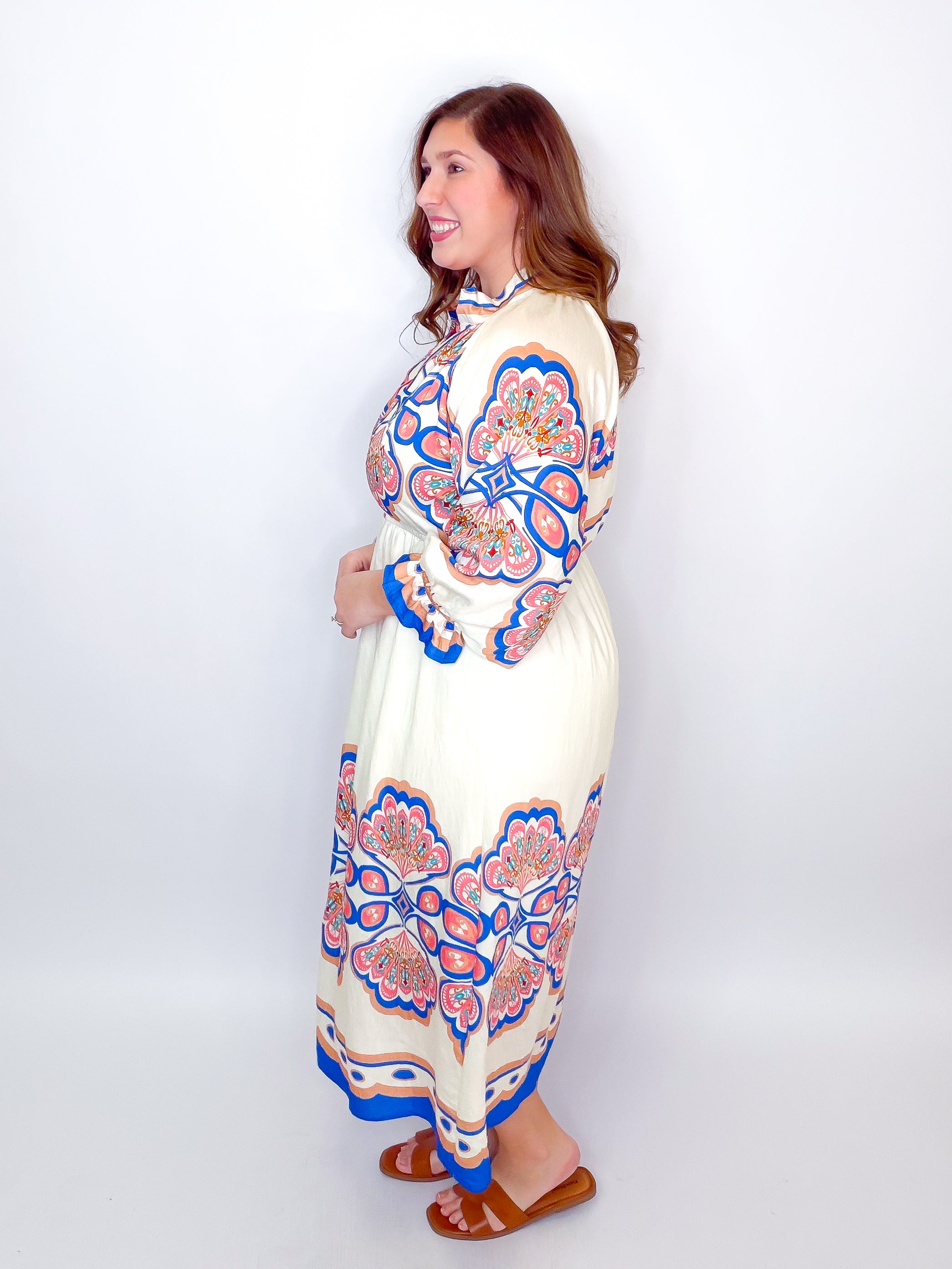 Twirl into elegance with this stunning plume border midi dress. The high stand V-neck with open collar creates a chic, effortless look, while long sleeves adorned with delicate ruffles add a touch of whimsy. An elastic waistband hugs you in all the right places for comfort and confidence, and the lined skirt ensures smooth, graceful movement. Perfect for brunch dates, garden parties, or whenever you want to feel fabulous.