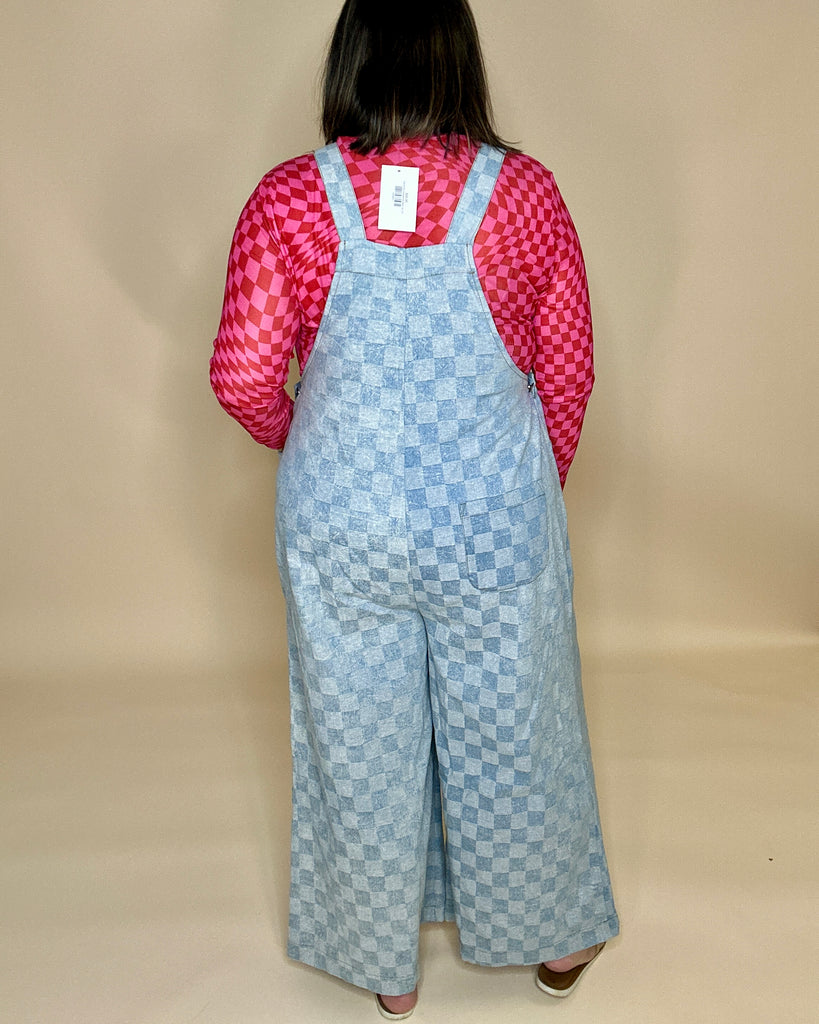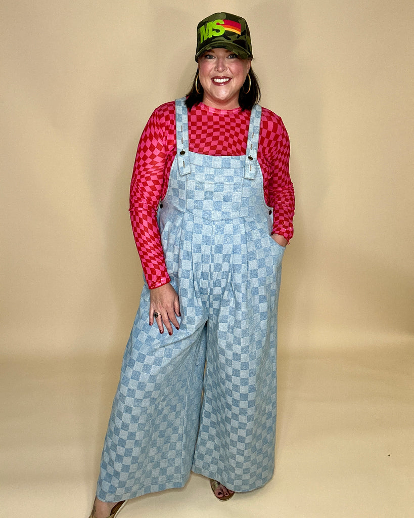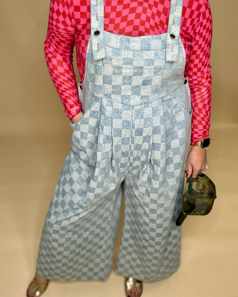 This denim jumpsuit brings a fun twist with its subtle checkered pattern and breezy wide-leg cut, perfect for a chill, stylish vibe. Adjustable straps with button closures let you tailor your fit, while deep side pockets keep your essentials close and your hands free for adventure. Crafted from soft, lightweight denim, it’s an easy layer-up for whatever the season throws your way. Ready to play in style? This jumpsuit’s got you covered!