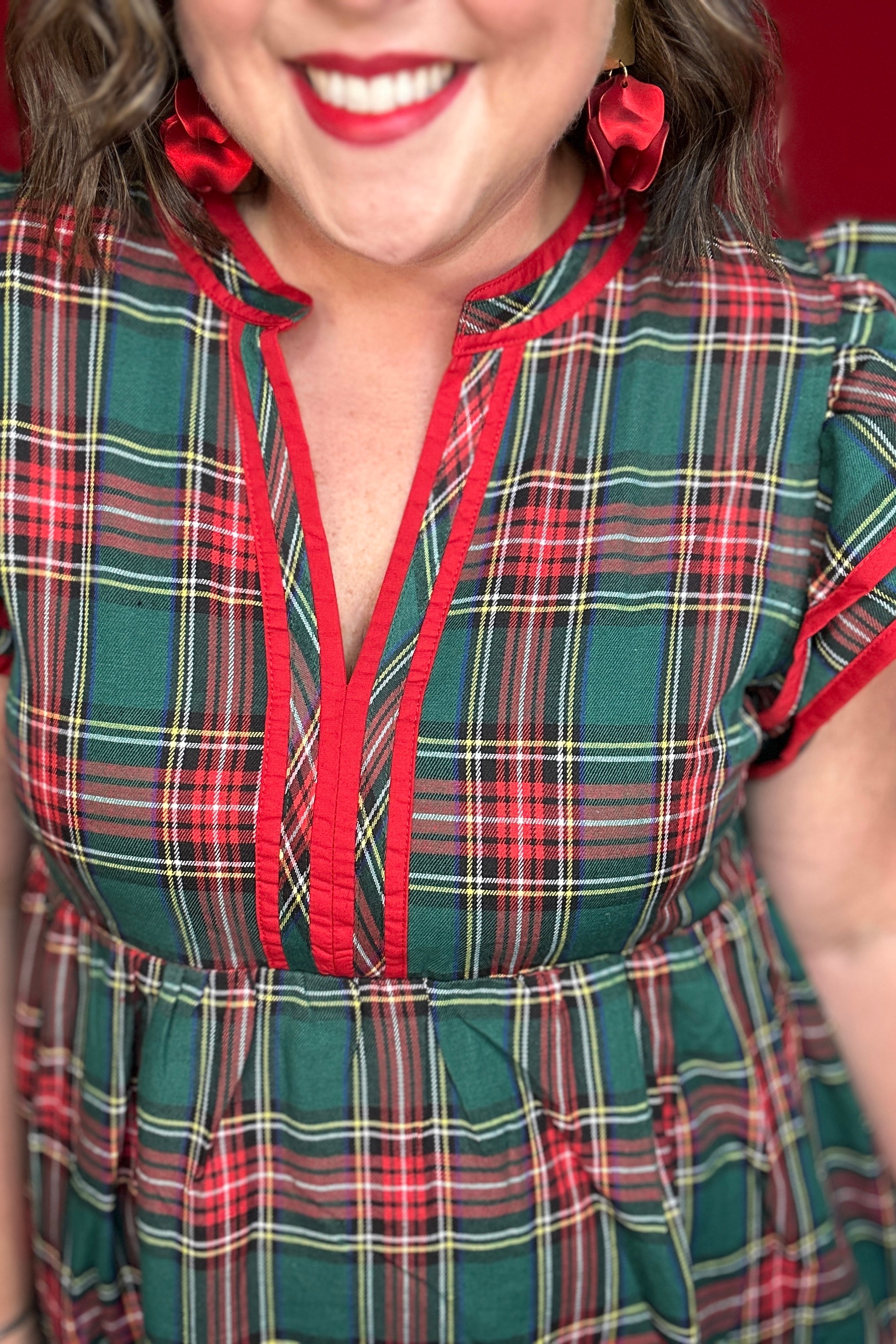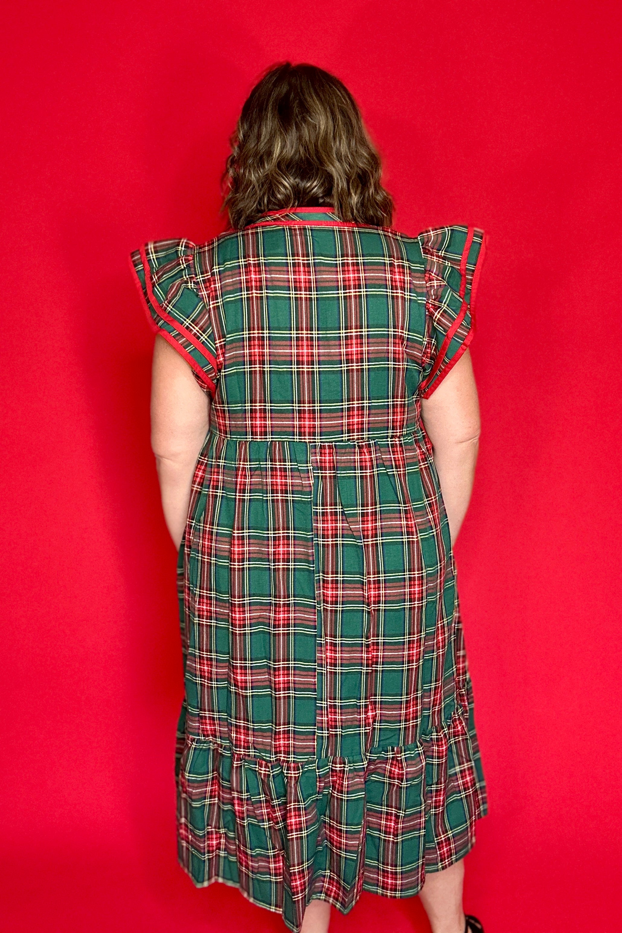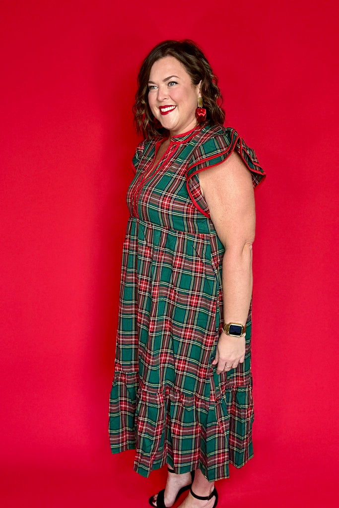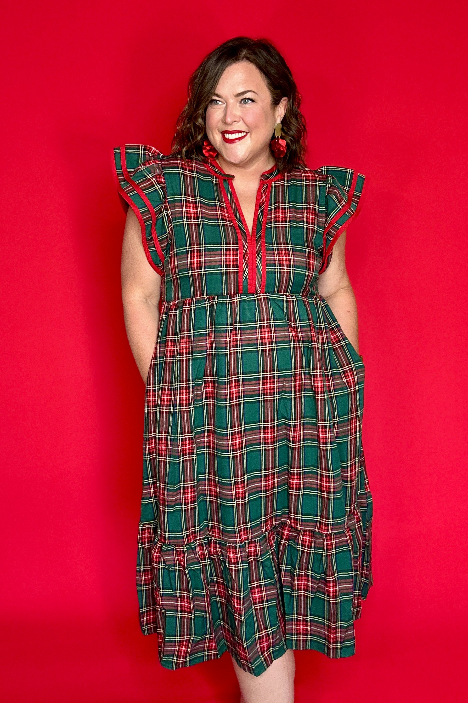 This plaid flutter sleeve midi dress combines effortless style with practical comfort. Featuring a flattering V-neck and eye-catching contrast binding, it adds subtle detail to your look. Lightweight and fully lined, it ensures modesty without bulk, while convenient side pockets provide easy storage. Crafted from woven fabric, this non-sheer dress is perfect for day-to-night wear when you want to feel confident and comfortable.