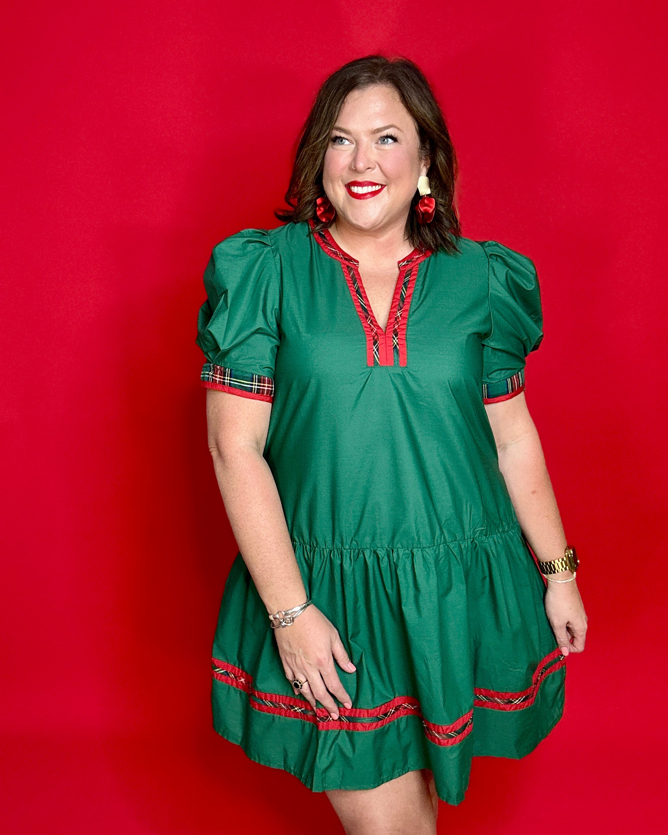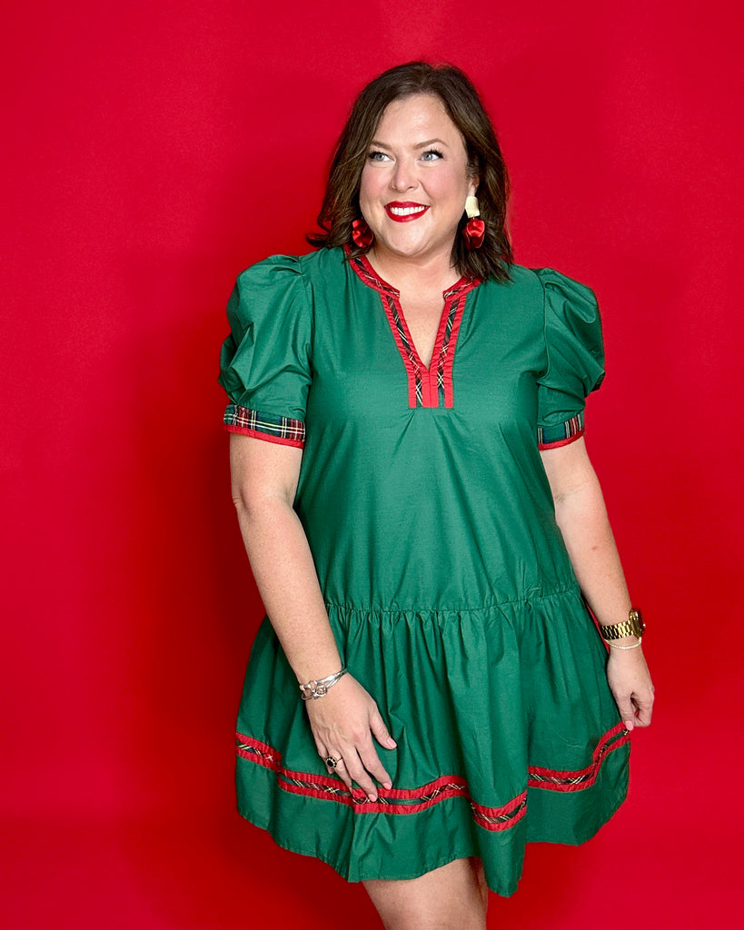 This lightweight woven mini dress offers a refined silhouette with its puff sleeves and subtle plaid trim at the neckline, cuffs, and hem. Fully lined and non-sheer, it ensures a comfortable and polished look. Practical side pockets add functionality without compromising style, making it an expertly crafted piece suitable for versatile occasions.