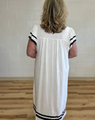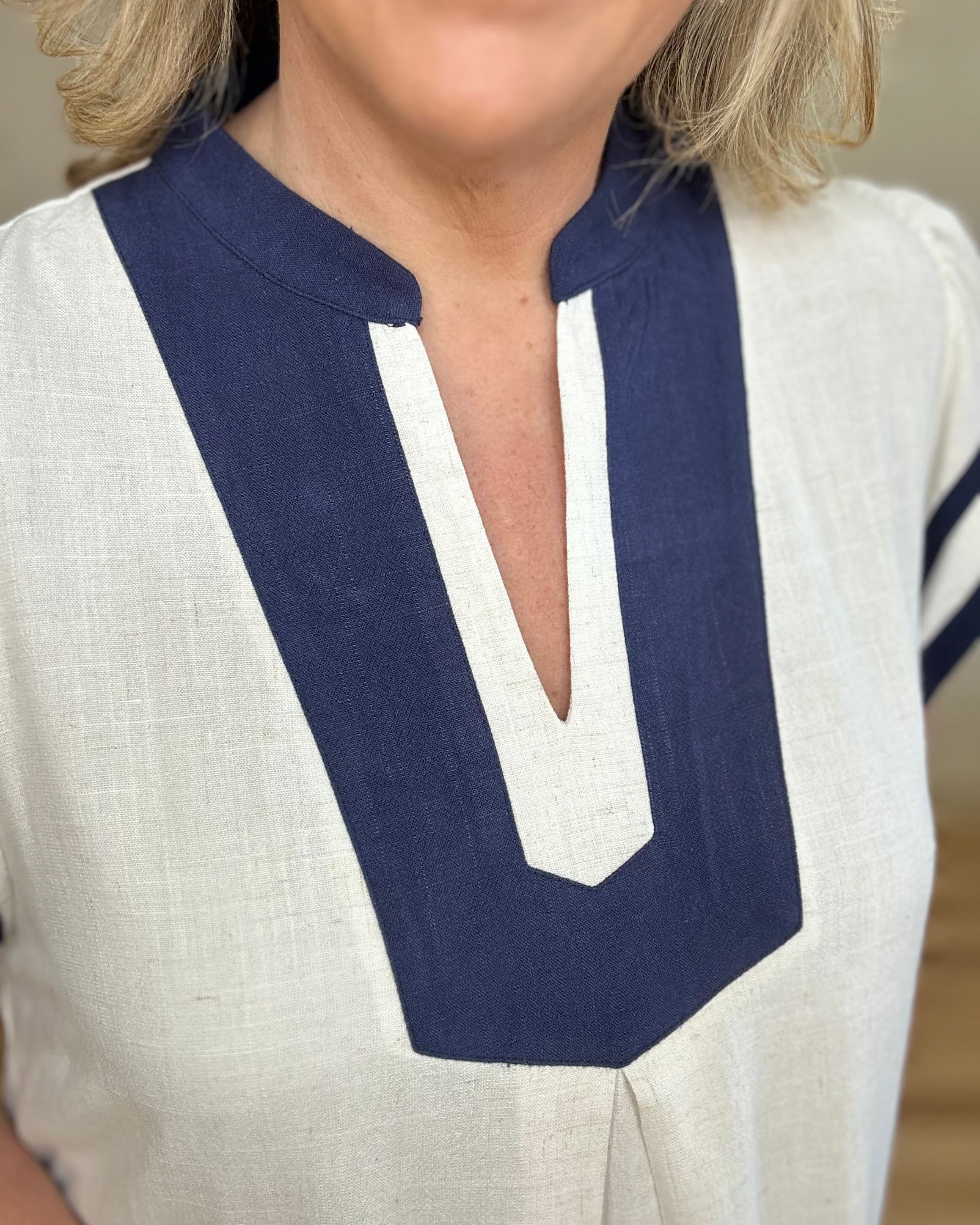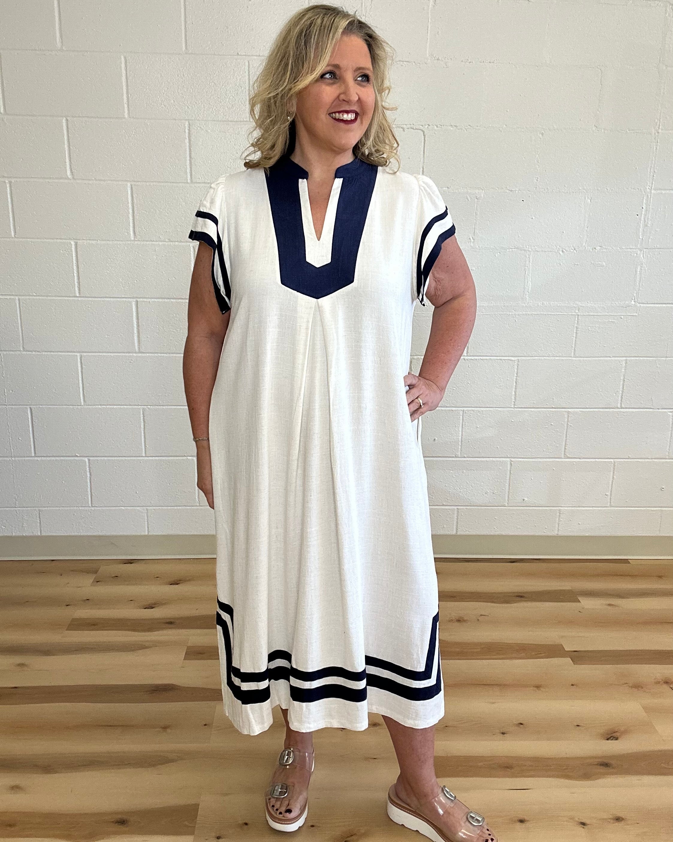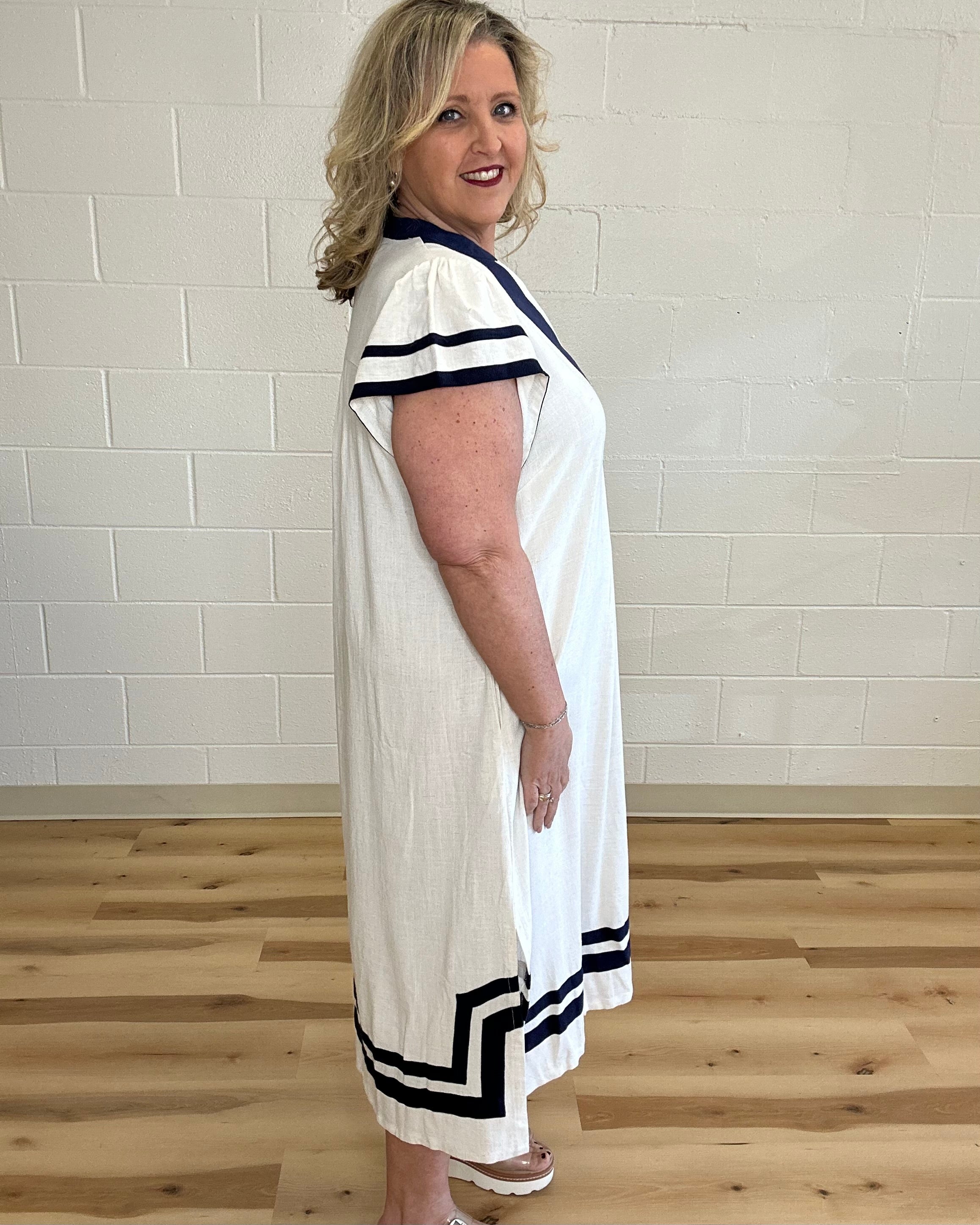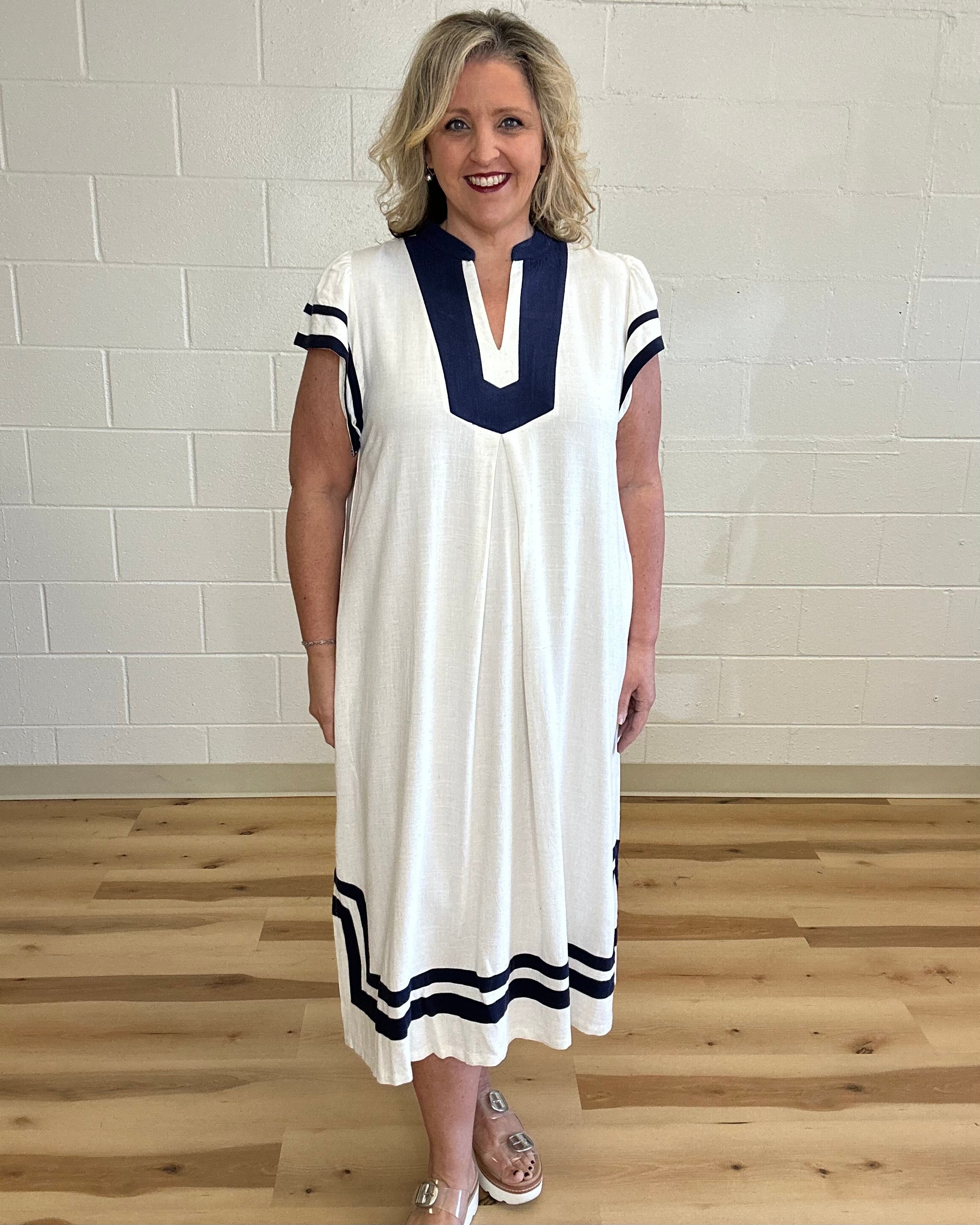 Ivory & Navy Linen Cap Sleeve Midi Dress