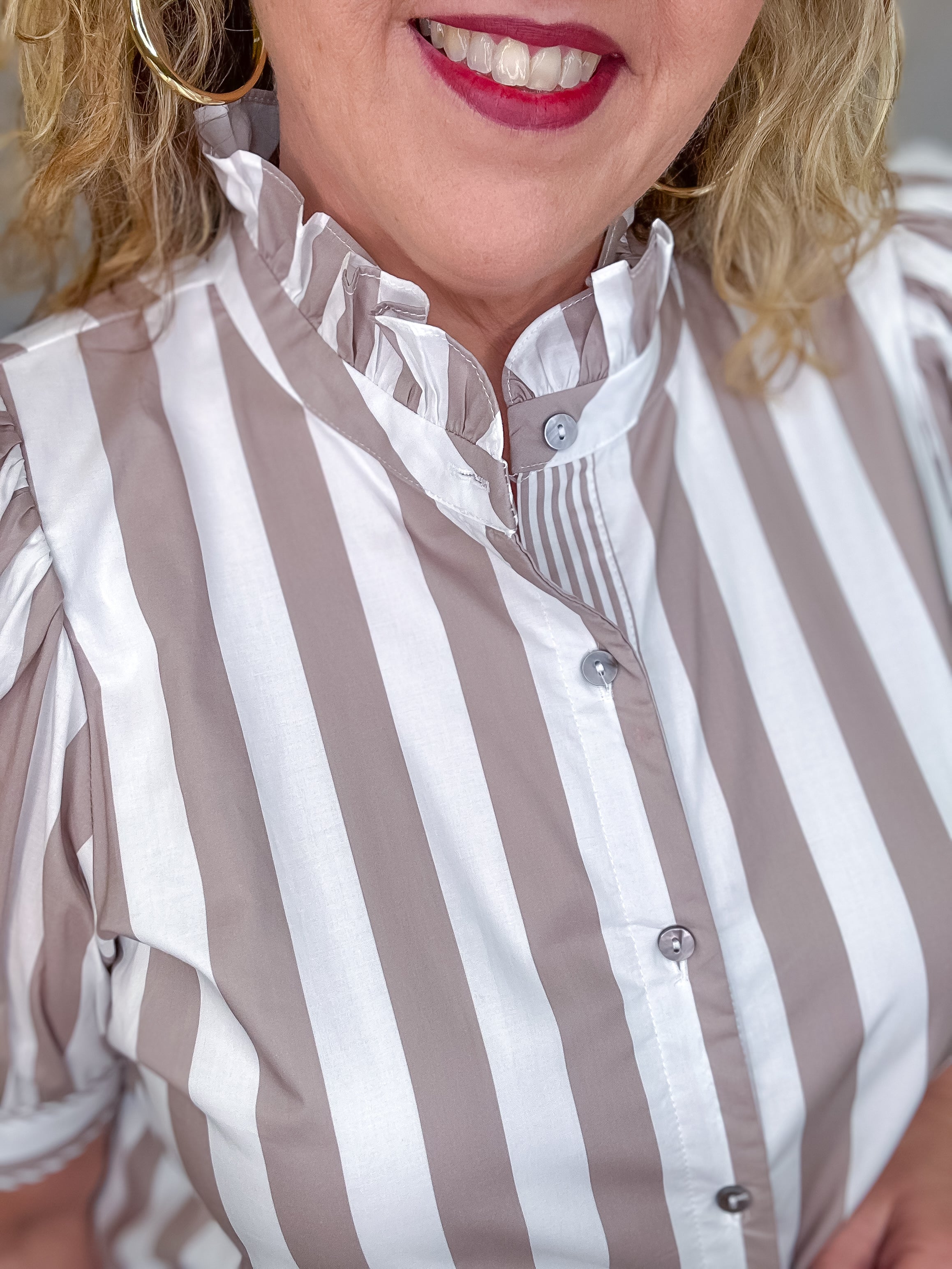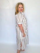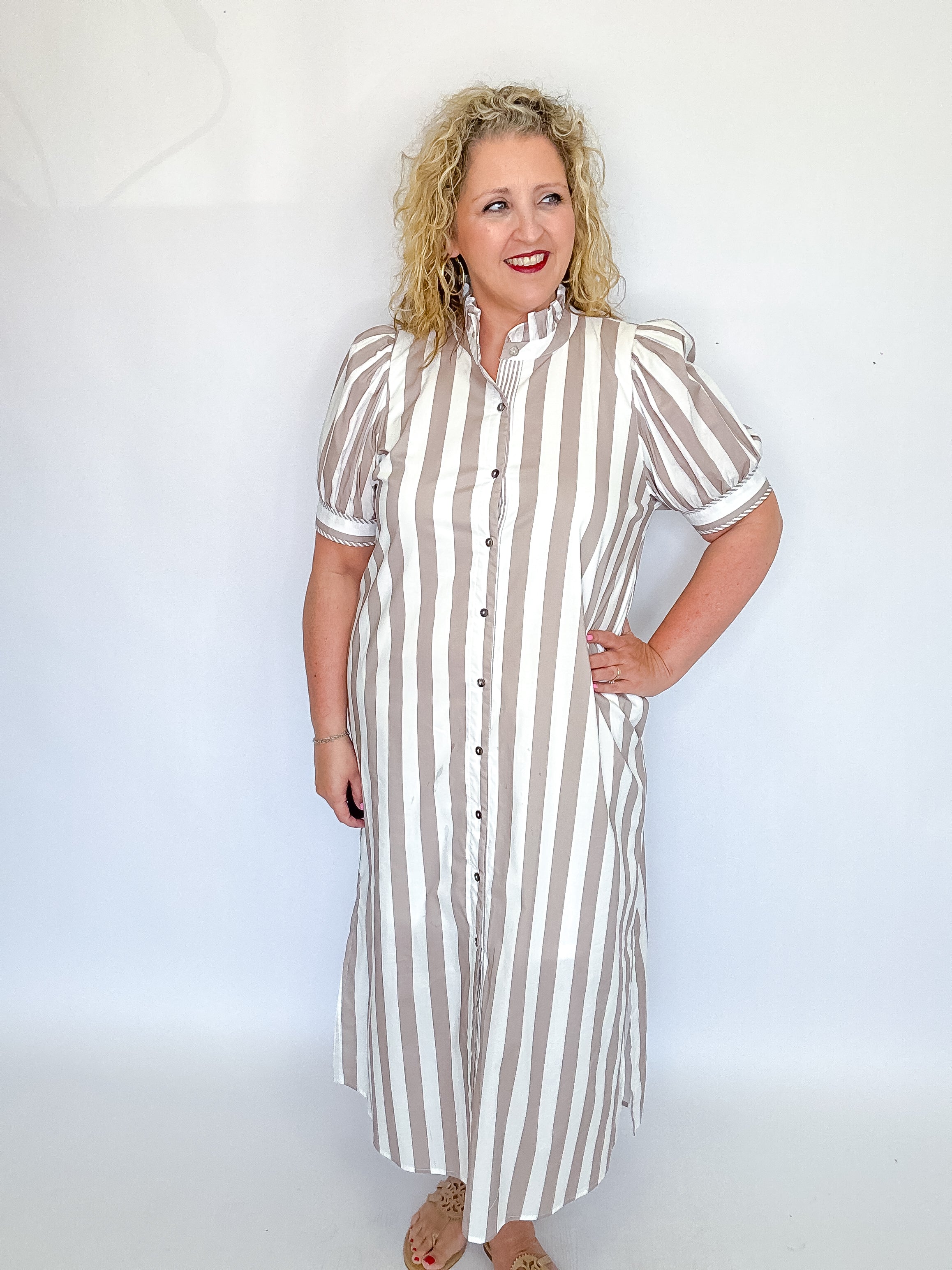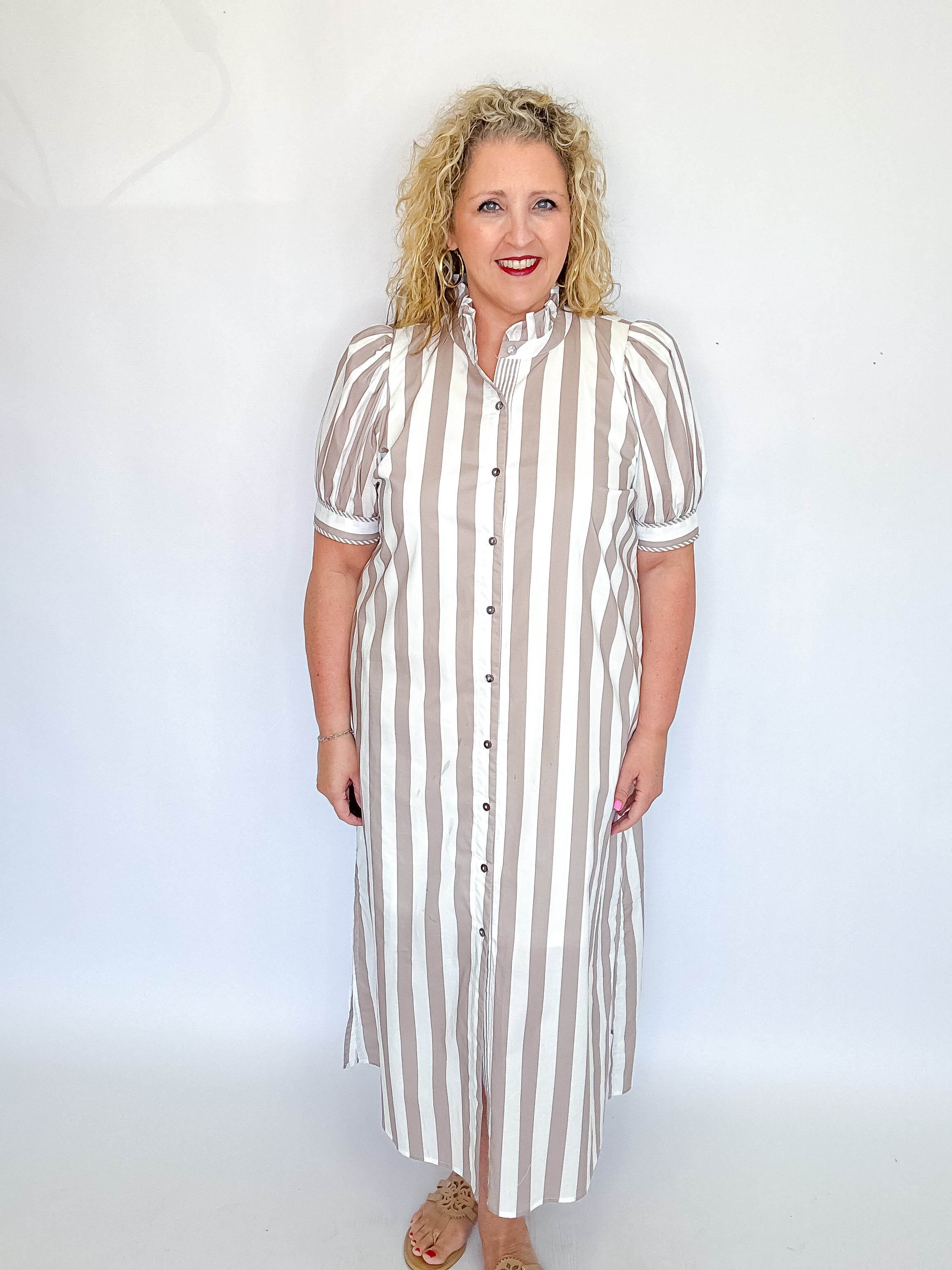 Ivory & Taupe Stripe Ruffled Mock Neck Dress