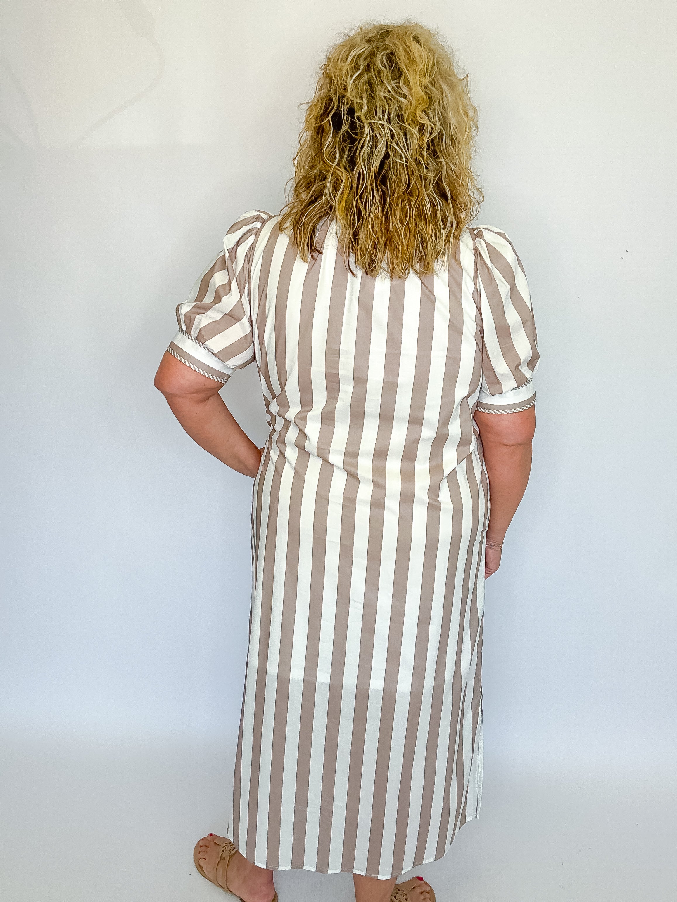 Elevate your wardrobe with this sophisticated striped midi dress, designed for effortless elegance. The charming puff sleeves and ruffled mock neckline add refined detail, while the front button closure provides both style and practicality. Thoughtfully lined and crafted from lightweight woven fabric, this dress offers comfort without compromise. Functional side pockets complete the design, making it perfect for any occasion that calls for polished sophistication.