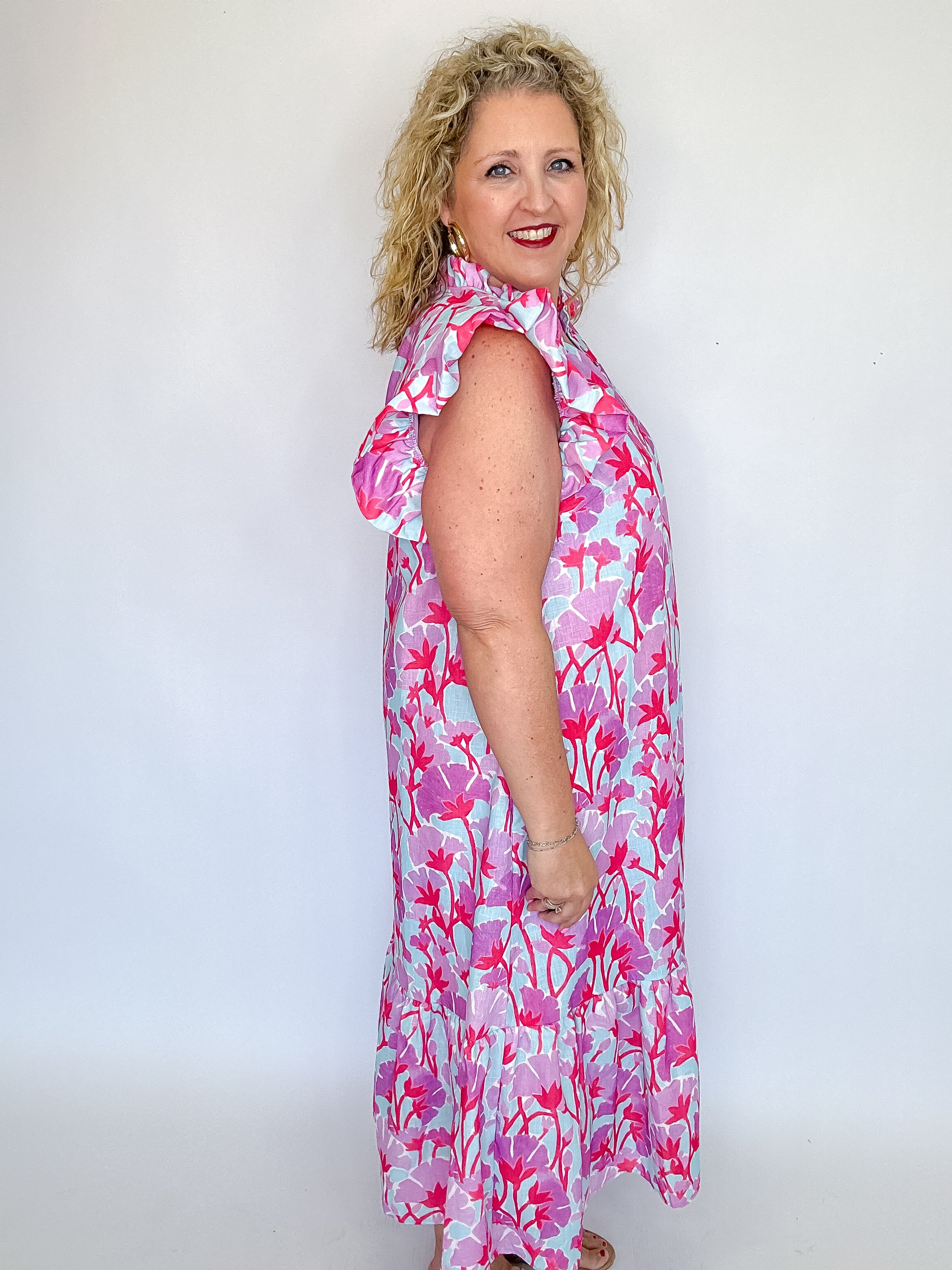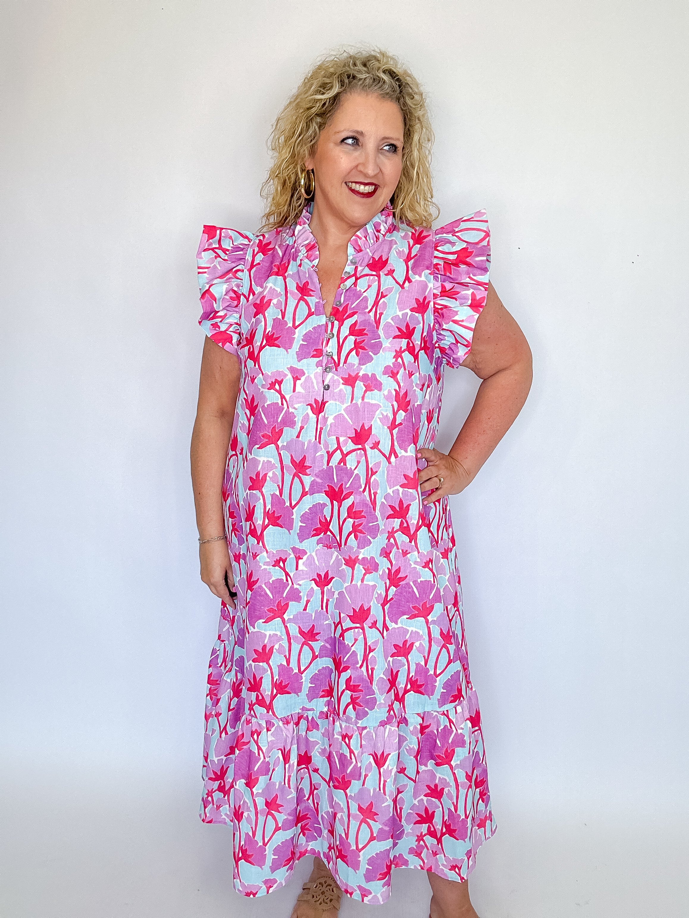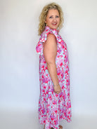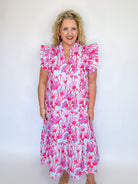 Bloom into spring with this charming floral print midi dress! Featuring delicate flutter sleeves and a playful ruffled mock neckline, this lightweight woven piece is perfect for seasonal celebrations. The front button closure and hidden side pockets add practical style, while the lined, non-sheer fabric ensures comfort and confidence. Whether you're heading to brunch or a garden party, this dress brings fresh, feminine flair to your wardrobe.