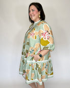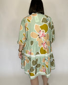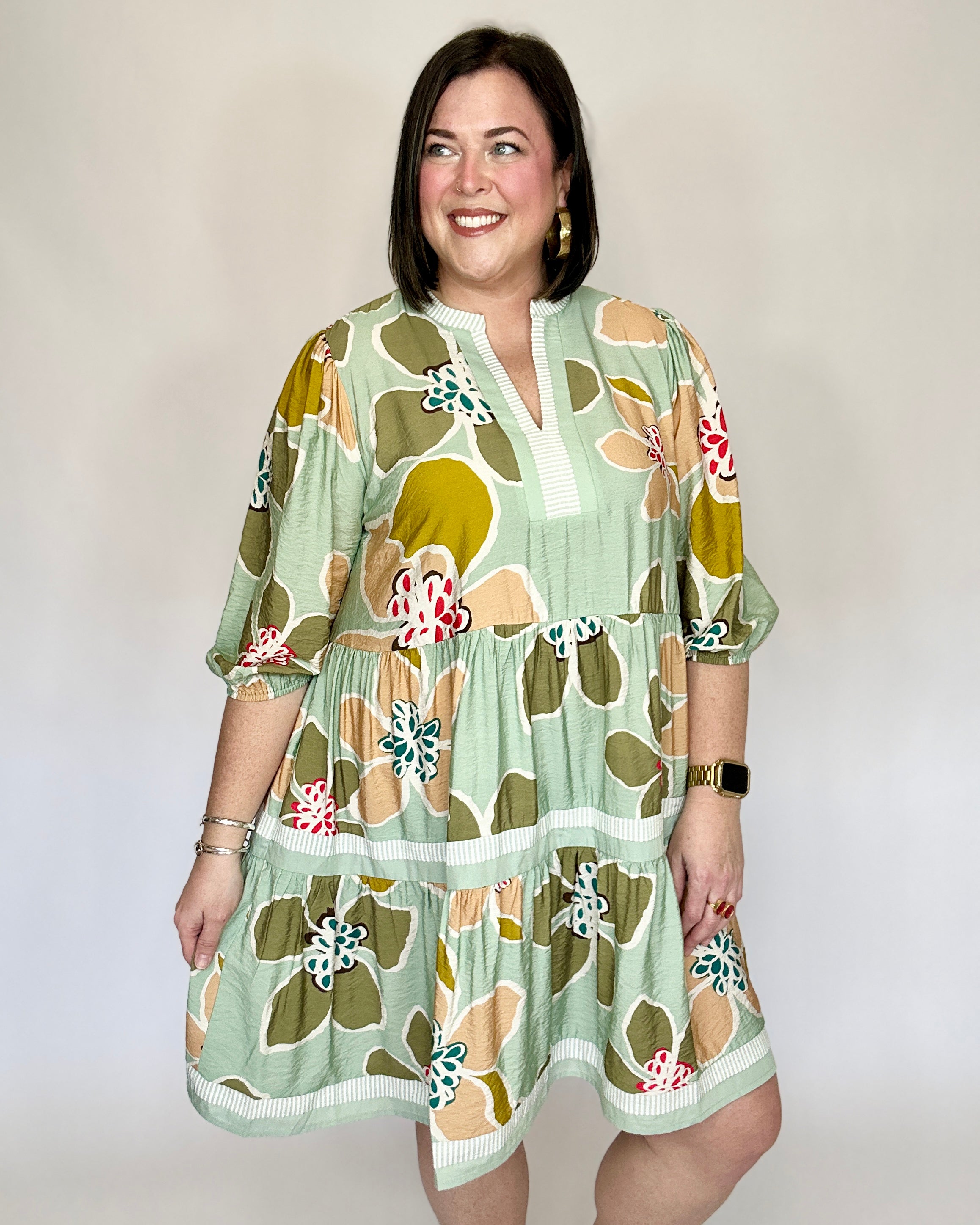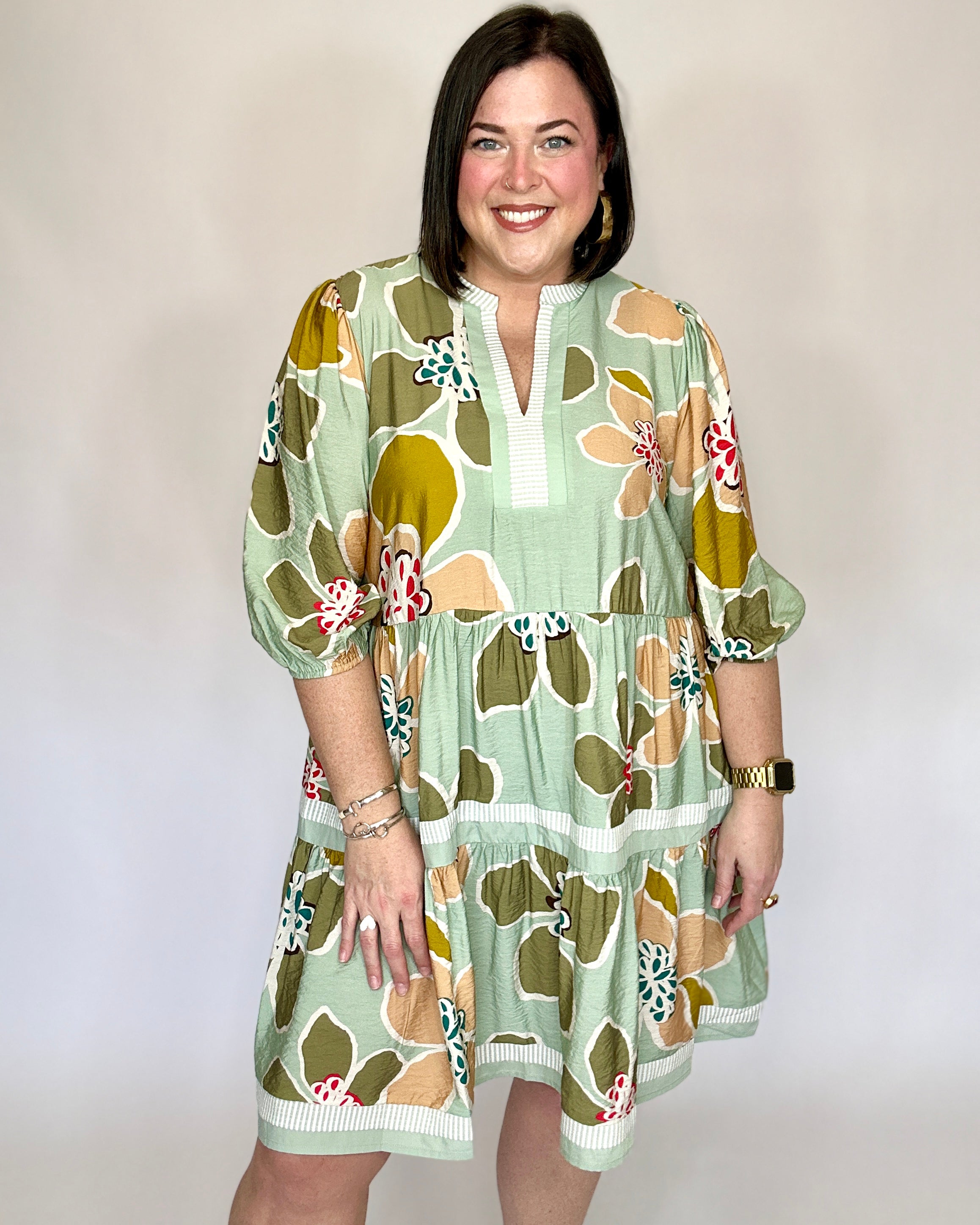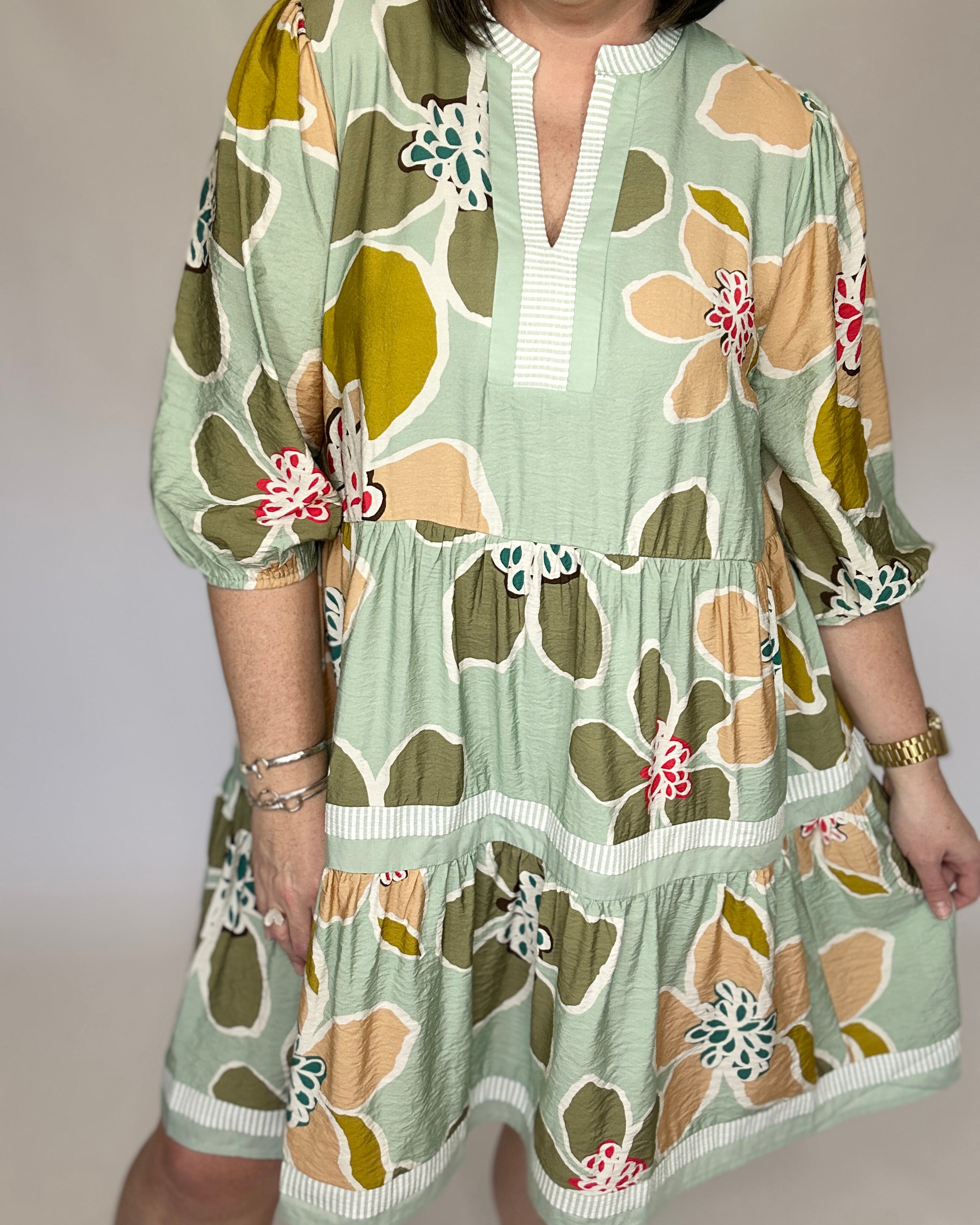 Effortless and flattering with a touch of modern charm. This abstract floral dress features a soft sage base with warm blush, olive, and honey tones for a beautifully balanced, wearable palette. Designed with a split neckline accented by subtle ribbed trim, it has softly puffed 3/4-length sleeves and a tiered skirt that creates easy movement and a flowy silhouette. The lightweight, textured fabric keeps it comfortable while still feeling polished.