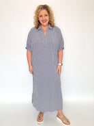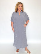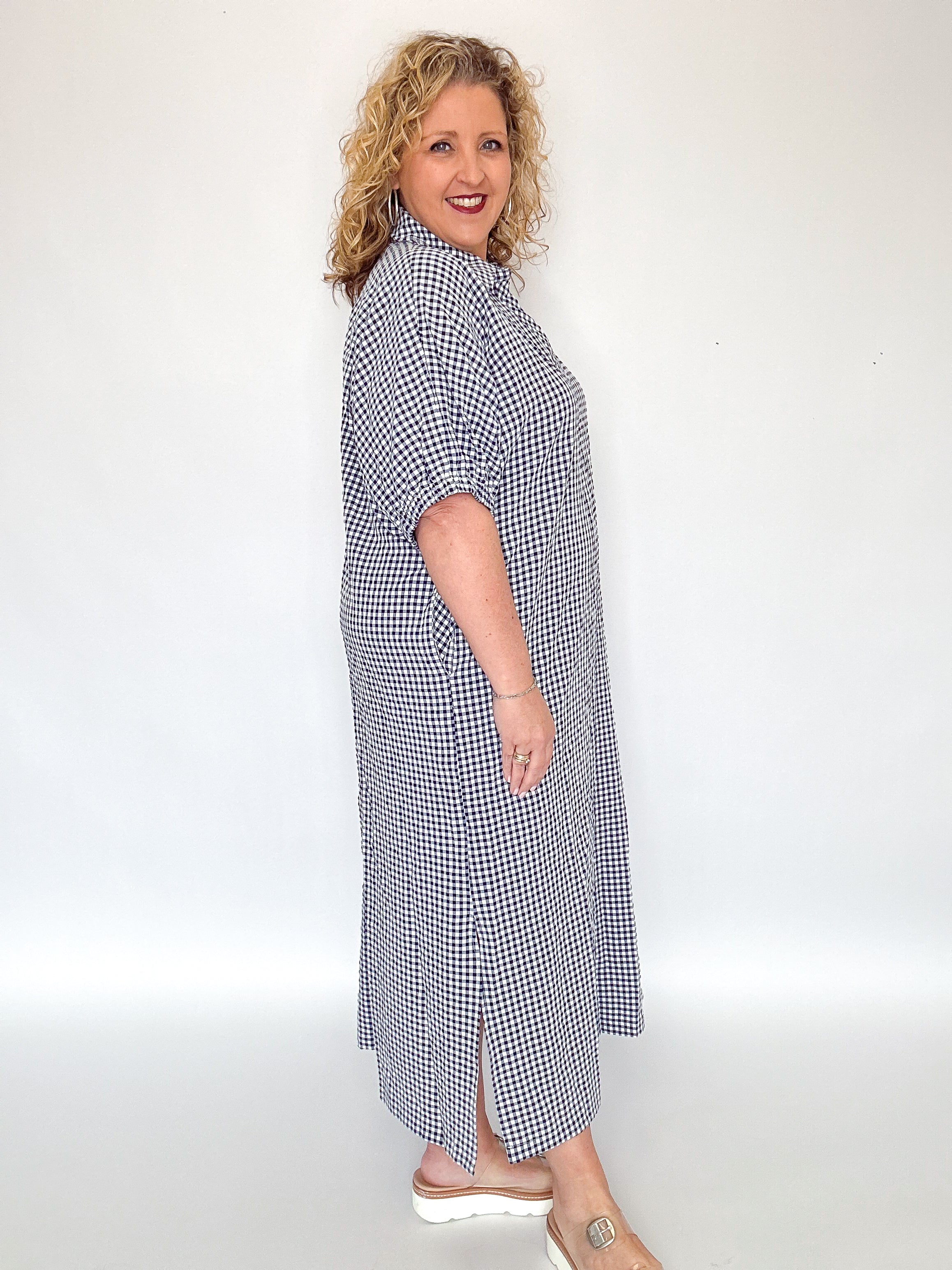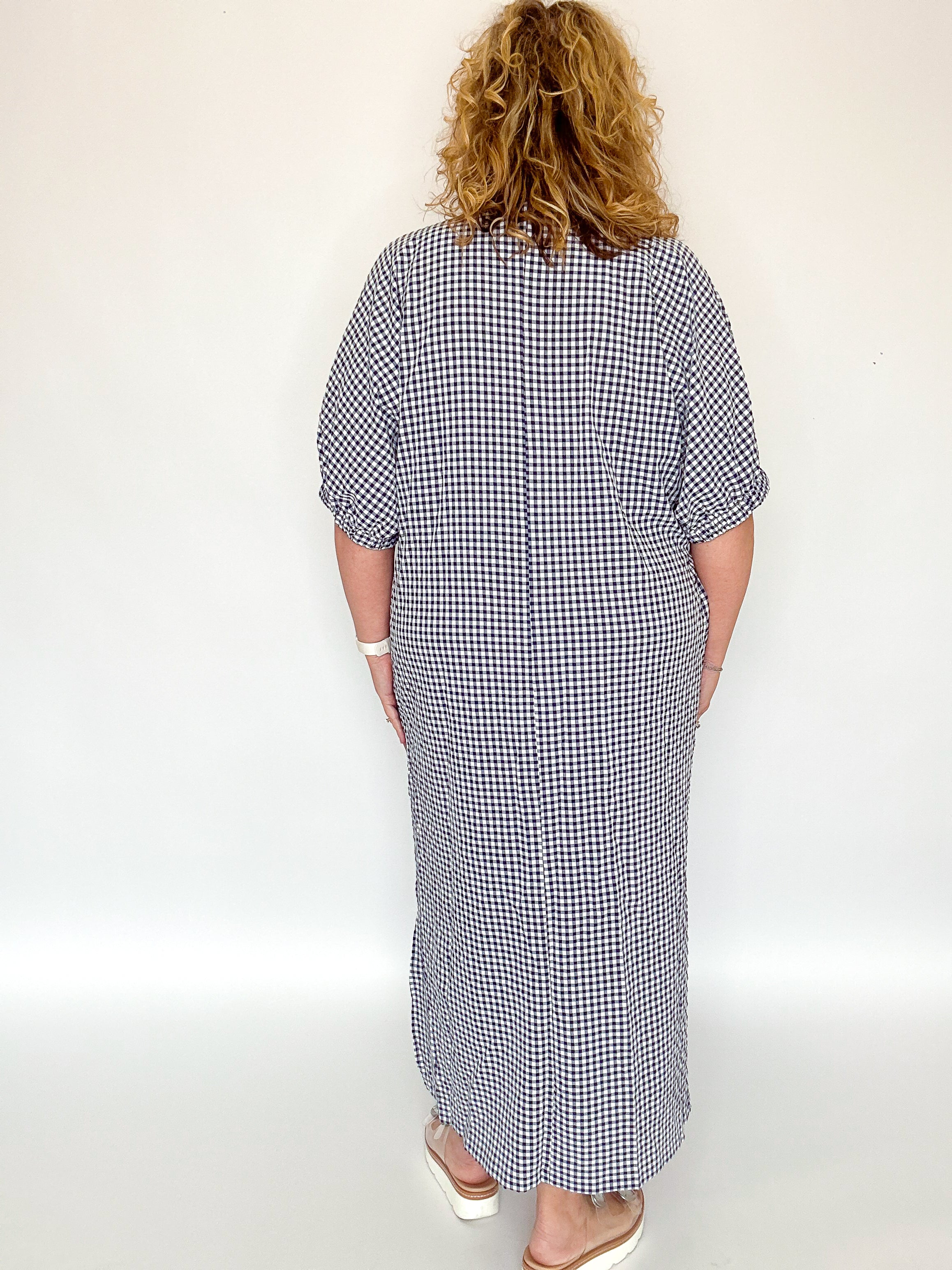 Navy Gingham Side Slit Midi Dress