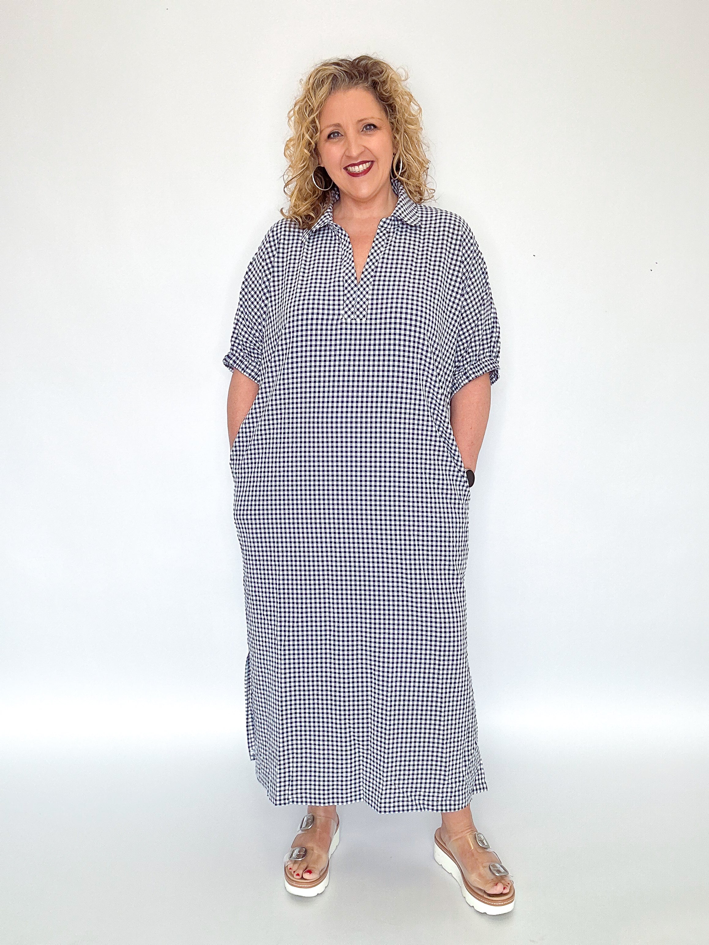 Effortless elegance meets everyday practicality in this gingham check midi dress from Entro. The classic woven pattern pairs beautifully with a refined V-neckline and crisp collar, while cuffed short sleeves add a polished touch. Functional side pockets provide convenient storage without compromising the silhouette. Lightweight and unlined for breathable comfort, this non-sheer piece transitions seamlessly from casual outings to relaxed social gatherings. A timeless wardrobe essential that balances sophistication with wearable ease.