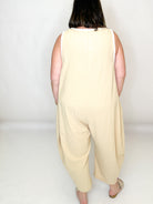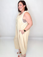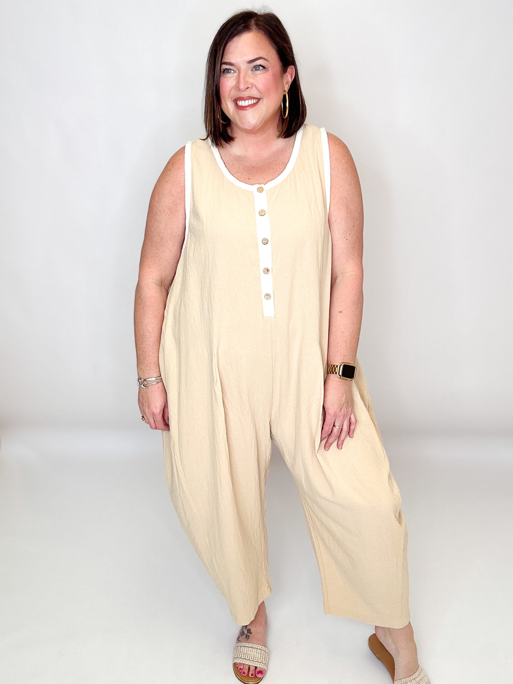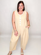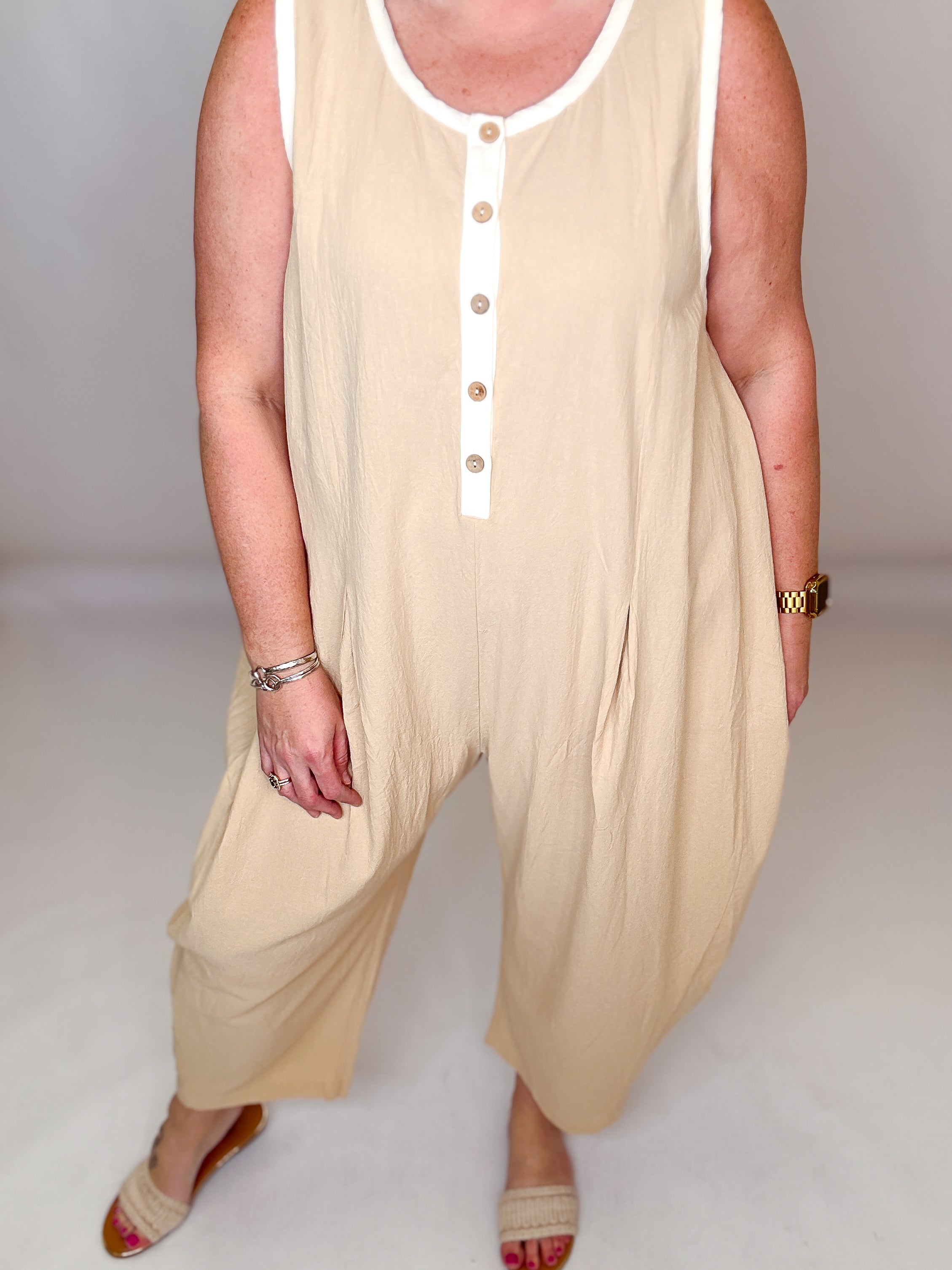 Throw on effortless cool with this oatmeal sleeveless jumpsuit from Oddi. The contrast binding neckline and front button placket add just enough structure to keep things interesting, while the slouchy straight legs deliver that relaxed, lived-in vibe. Perfect for casual days when you want to look put-together without trying too hard.