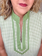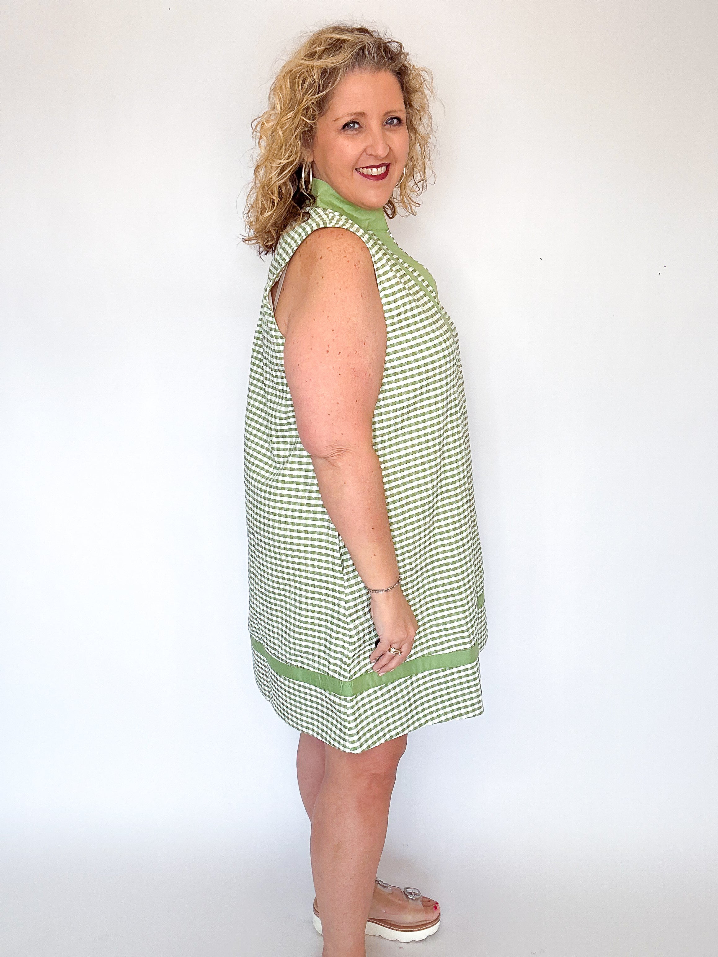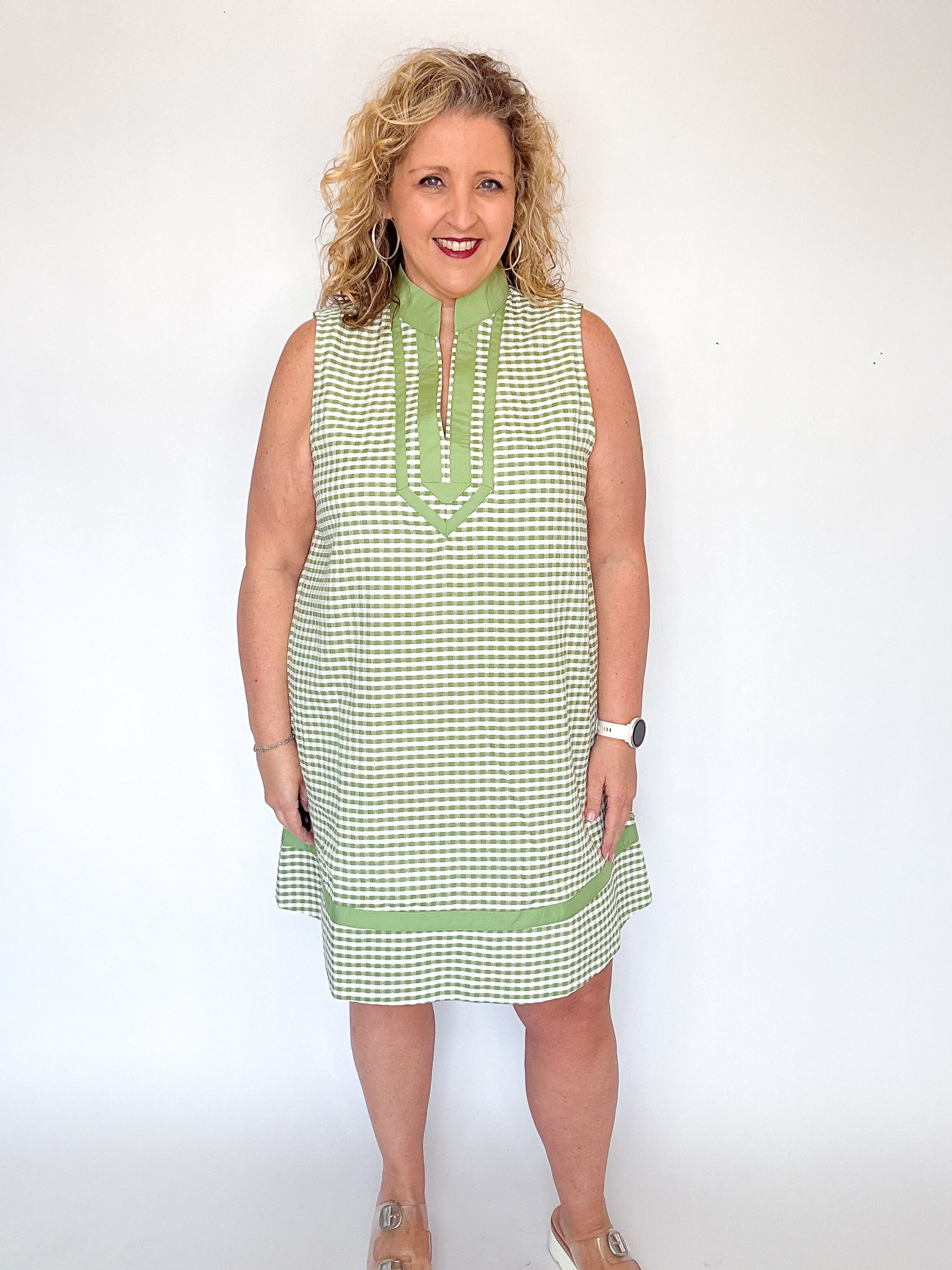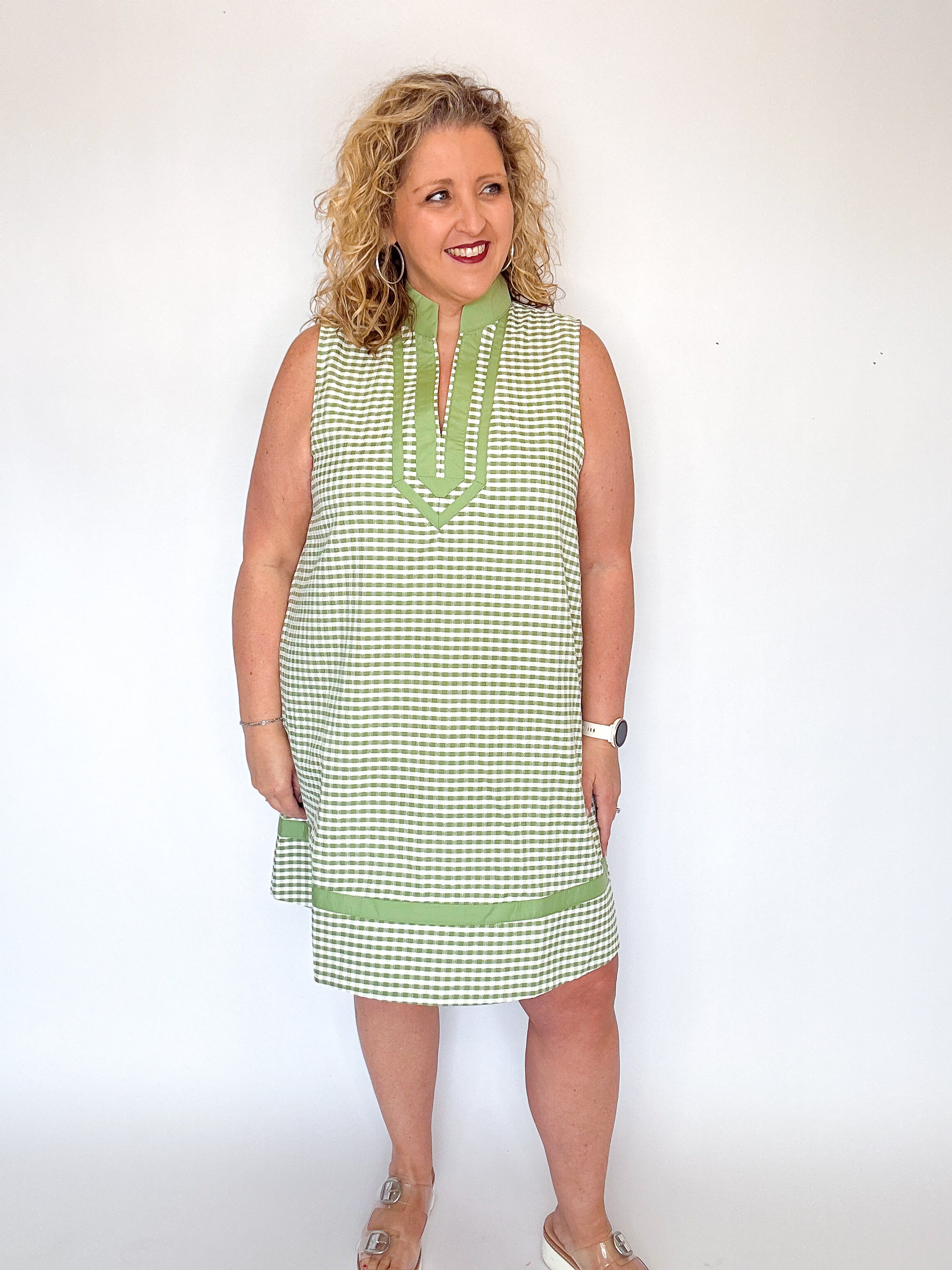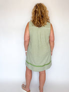 Lightweight and breezy, this olive and white seersucker dress is an effortless warm weather staple.  Designed with a relaxed silhouette, it features a split V-neckline with contrast trim and a coordinating banded hen for a polished finish.  The textured seersucker adds subtle dimension while keeping things cool and comfortable - perfect for everyday wear, vacations, or casual outings.