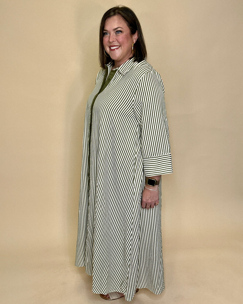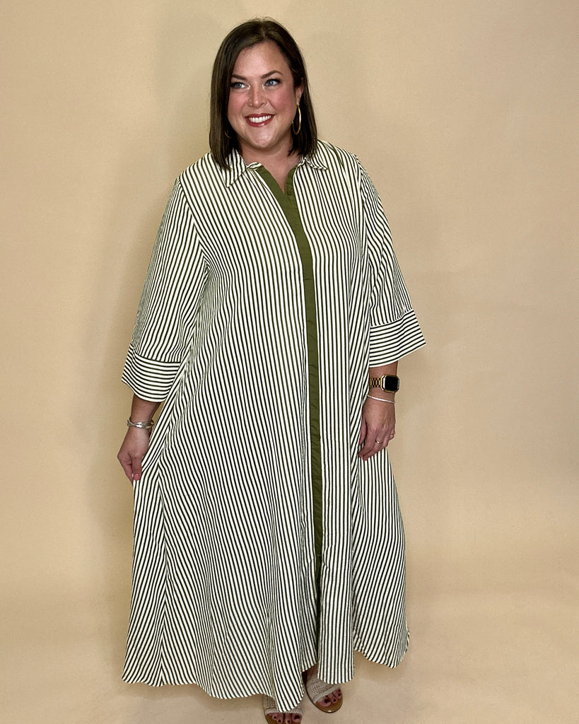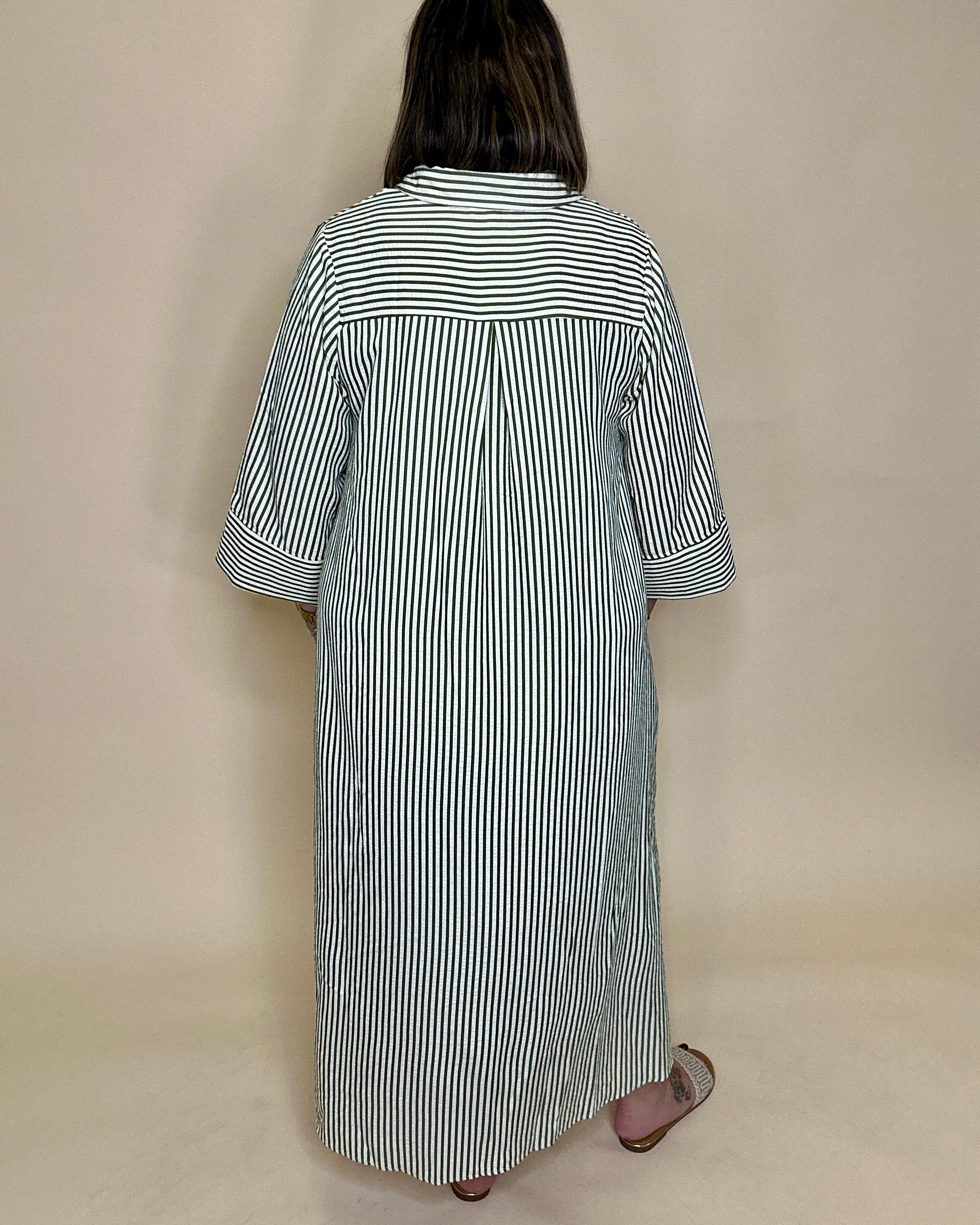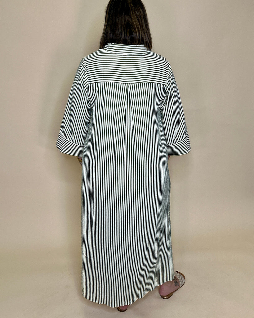 This striped maxi dress offers a refined balance of style and practicality with its 3/4 sleeves and hidden front button closure. Crafted from lightweight woven fabric, it features a classic shirt collar and convenient side pockets, enhancing functionality without compromising elegance. The unlined design ensures comfort and breathability, while the non-sheer material maintains modesty and quality. Perfect for versatile wear, this dress is a sophisticated addition to any wardrobe.