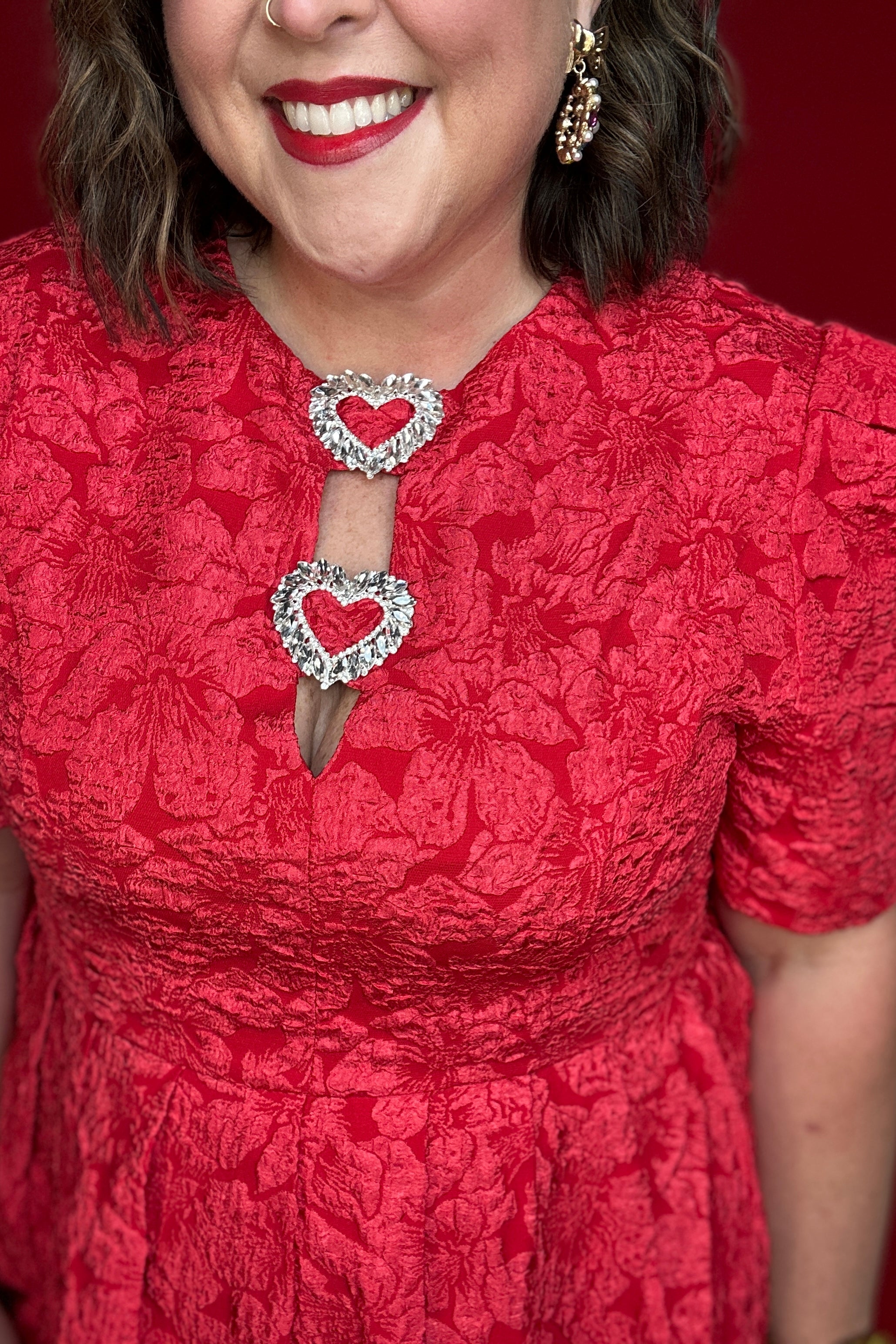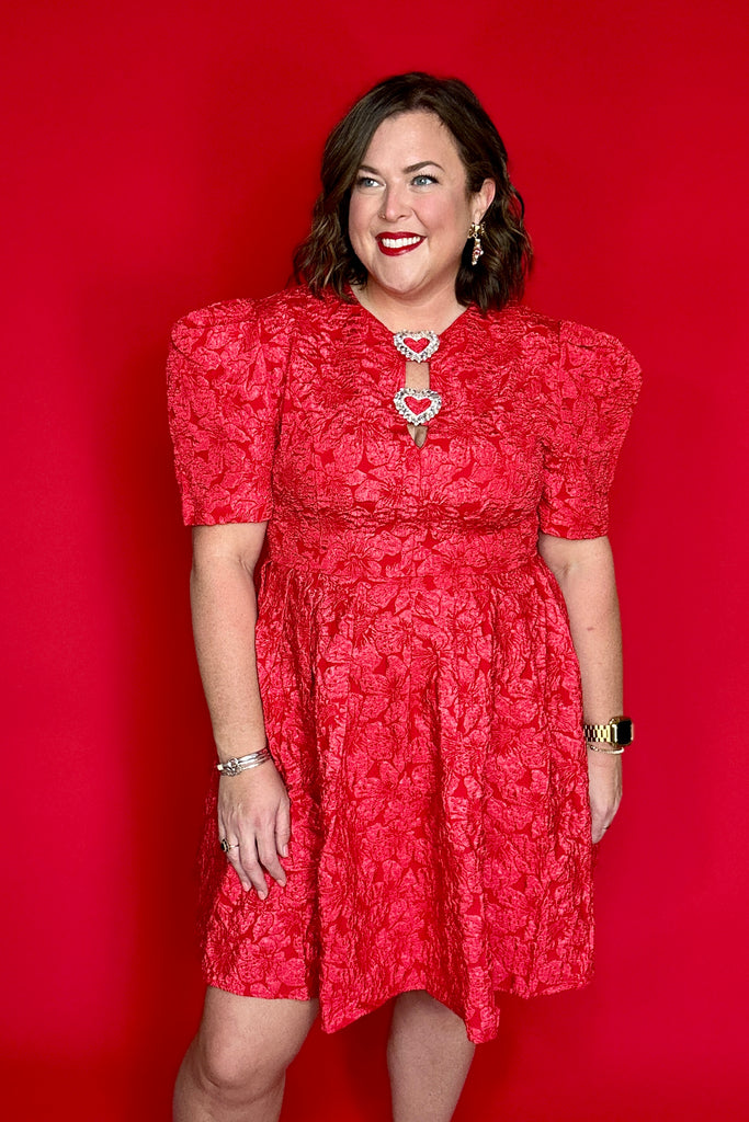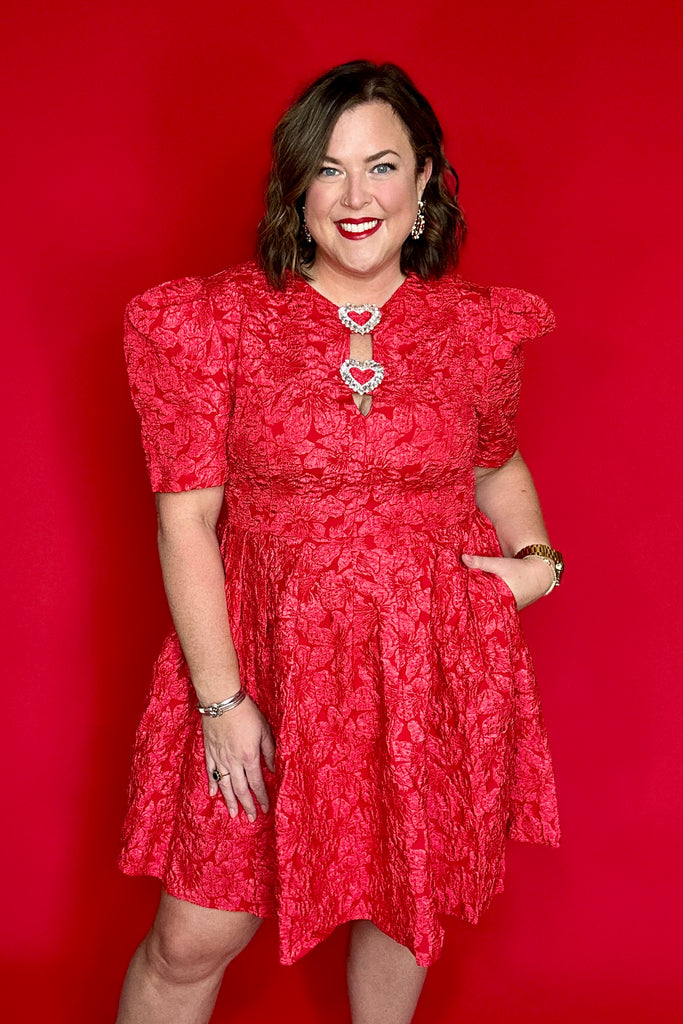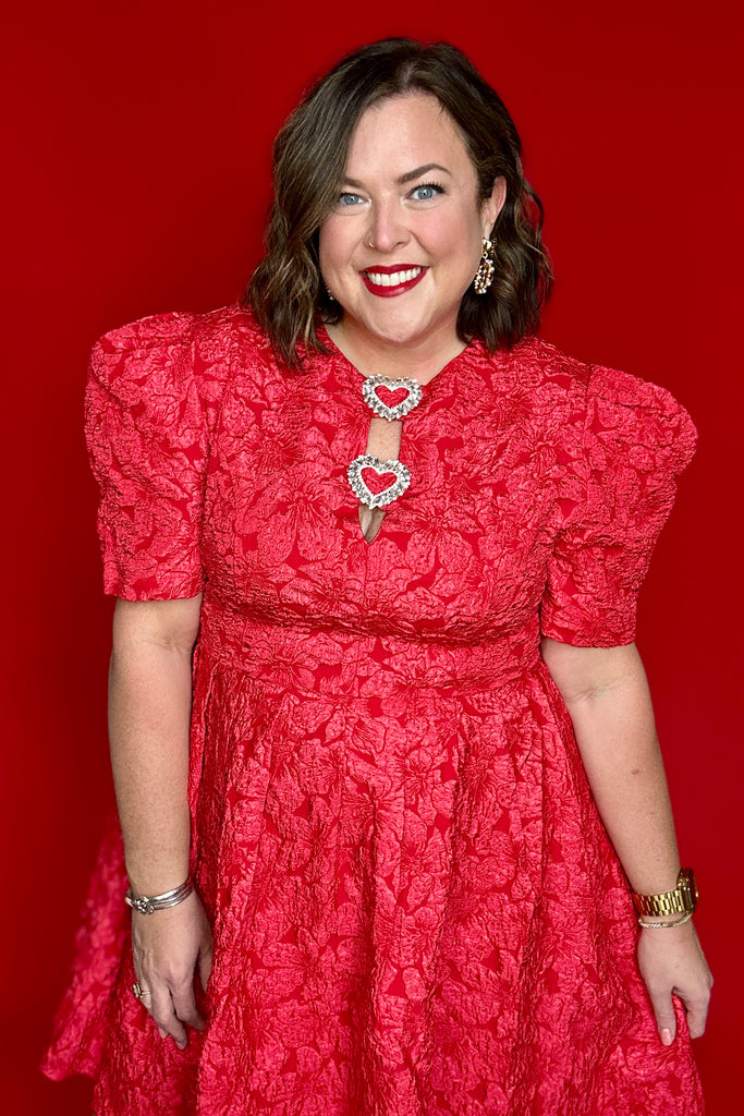 This Jacquard puff sleeve mini dress from Oddi features a fitted waist and a pleated skirt that elegantly accentuates your silhouette. Delicate heart-shaped rhinestone trim adds a refined touch of sparkle, making it perfect for sophisticated occasions. The textured fabric and tailored design offer timeless charm with modern flair.