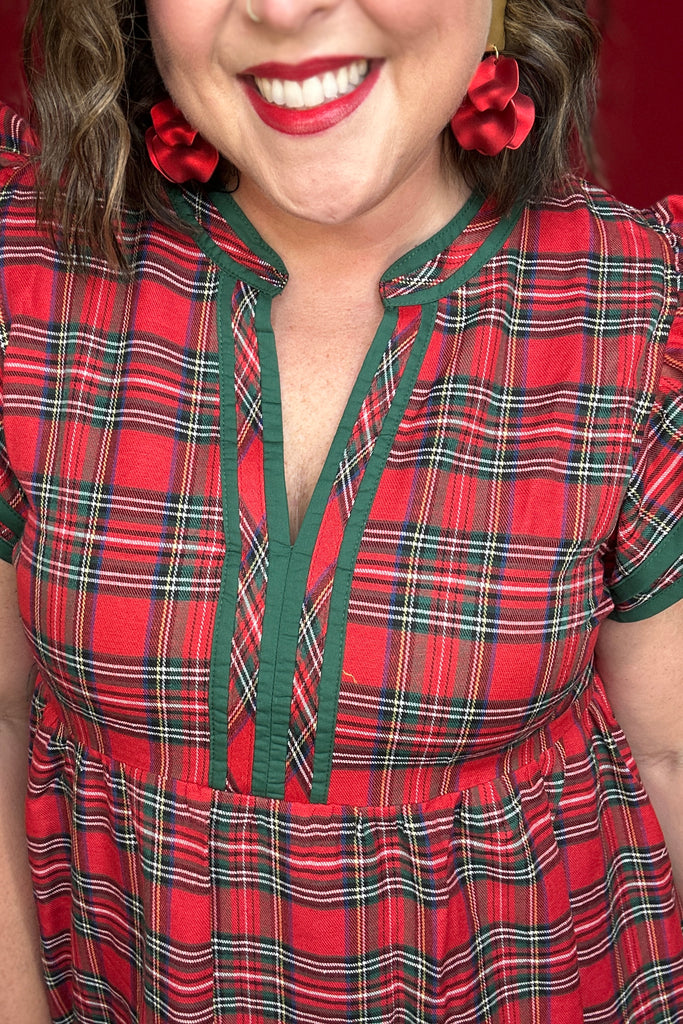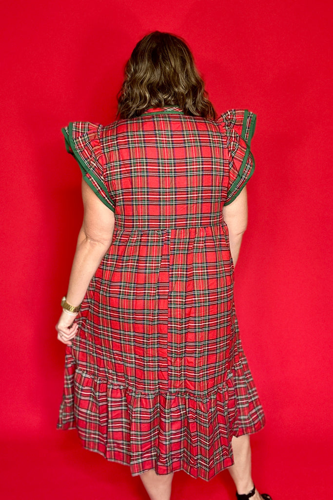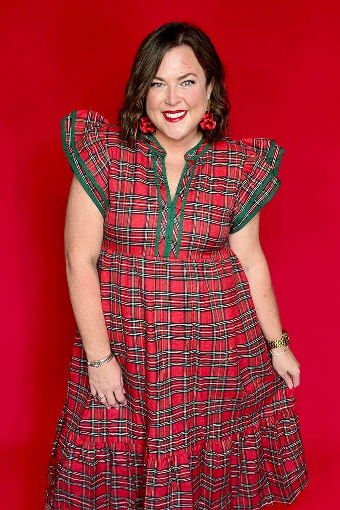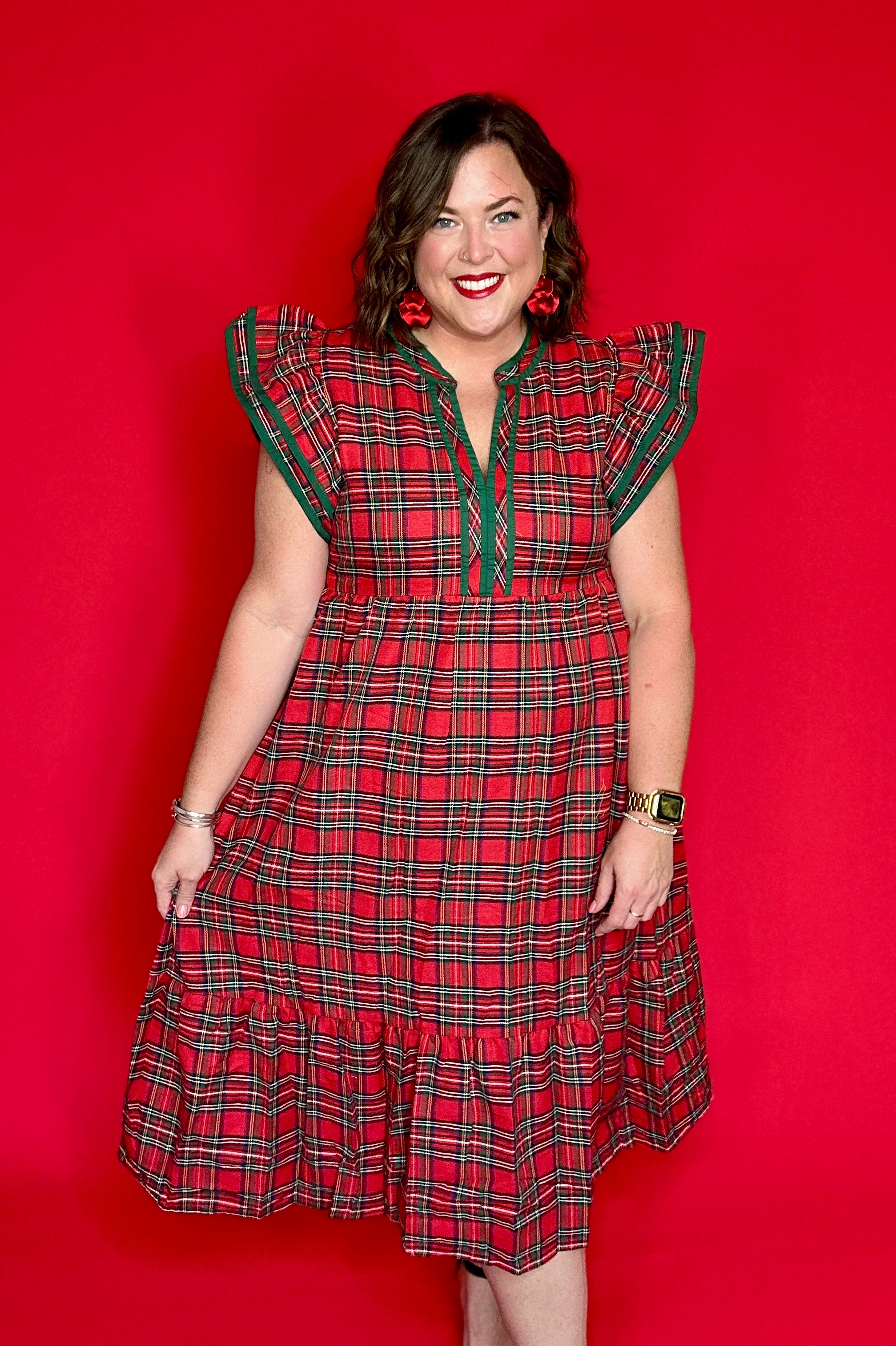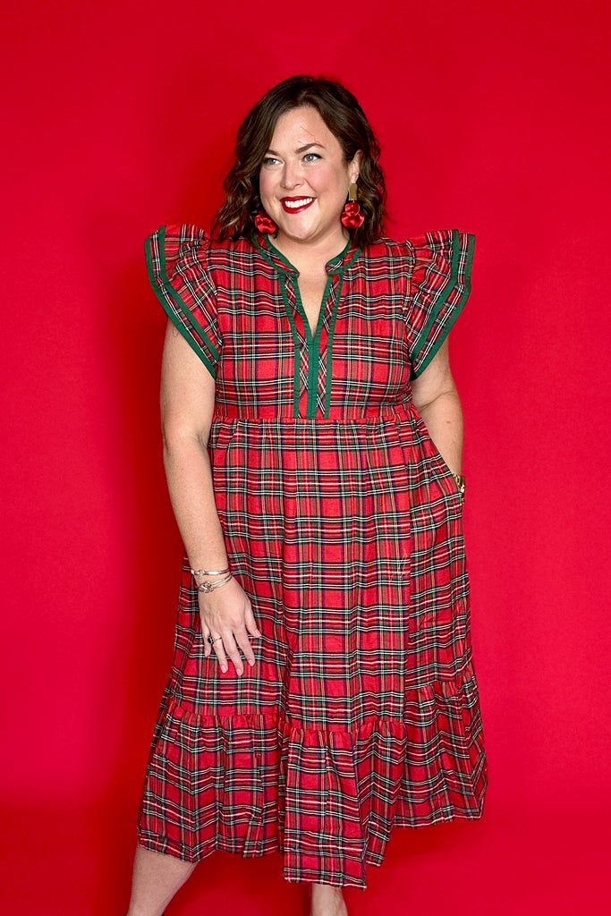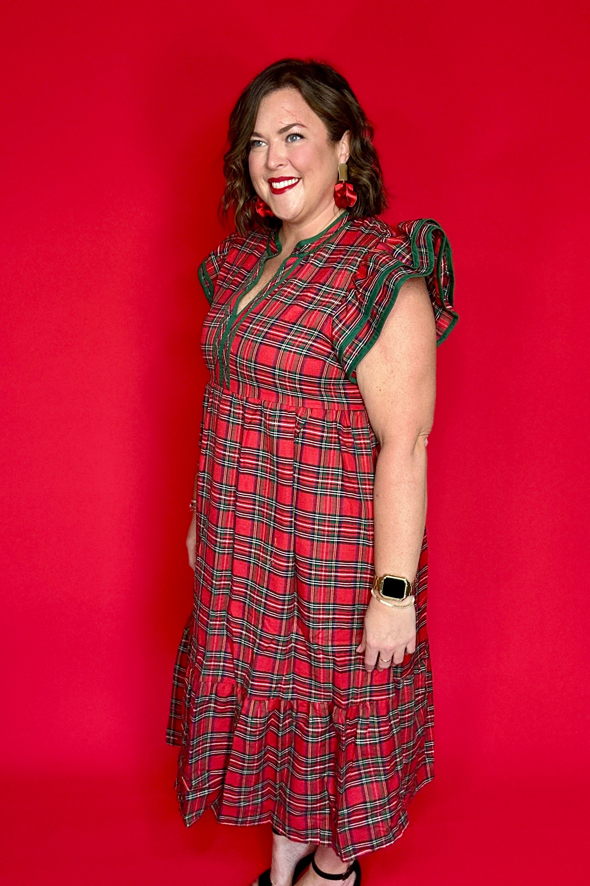 This plaid flutter sleeve midi dress combines effortless style with practical comfort. Featuring a flattering V-neck and eye-catching contrast binding, it adds subtle detail to your look. Lightweight and fully lined, it ensures modesty without bulk, while convenient side pockets provide easy storage. Crafted from woven fabric, this non-sheer dress is perfect for day-to-night wear when you want to feel confident and comfortable.