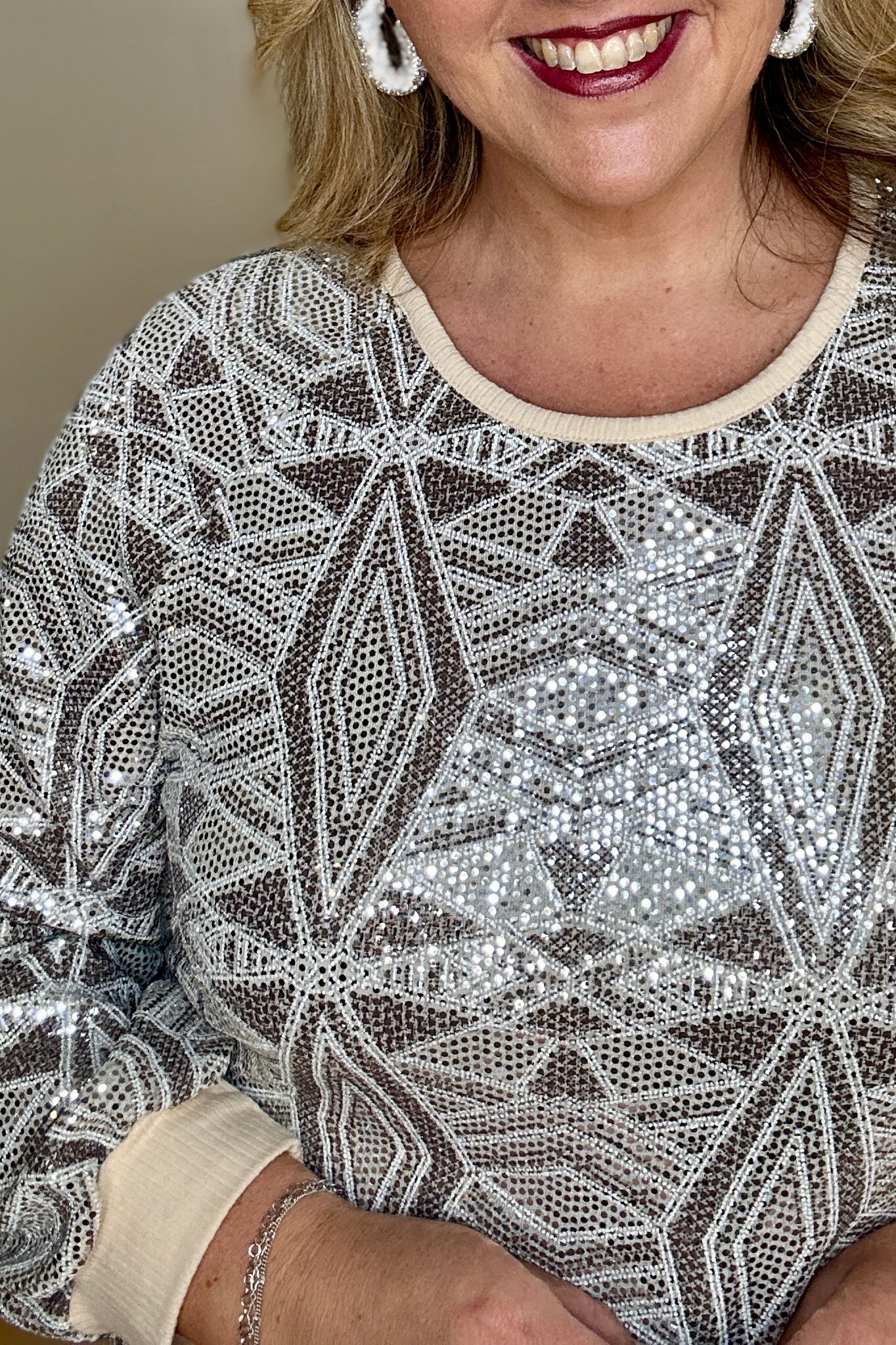 Elevate your evening wardrobe with this Silver Sequin Geometric Dress by Sew In Love. Featuring a shimmering geometric sequin overlay, it elegantly catches the light with every movement. The relaxed fit paired with a soft knit lining ensures comfort without compromising style. Long sleeves with ribbed cuffs add a refined, casual-chic detail to this sophisticated, radiant piece perfect for any special occasion.