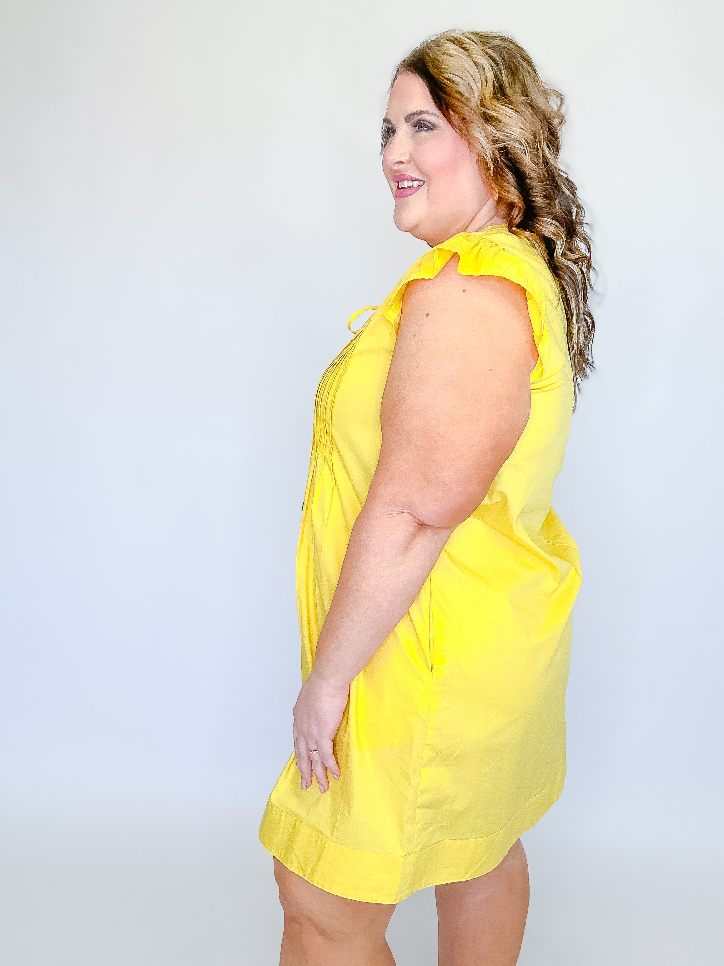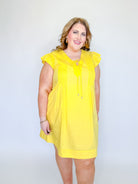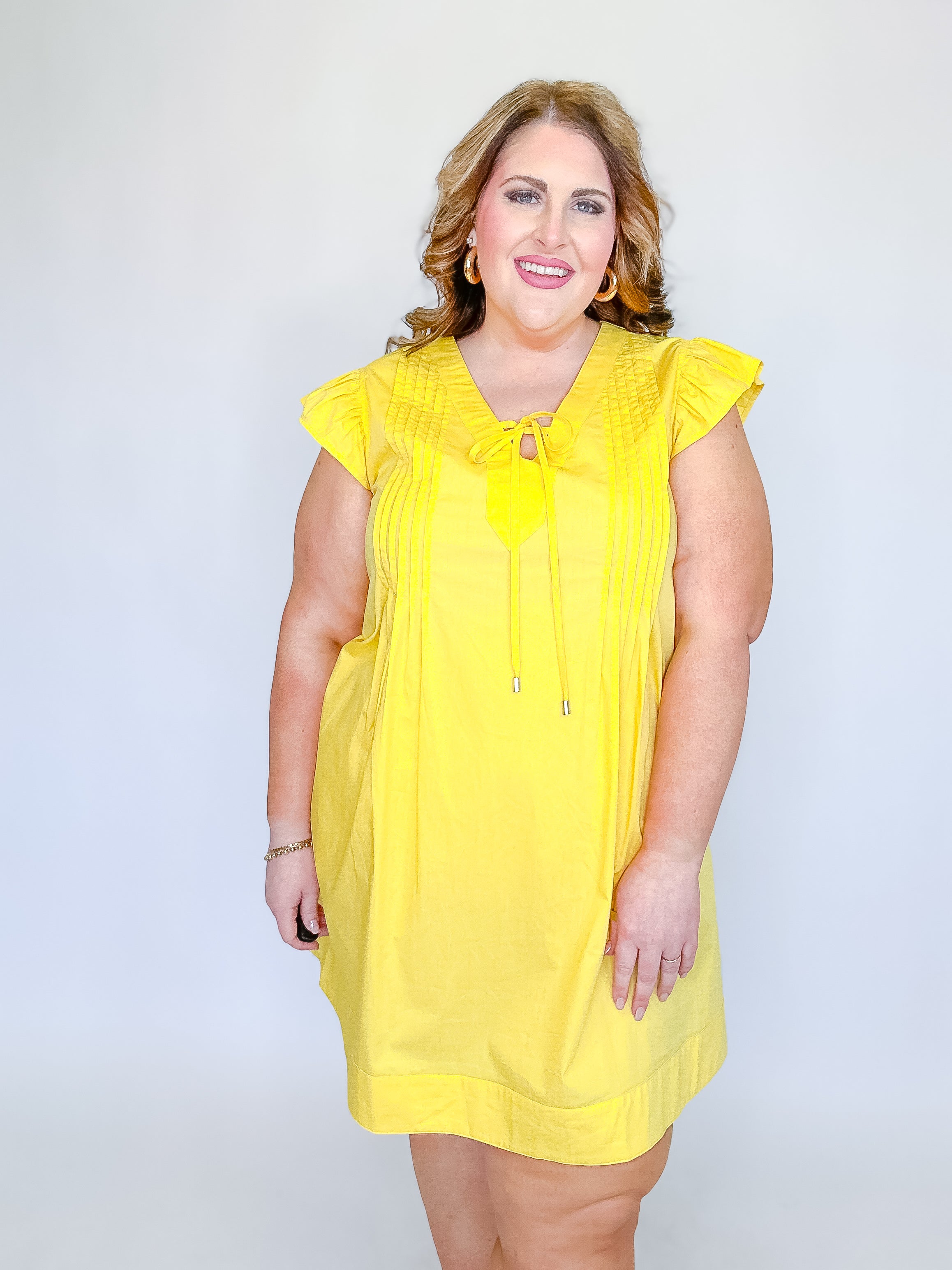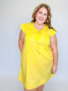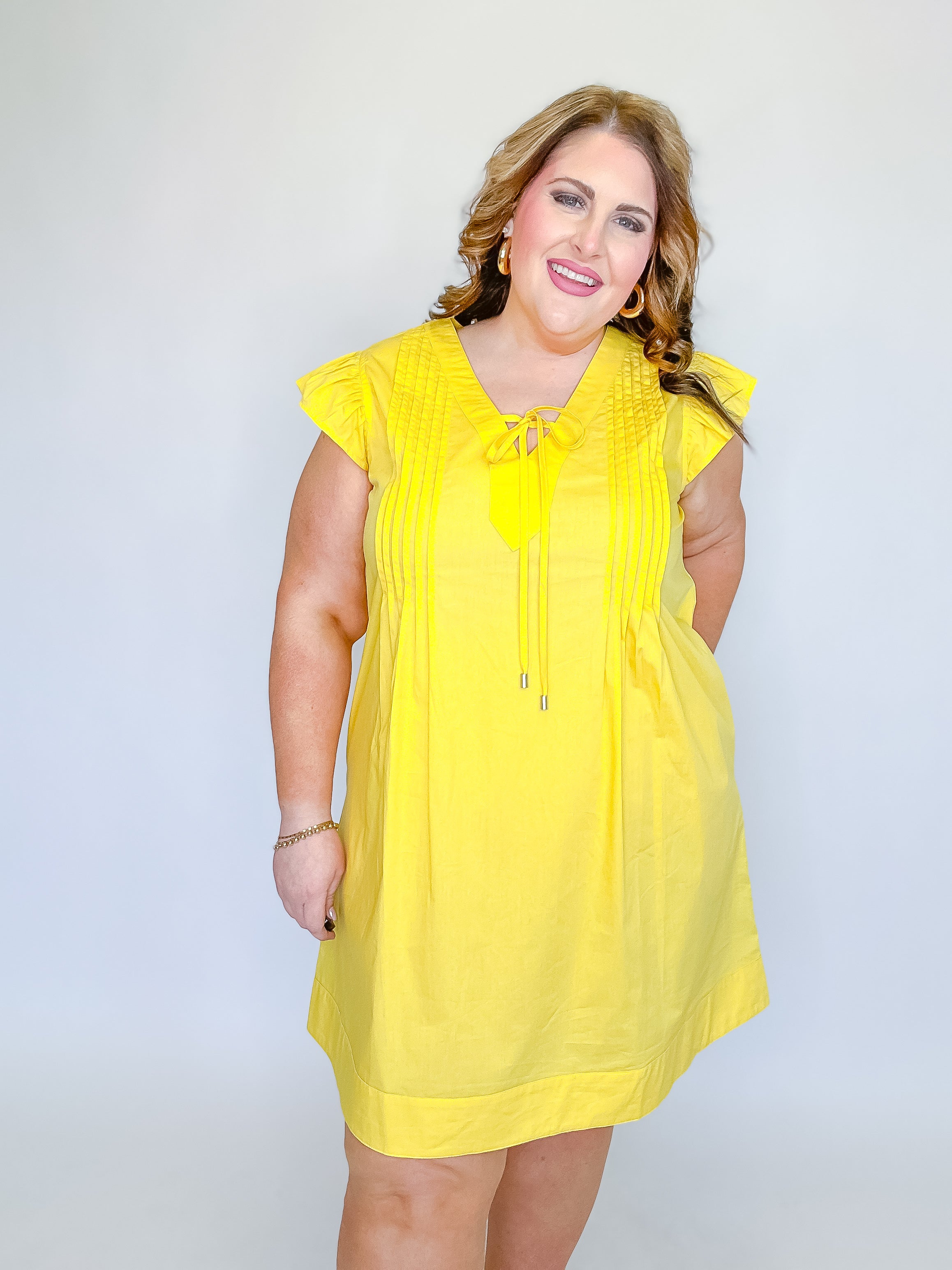 Fresh, feminine, and effortlessly charming, this solid poplin dress is a go-to for warm, sunny days. Designed with soft flutter sleeves and delicate pintuck front panels, it adds subtle texture and flattering detail to an easy silhouette. The tie-front neckline creates a customizable fit while adding a sweet finishing touch. Lightweight and breathable, this dress is perfect for brunch, casual outings, or weekend getaways—just add sandals or wedges for an instantly put-together look.