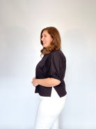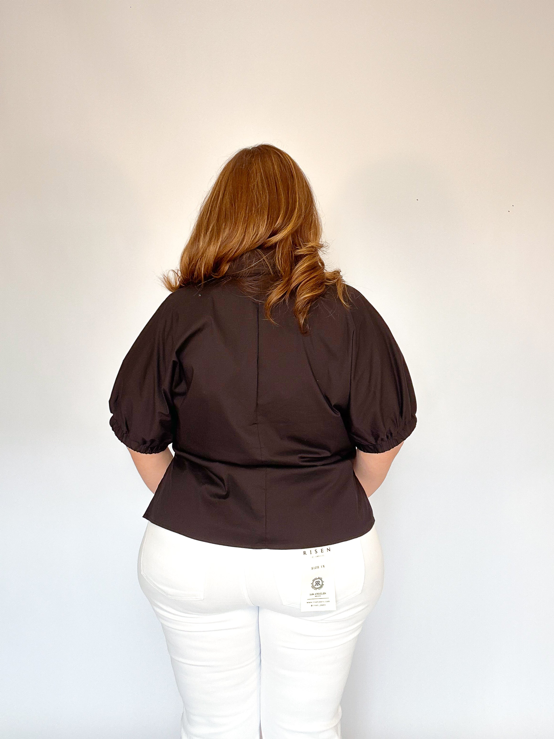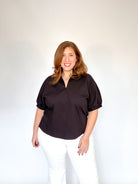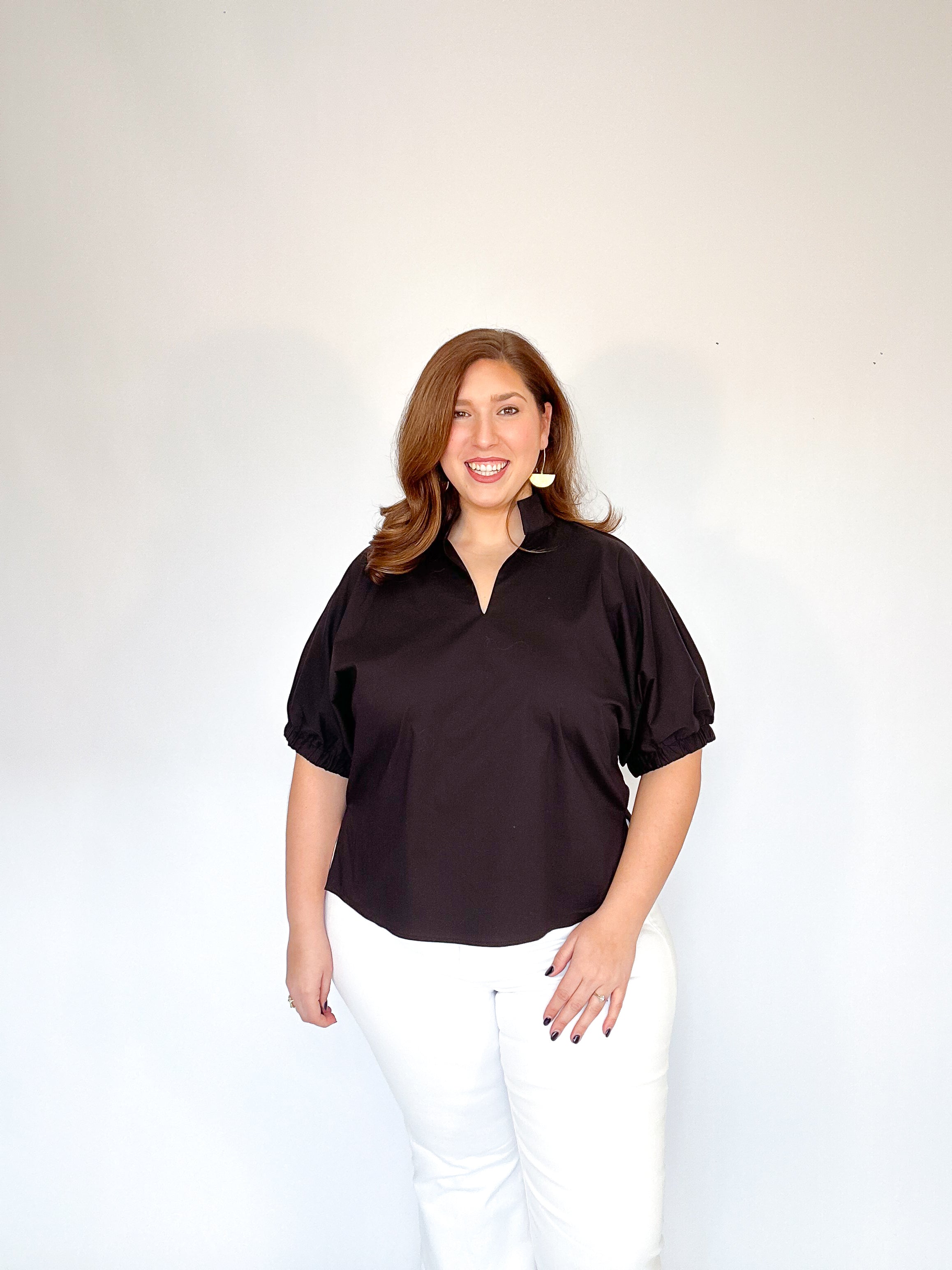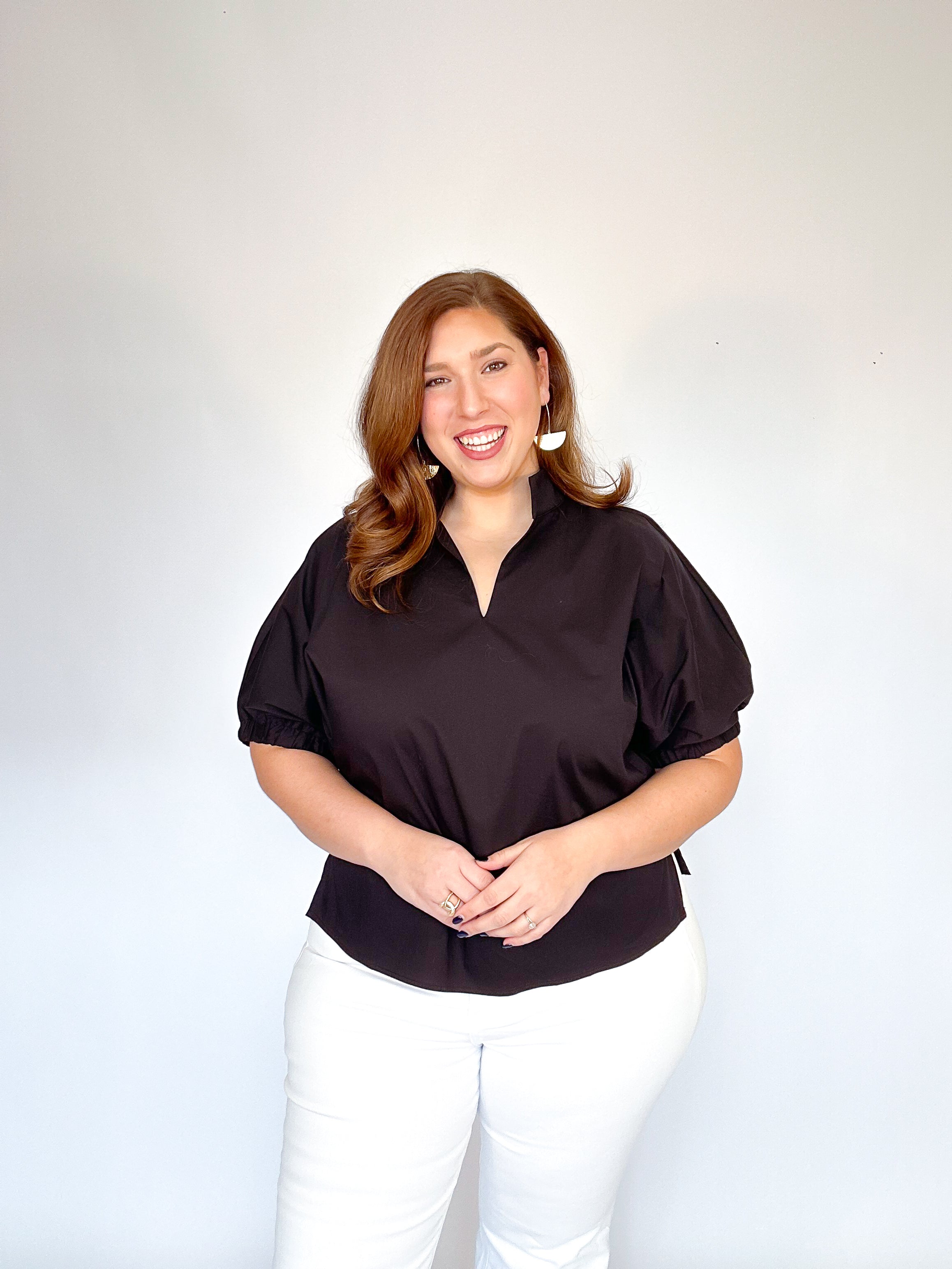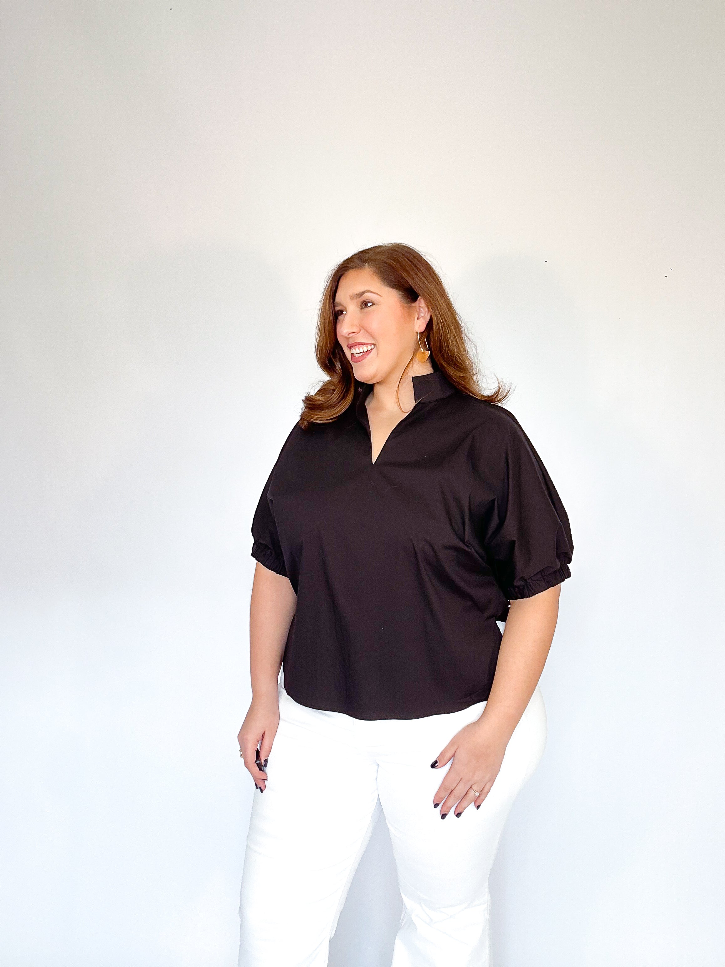 This Black Puff Sleeve Mock Neck Top from Entro combines structured silhouette with refined simplicity. The standing collar and V-neck create a modern neckline, while puff sleeves add dimension without bulk. Crafted from lightweight woven fabric that's non-sheer and unlined, this piece offers breathable comfort and versatile layering potential. A polished essential for contemporary wardrobes.