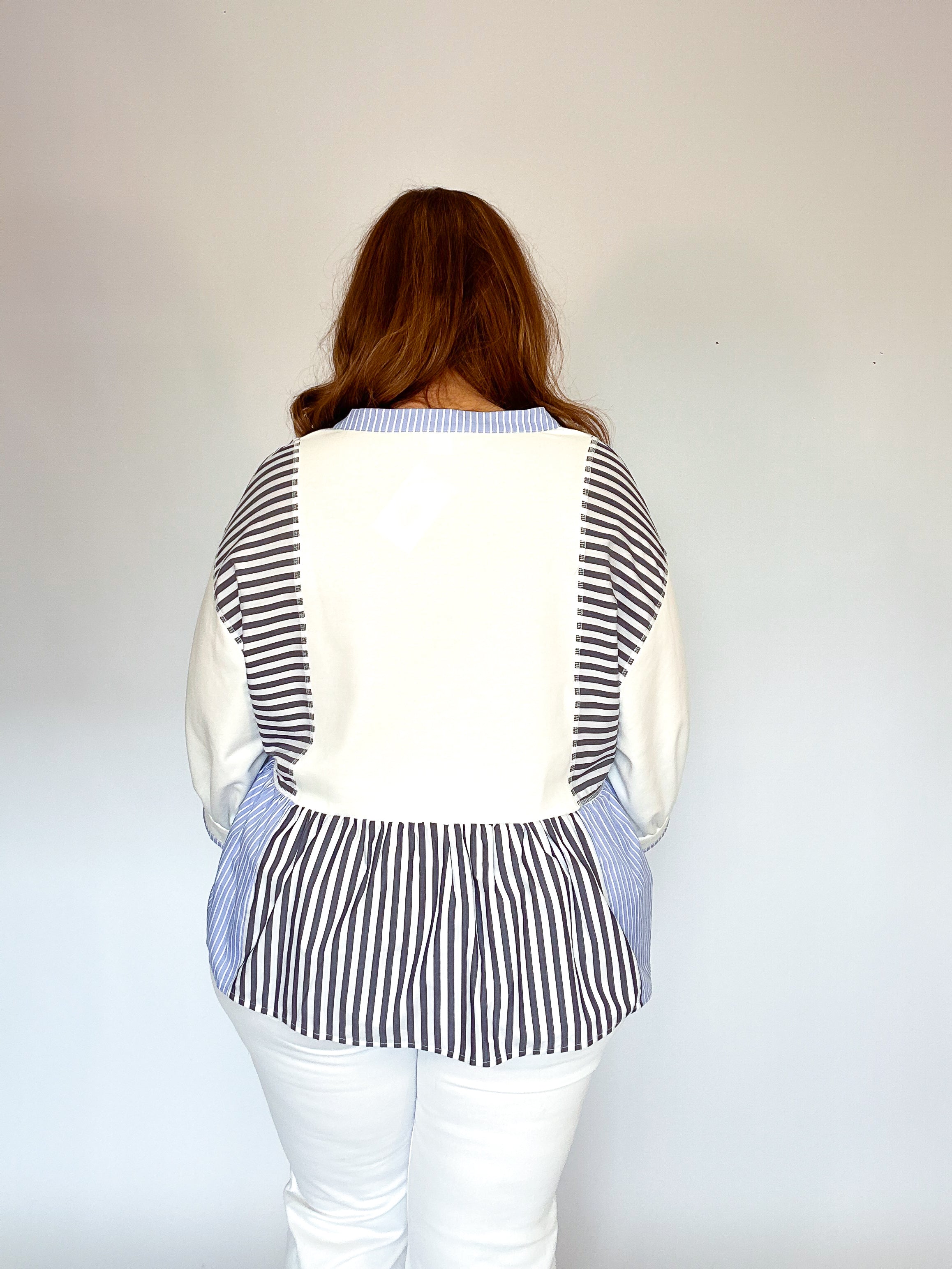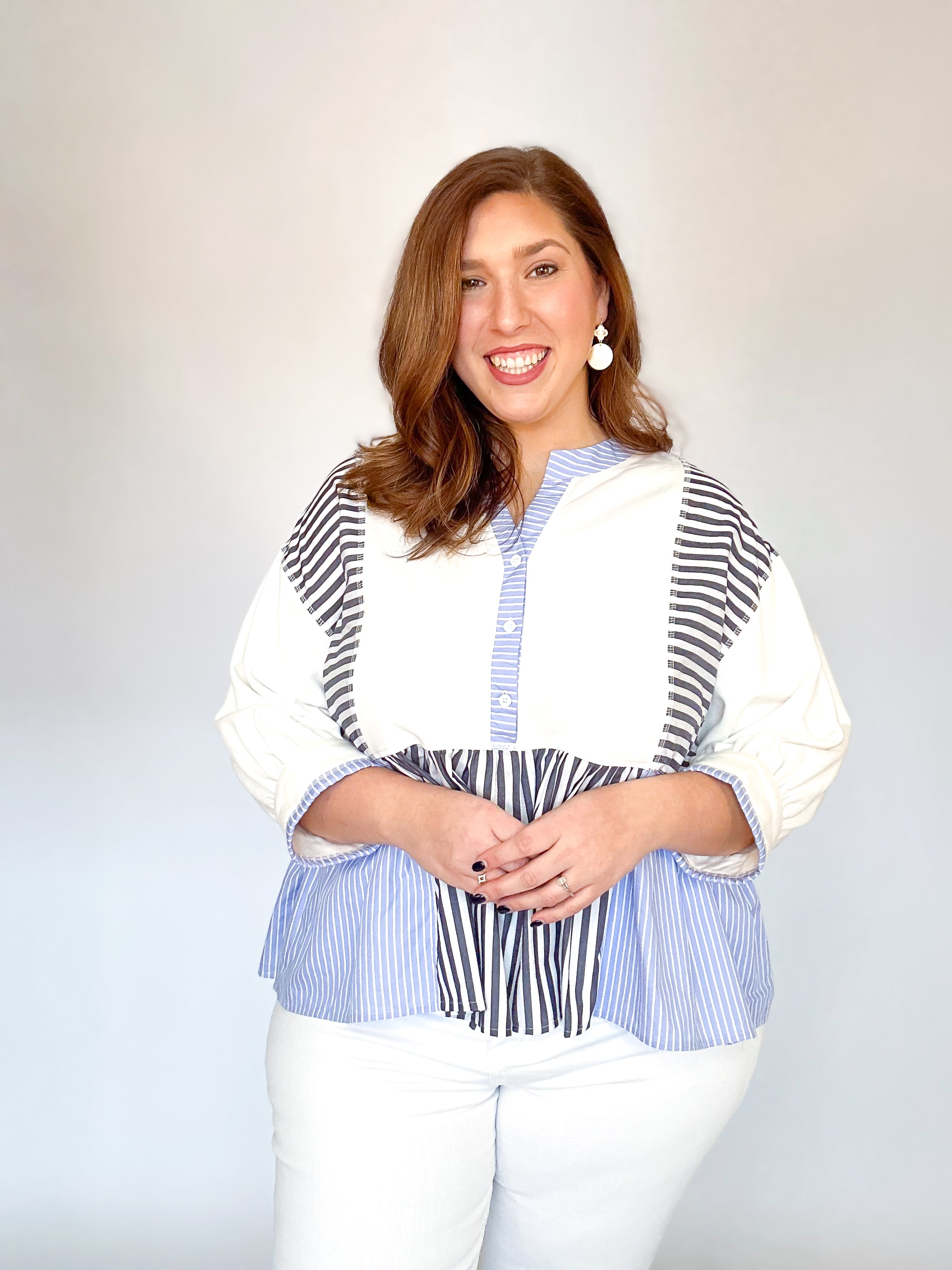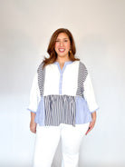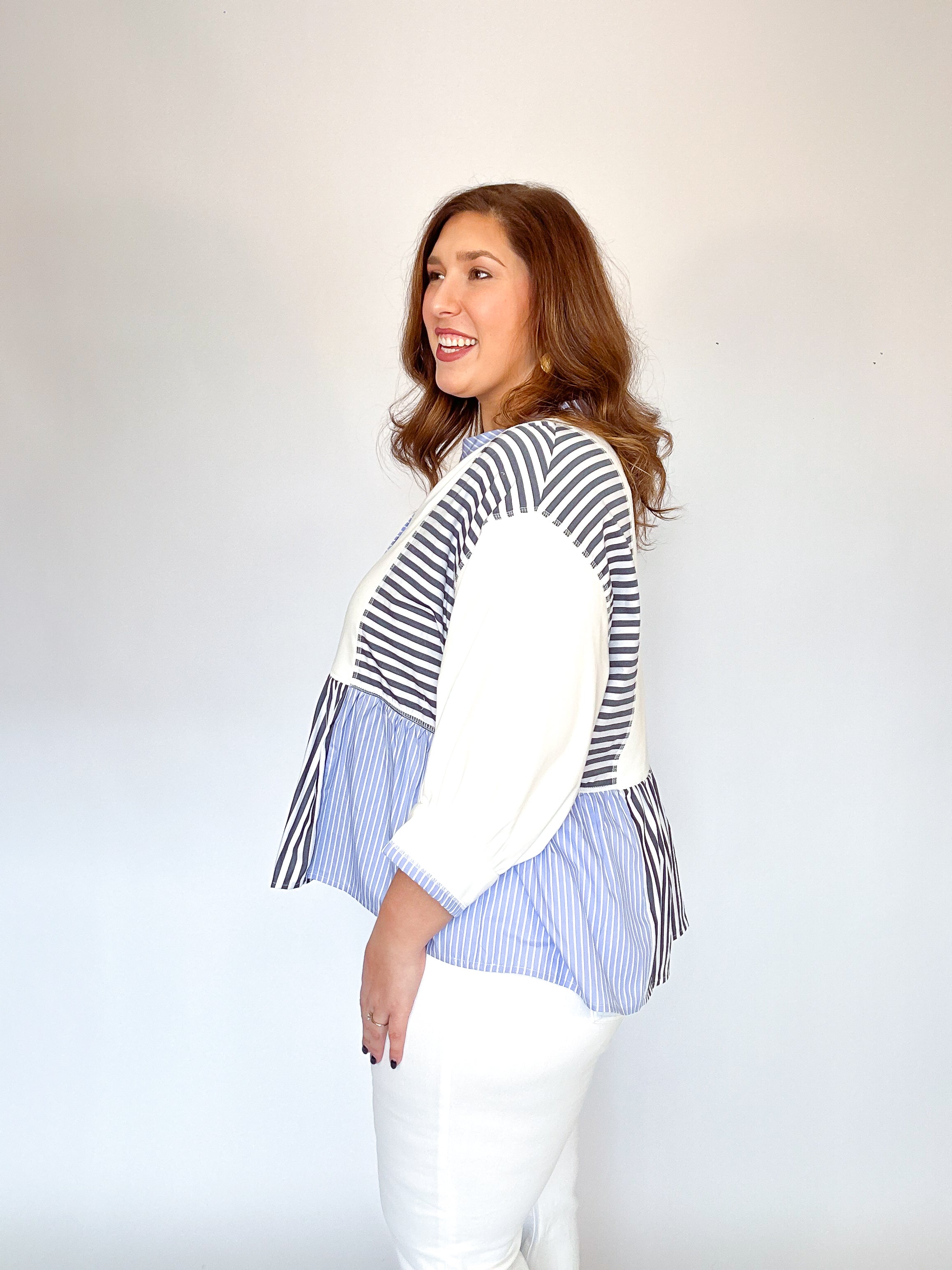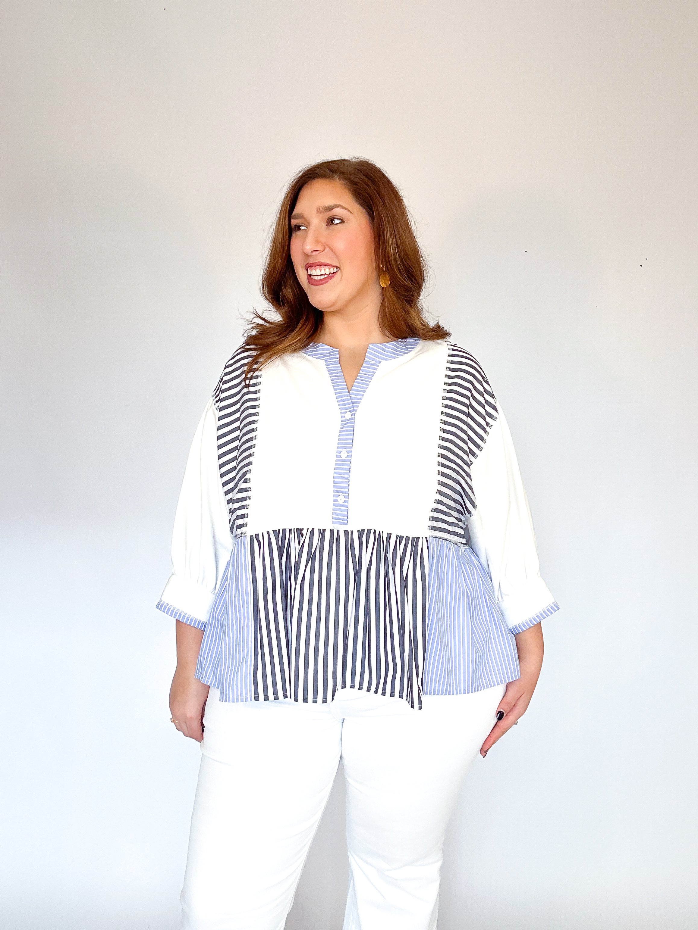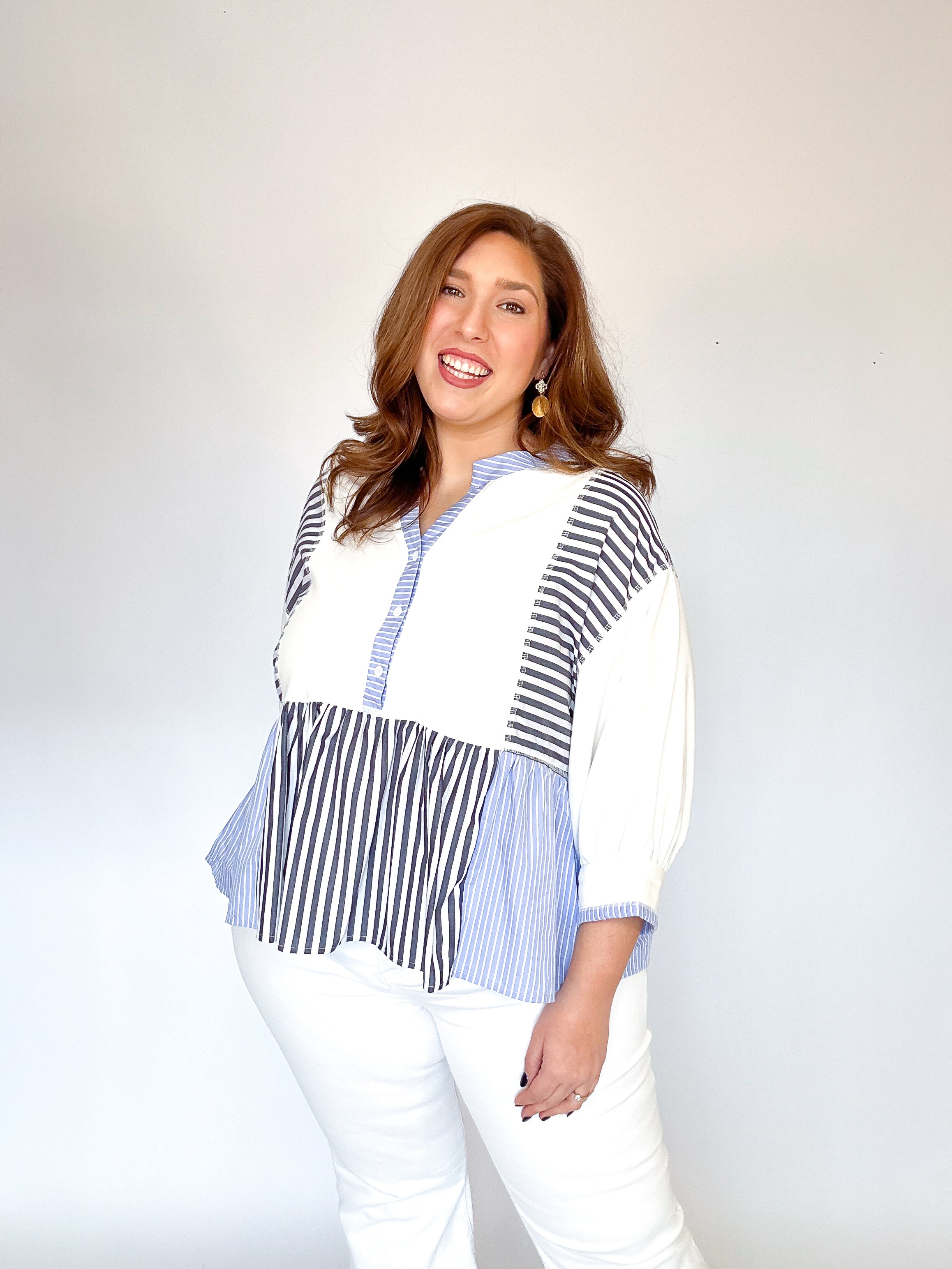 Color-block stripes meet modern design in this playful essential from Sew In Love. Mixed stripe panels create visual interest while the notched neckline with button detail adds a polished touch. A flowy peplum hem brings movement and dimension to the silhouette. Crafted from lightweight, breathable fabric, this top transitions seamlessly from casual days to relaxed evenings—effortless style that feels as good as it looks.