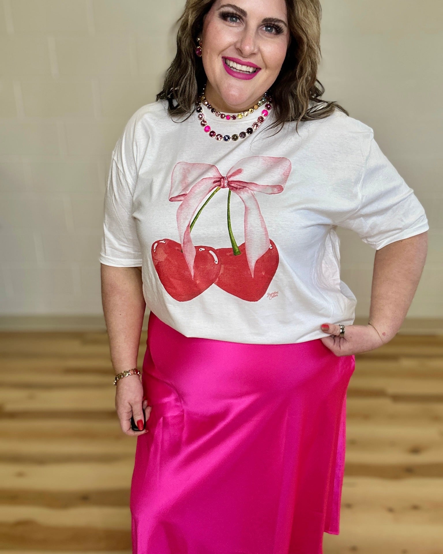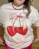 Rock a little sparkle and sweetness with this fun white tee! Featuring an adorable cherry design complete with a pink bow and shimmering rhinestone accents, it's the perfect way to add personality to your casual rotation.