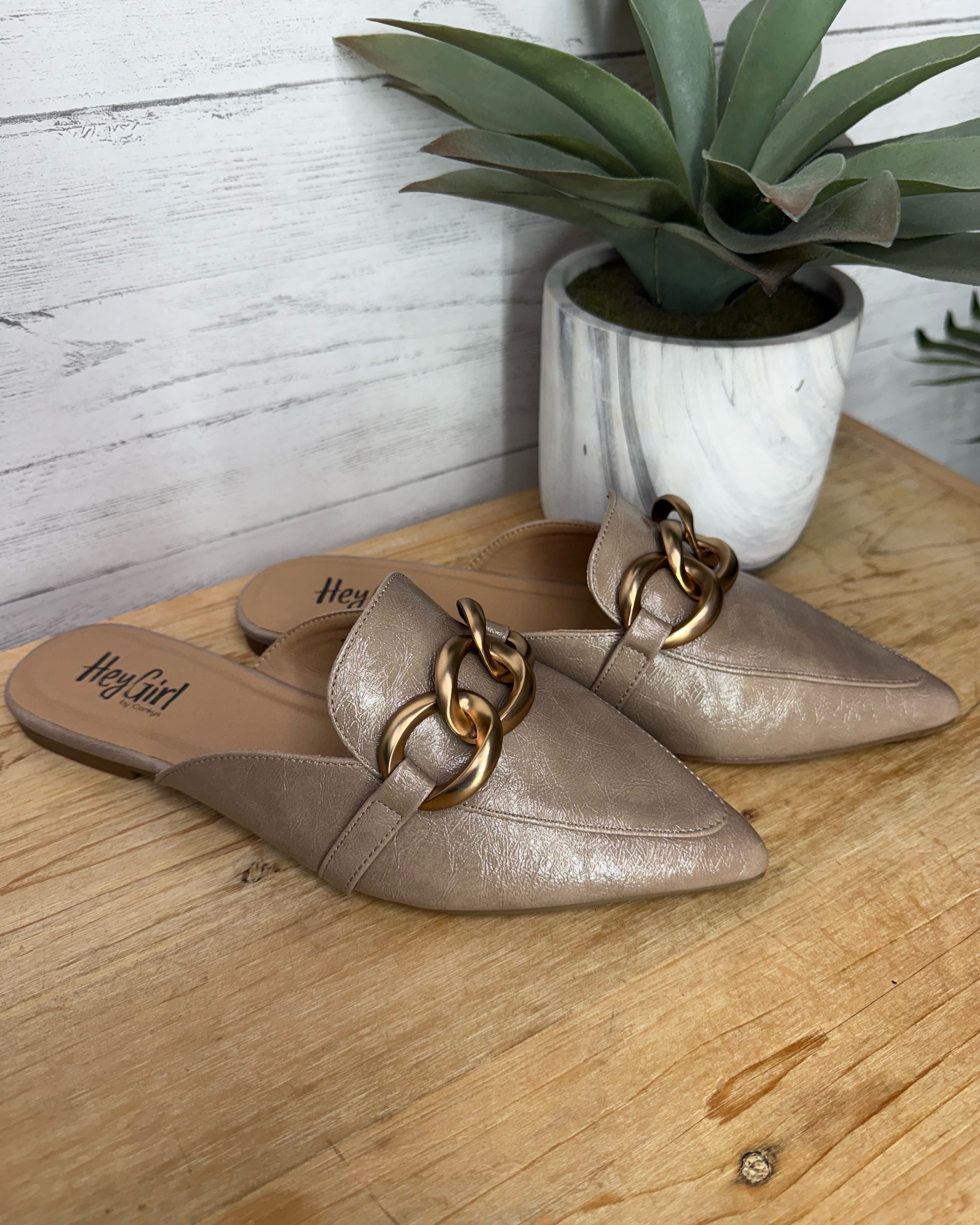 Step into effortless style with Corky's Playin’ For Keeps Mules in Taupe. Their soft, neutral shade makes pairing easy, while the bold oversized gold chain adds a playful twist. Perfect for the office, dinner, or weekend escapades, these mules bring polished charm without any fuss.
