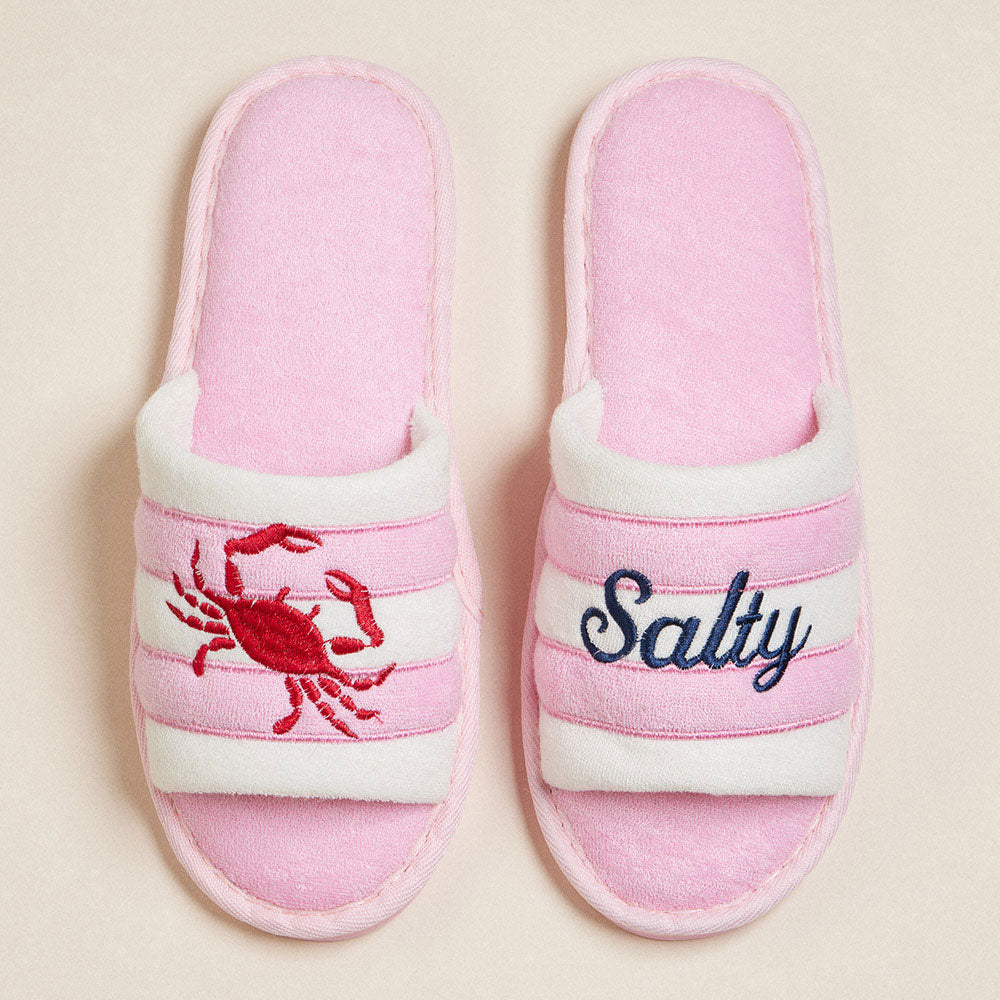 Step into comfort with our playful Crab Salty Embroidered Striped Slippers in Pink! These charming slippers feature adorable crab embroidery and cheerful stripes that add a splash of coastal fun to your loungewear. Soft, cozy, and perfect for padding around the house while showing off your beachy personality. Your feet will thank you!