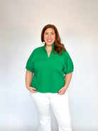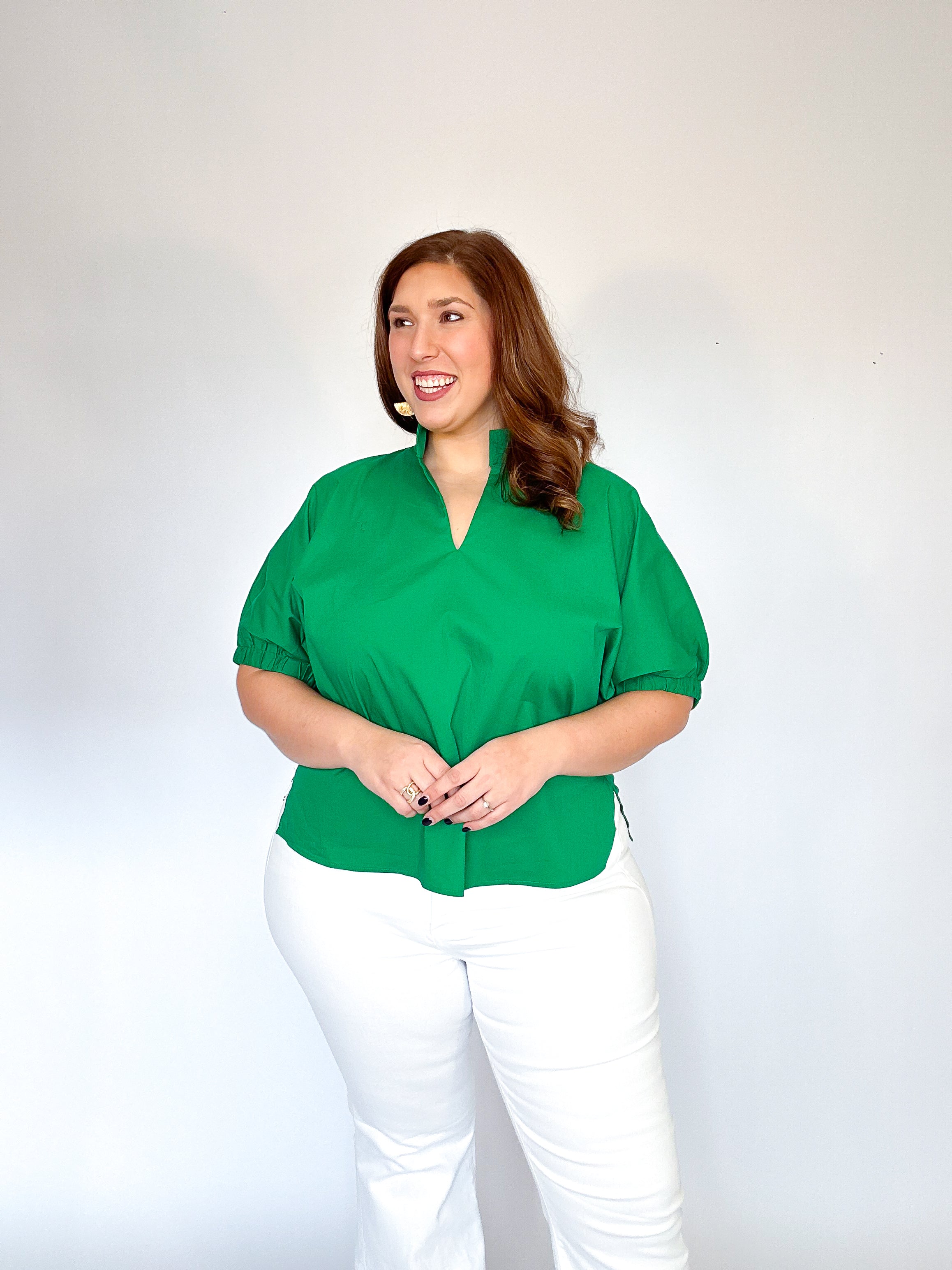 This Green Puff Sleeve Mock Neck Top from Entro combines structured silhouette with refined simplicity. The standing collar and V-neck create a modern neckline, while puff sleeves add dimension without bulk. Crafted from lightweight woven fabric that's non-sheer and unlined, this piece offers breathable comfort and versatile layering potential. A polished essential for contemporary wardrobes.