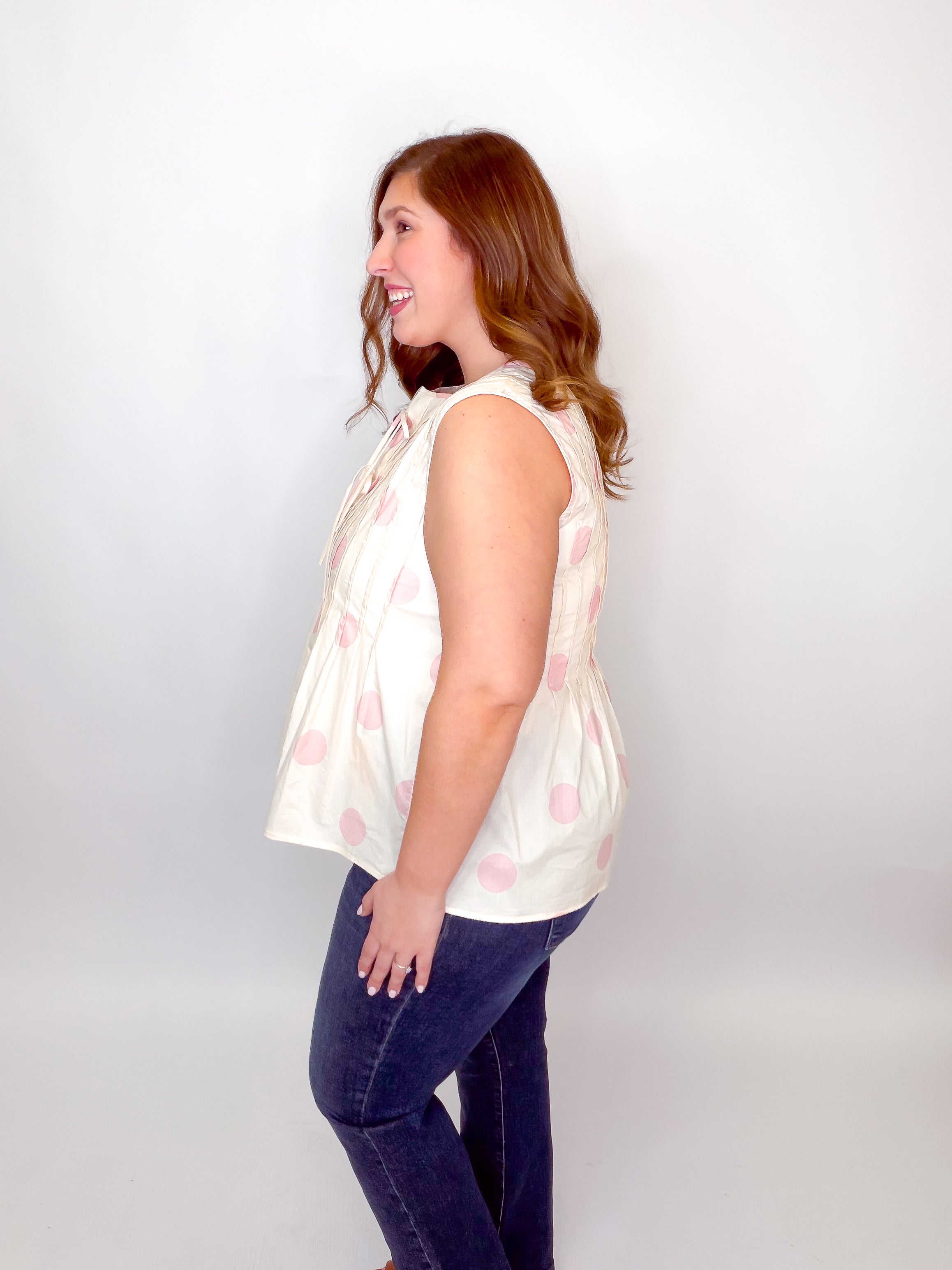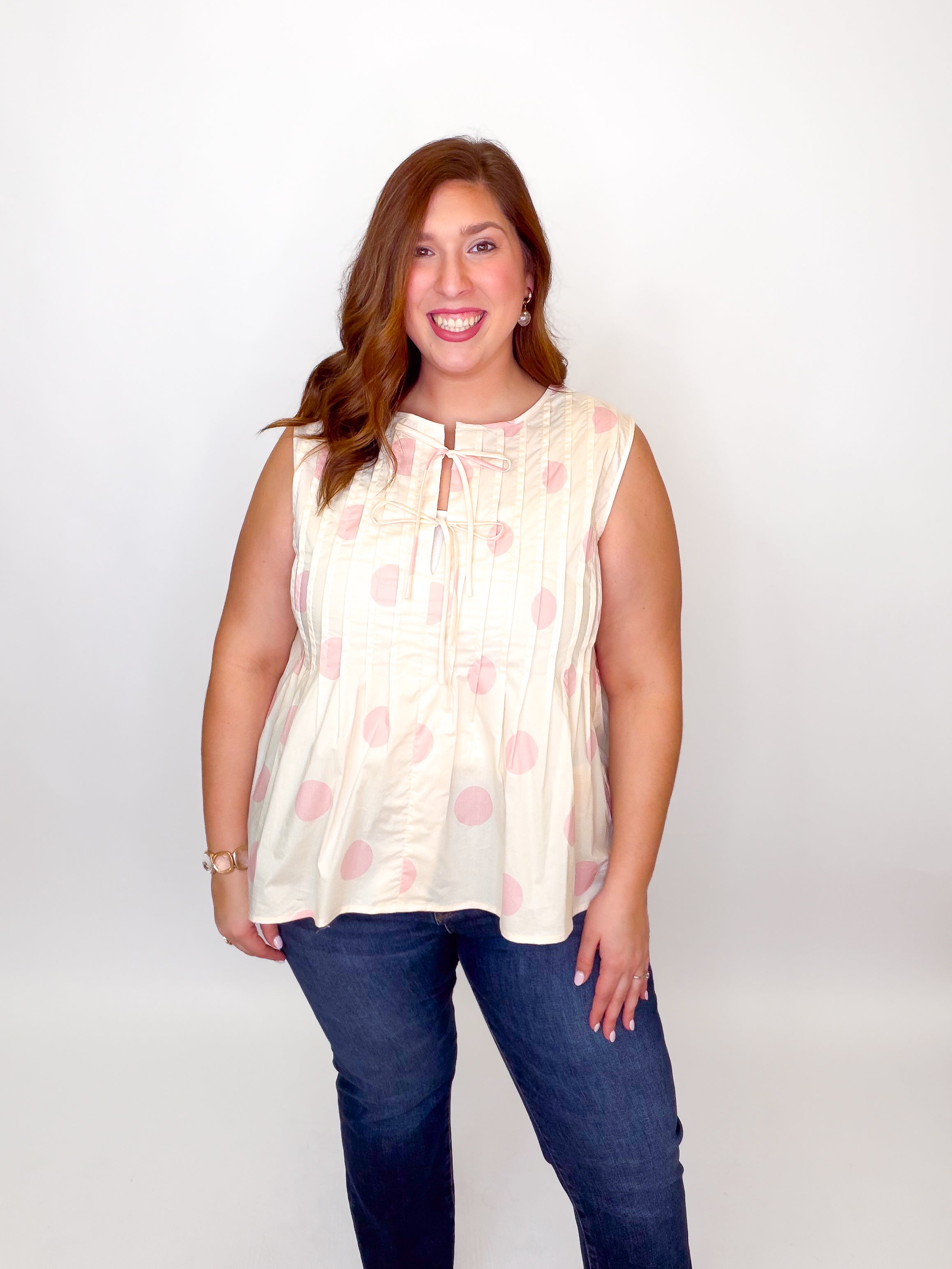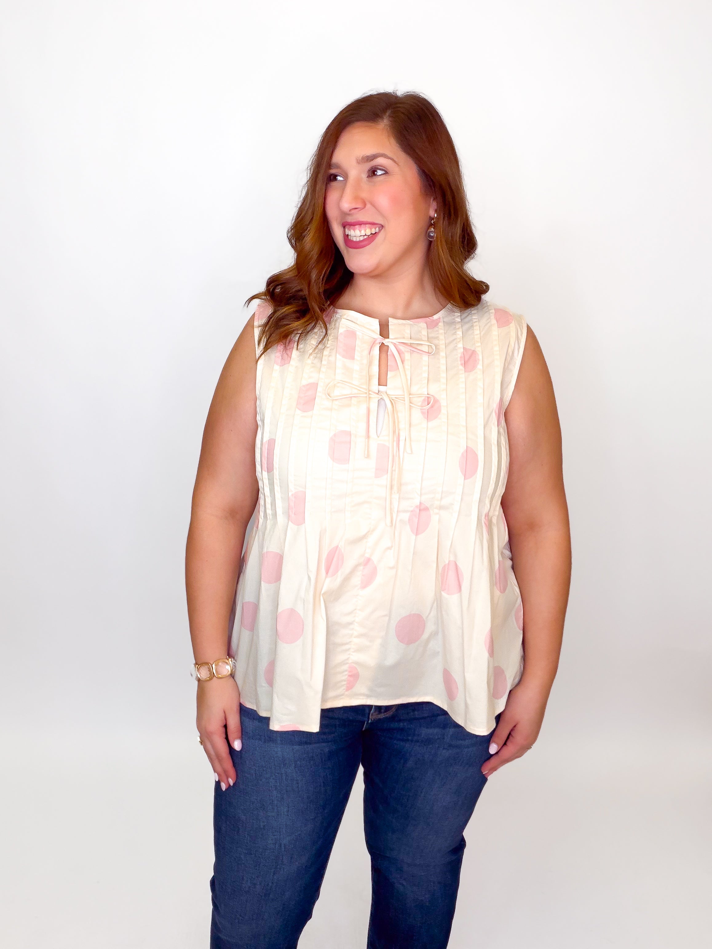 Effortless elegance meets playful style in this ivory and pink polka dot sleeveless blouse from Oddi. The tie-front neckline adds a refined touch, while the relaxed fit and pleated silhouette create a flattering, comfortable drape. Perfect for layering or wearing solo, this versatile piece transitions seamlessly from casual weekday wear to weekend gatherings. A timeless pattern with modern construction—a wardrobe essential that balances sophistication with understated charm.