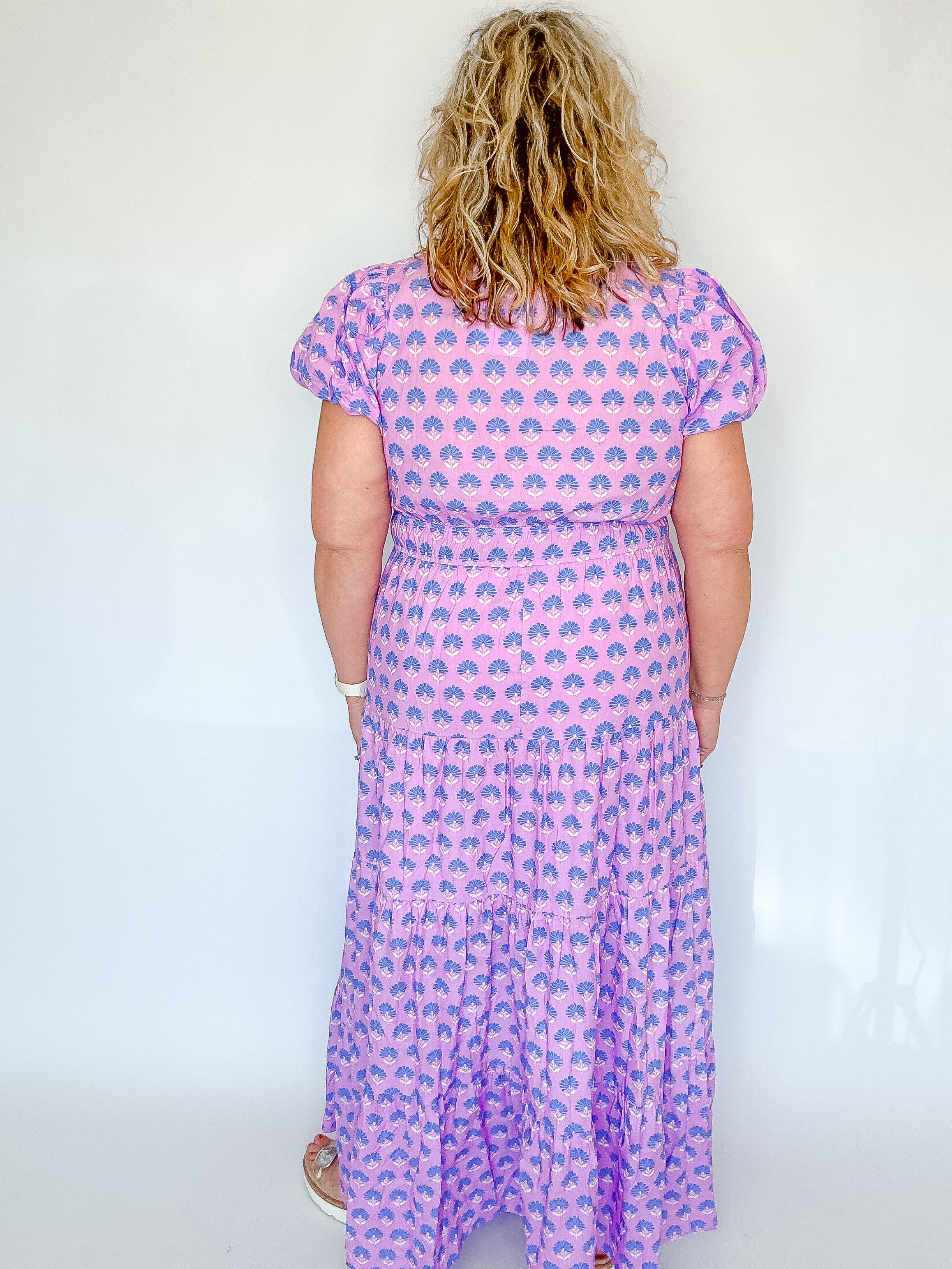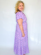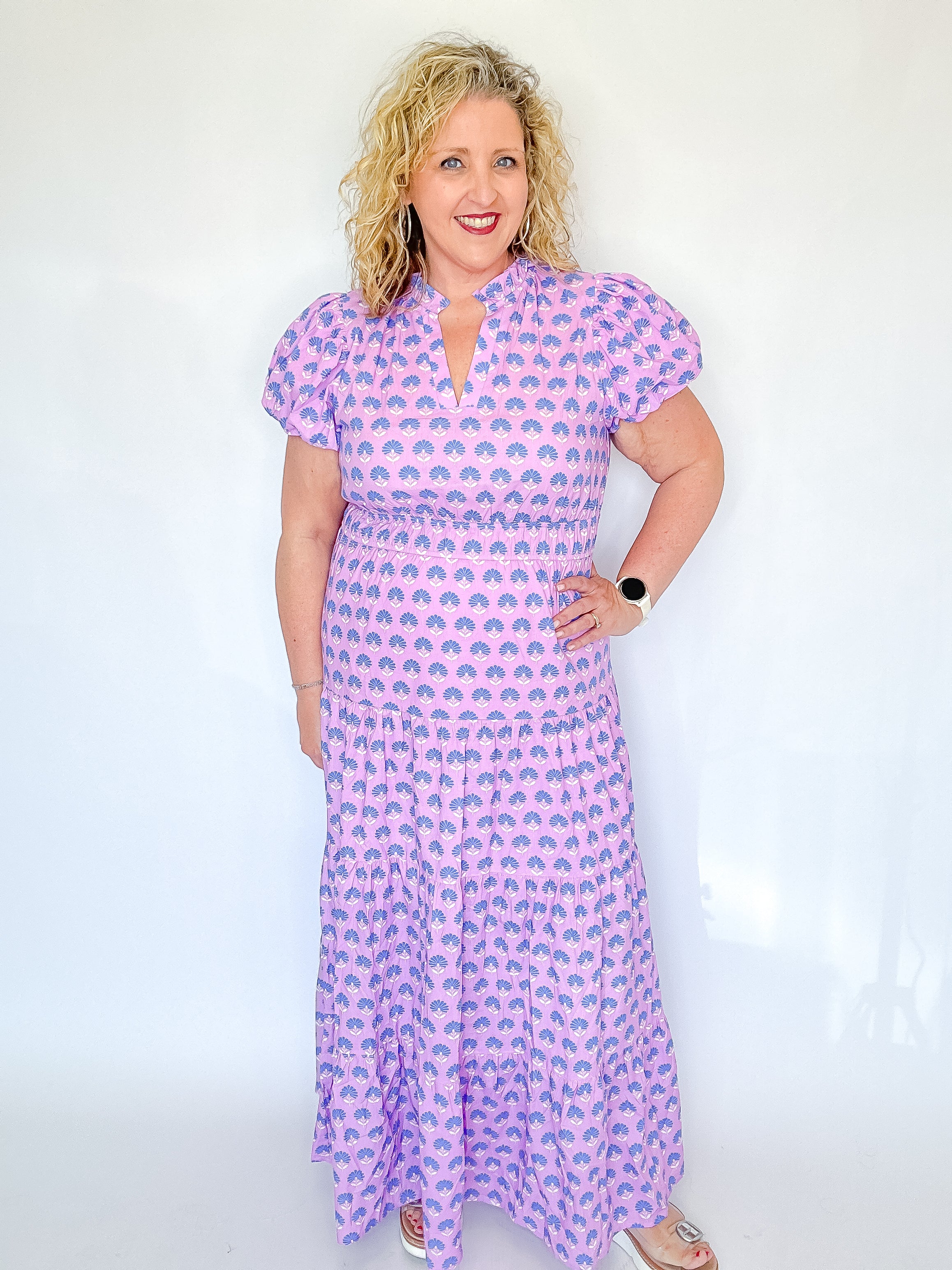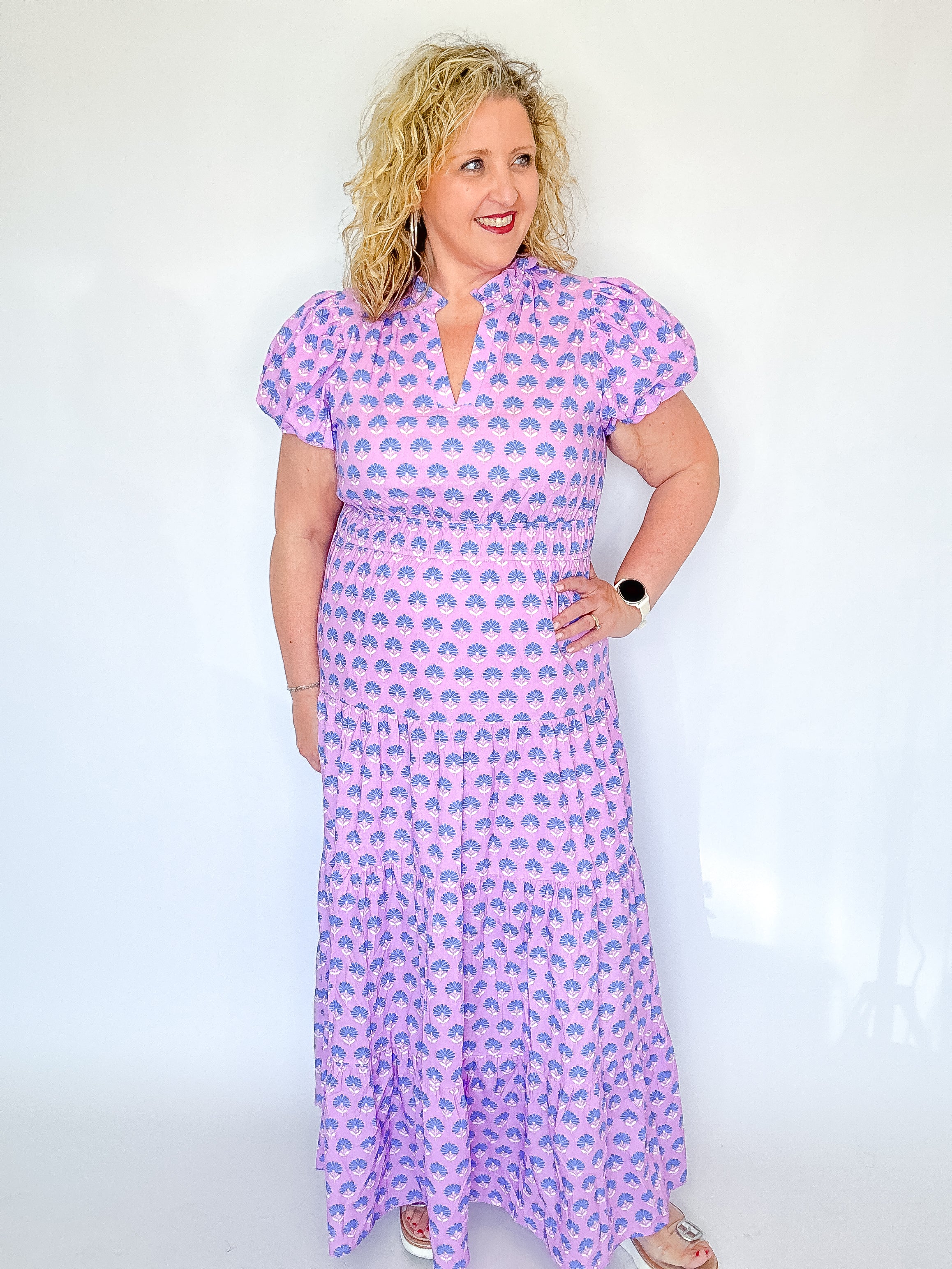 Bright, playful, and made for sunny days. This lavender midi dress features a charming blue floral allover print, a flattering V-neckline, and balloon cap sleeves for a soft, feminine touch. The smock waist creates a comfortable, defined fit, while the tiered skirt adds flow and movement with every step. Lightweight and breezy - perfect for brunch, vacations, baby showers, or casual summer events.