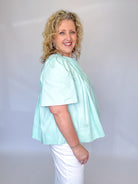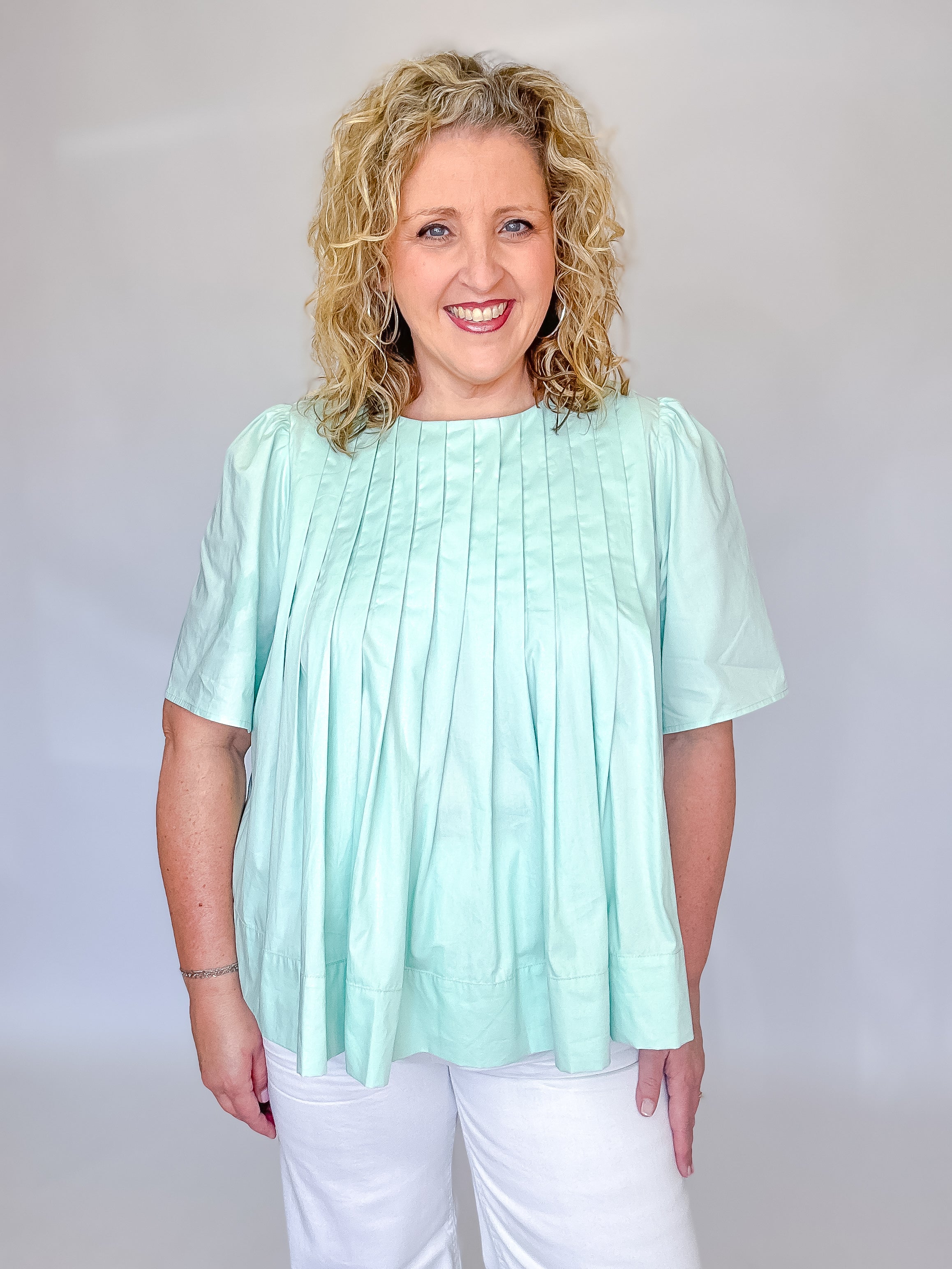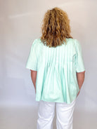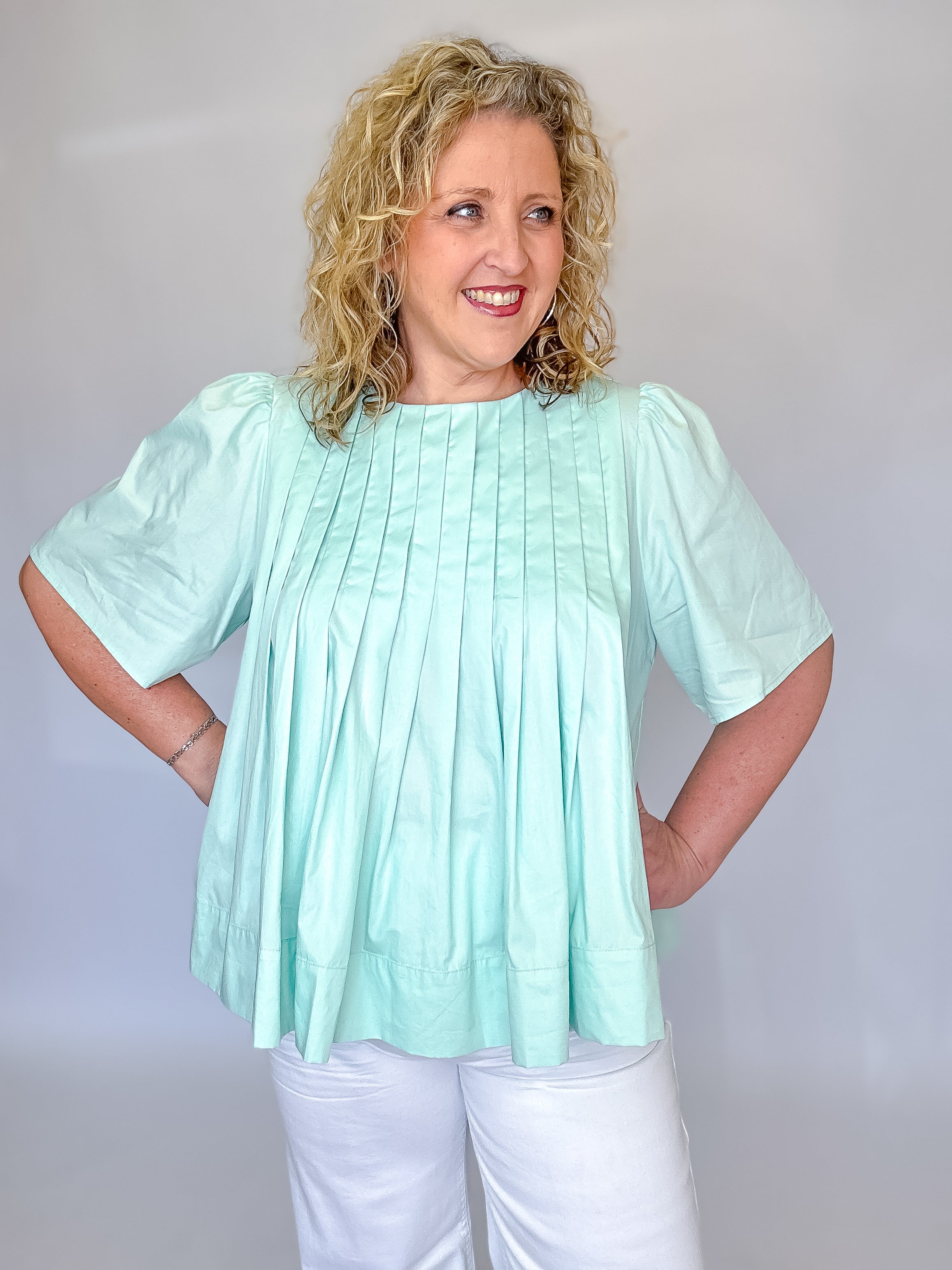 Elevate your everyday wardrobe with this sophisticated poplin top from Oddi. The structured pleated front panel creates visual interest and dimension, while the round neckline offers a flattering, versatile silhouette. Wide elbow-length sleeves provide an effortless, modern aesthetic that works seamlessly from office to weekend. Crafted in crisp poplin fabric, this mint-hued piece pairs beautifully with tailored trousers, denim, or skirts for endless styling possibilities.