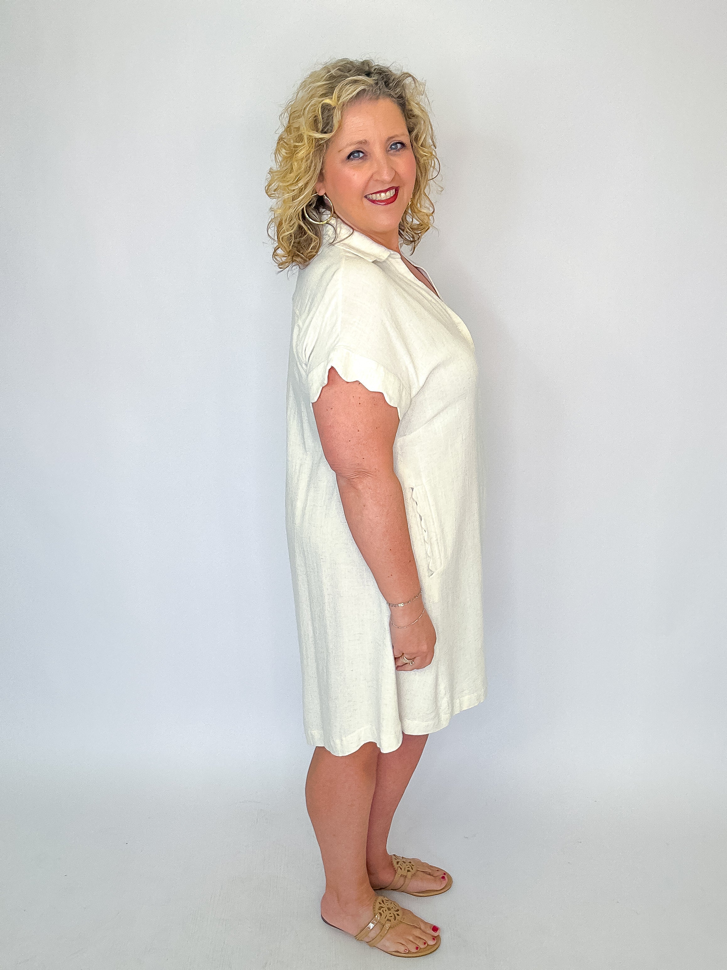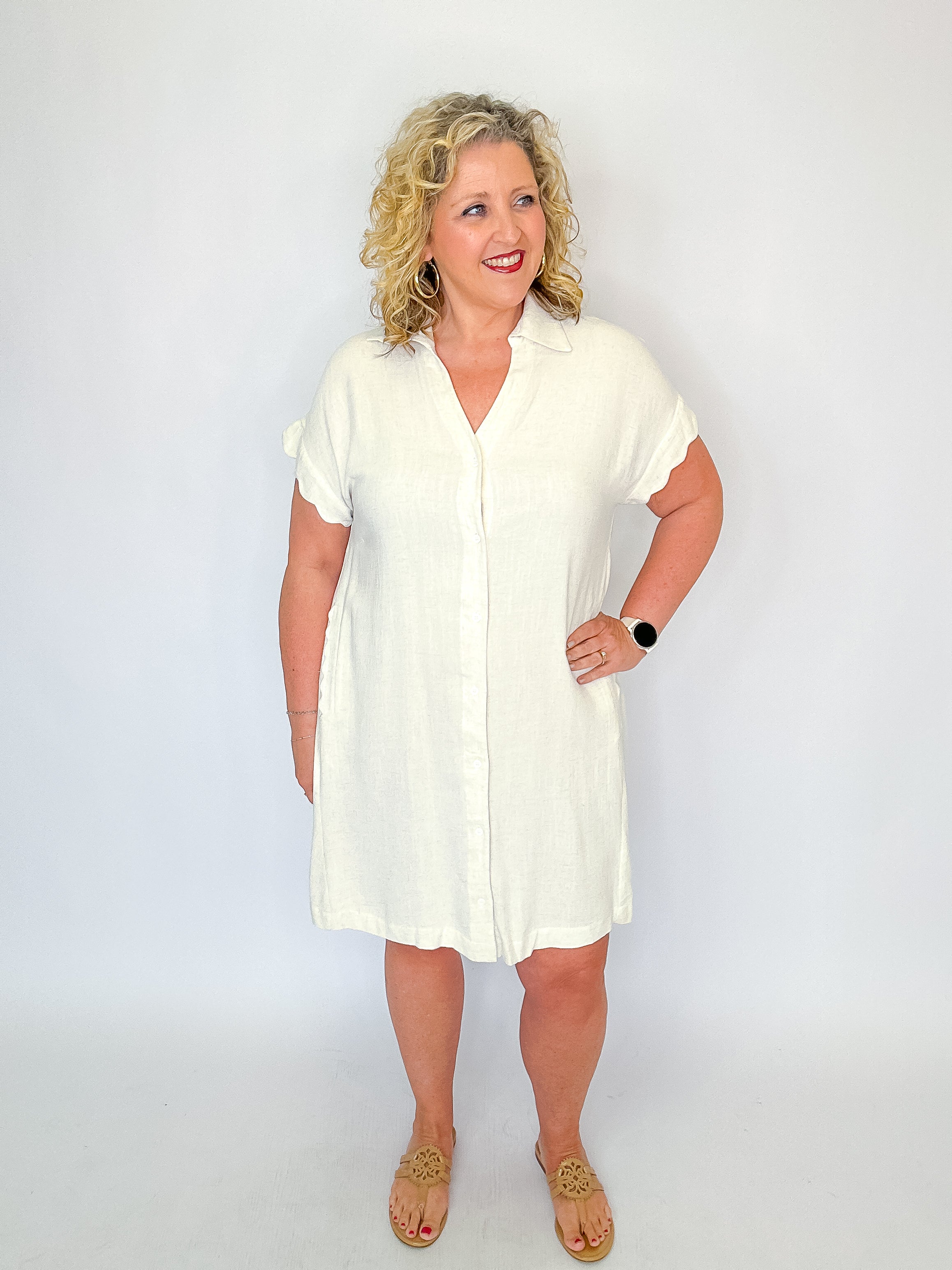 Effortlessly polished and perfect for warm days, our Linen Scallop Sleeve Button-Down Dress blends timeless tailoring with feminine detail. Crafted from breathable linen, this easy A-line silhouette drapes beautifully for a relaxed yet flattering fit.