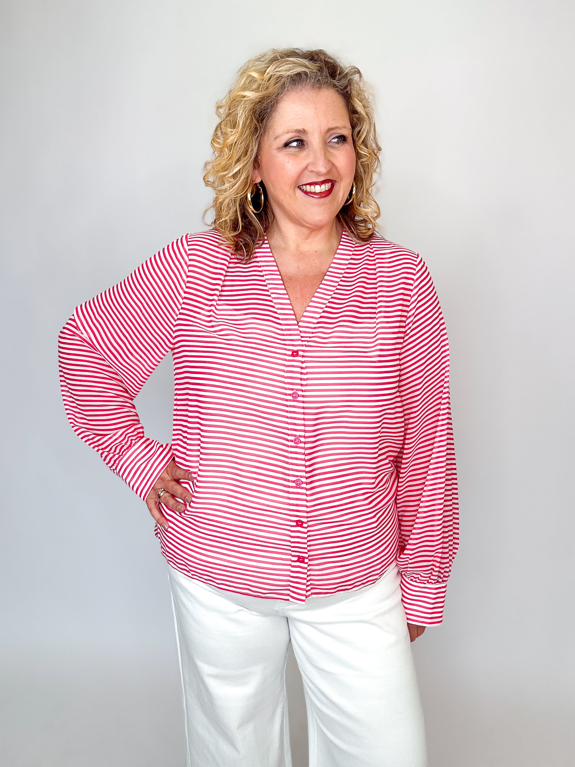 Effortlessly chic and versatile, this lightweight striped blouse combines timeless style with everyday comfort. The relaxed fit and soft drape create a flattering silhouette that moves with you, while the classic button-front closure adds polished detail. Perfect for layering or wearing solo, this piece transitions seamlessly from office to weekend, making it an essential addition to any wardrobe.