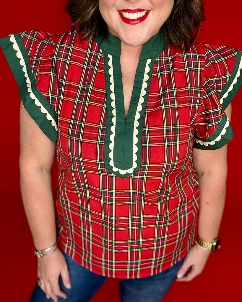 This playful Red Plaid Scallop Trim Top by Entro features flutter sleeves and a charming scallop trim that adds a flirty touch. The contrast V-neck with a caftan-inspired band brings a unique twist to this lightweight, woven design. Unlined yet non-sheer, it offers comfortable wear with a breezy feel perfect for casual days.