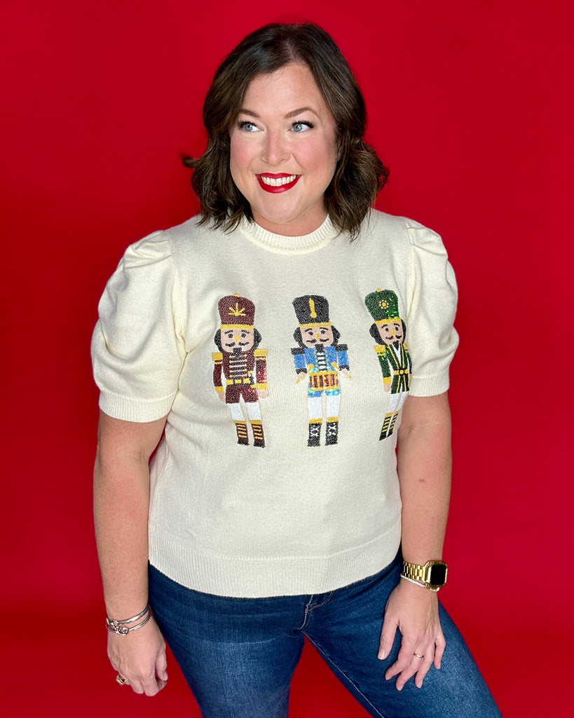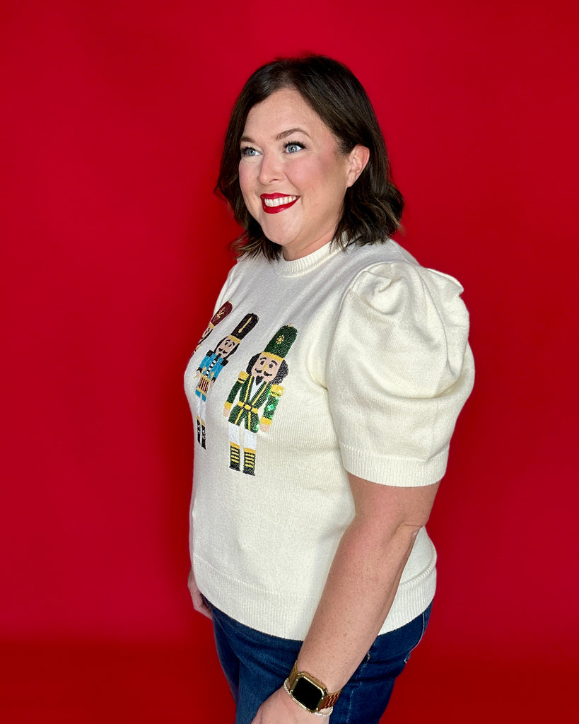 This half sleeve sweater top from Sew In Love features intricate sequin patches inspired by the Nutcracker theme. Designed to blend festive elegance with comfortable wearability, its unique embellishments add a sophisticated sparkle, making it ideal for holiday gatherings or stylish casual occasions. The half sleeves offer versatility across seasons, while the quality fabric ensures a flattering fit and lasting comfort.