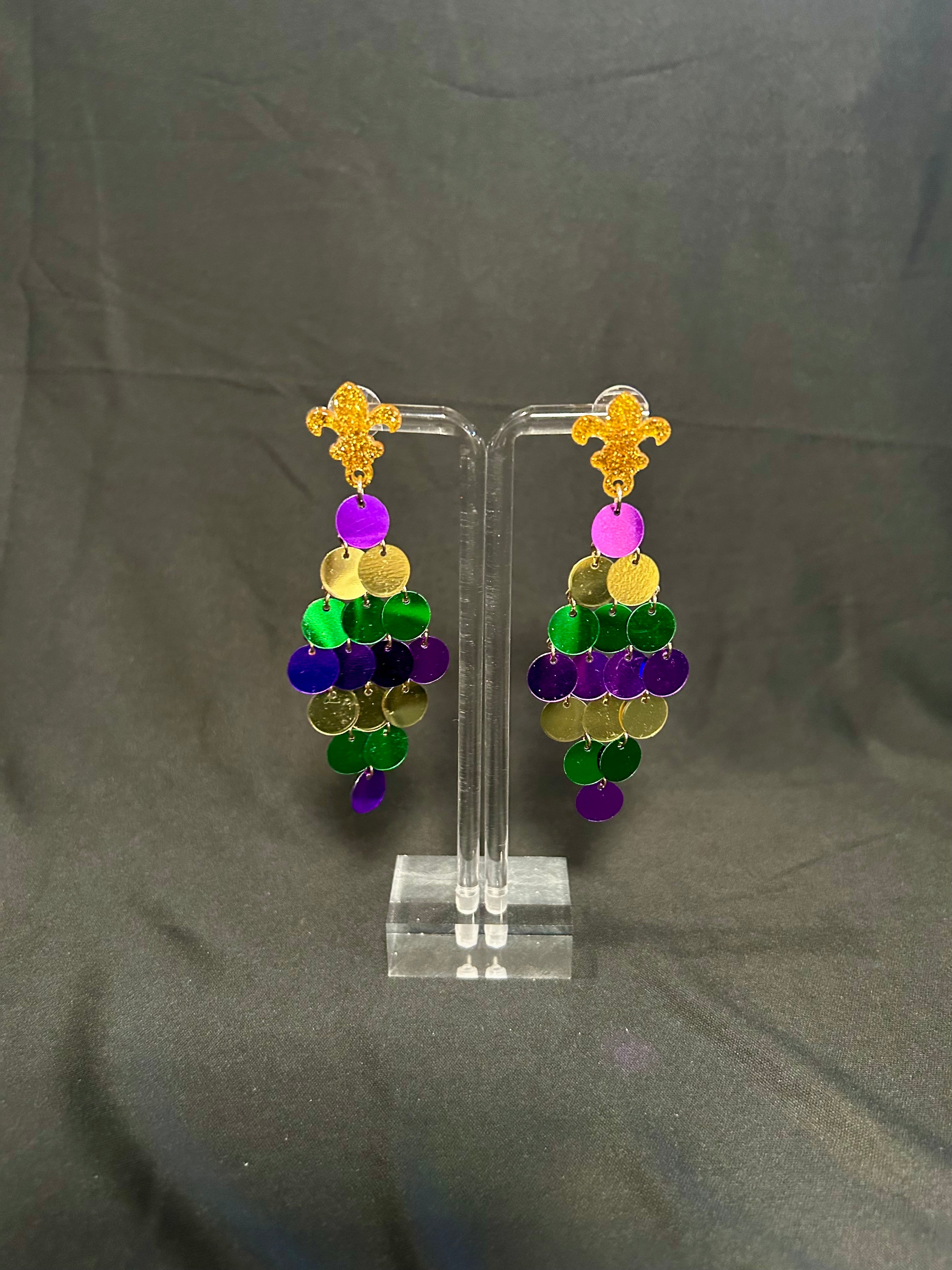 Mardi Gras Glitter Fleur De Lis Sequin Chandelier Earrings