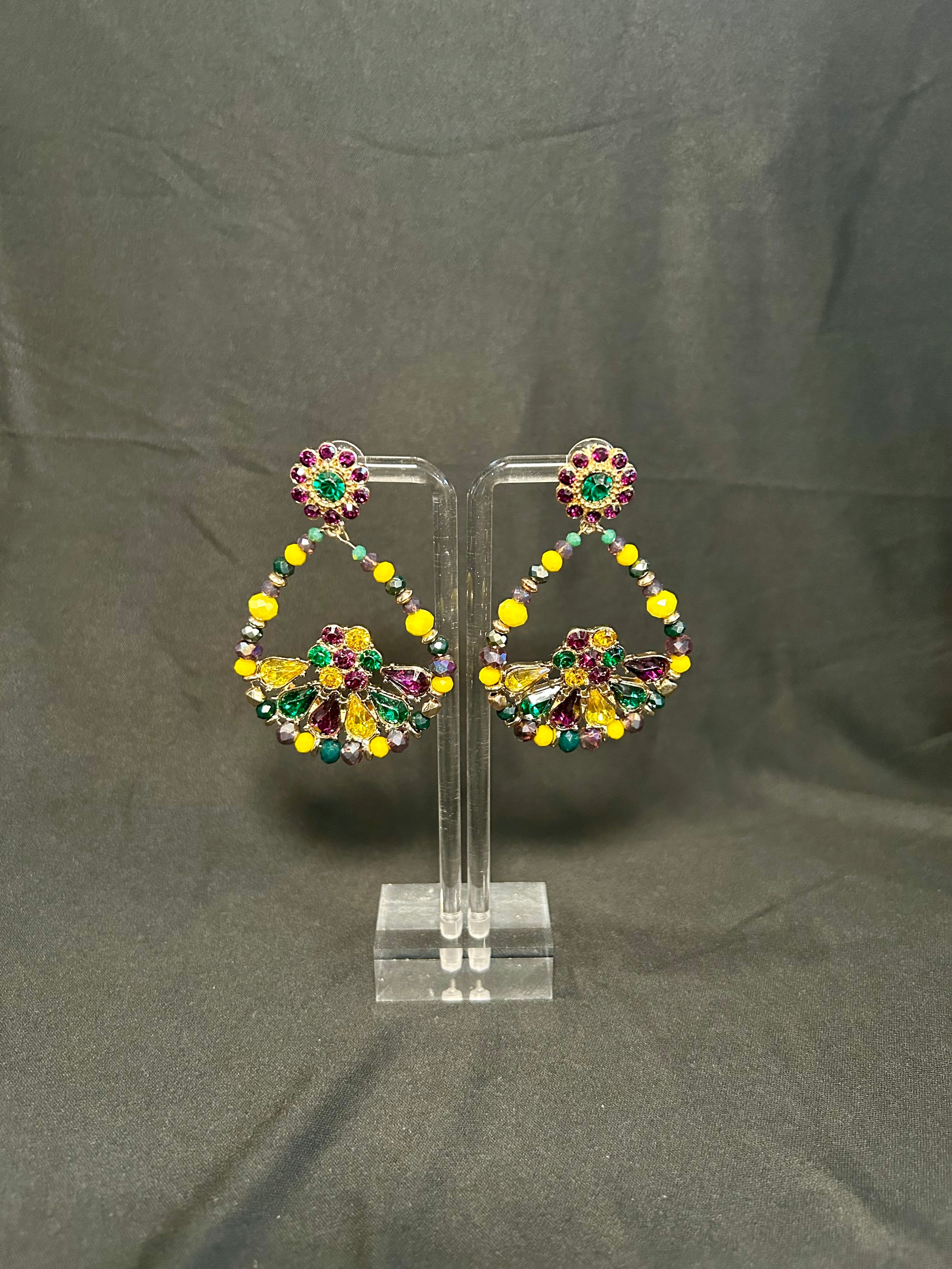 Mardi Gras Multi Stone Dangle Evening Earrings, these stunning pair feature large and small stones delicately placed in a dangle design. Crafted with quality materials, these earrings are designed to make a sophisticated style statement for a special event. Appear in style at Mardi Gras event or any special occasion with these. Size : 1.75" X 2.75"